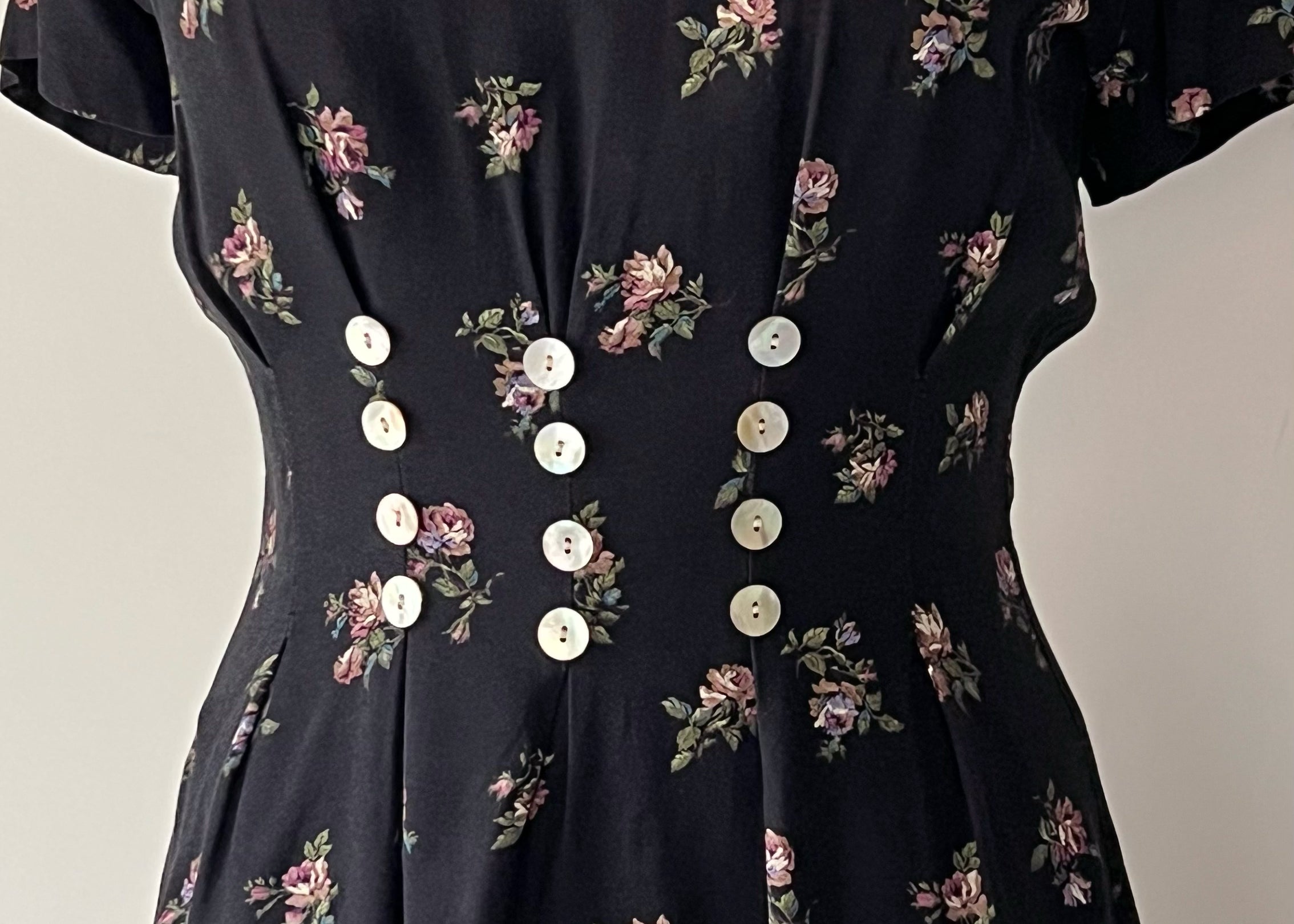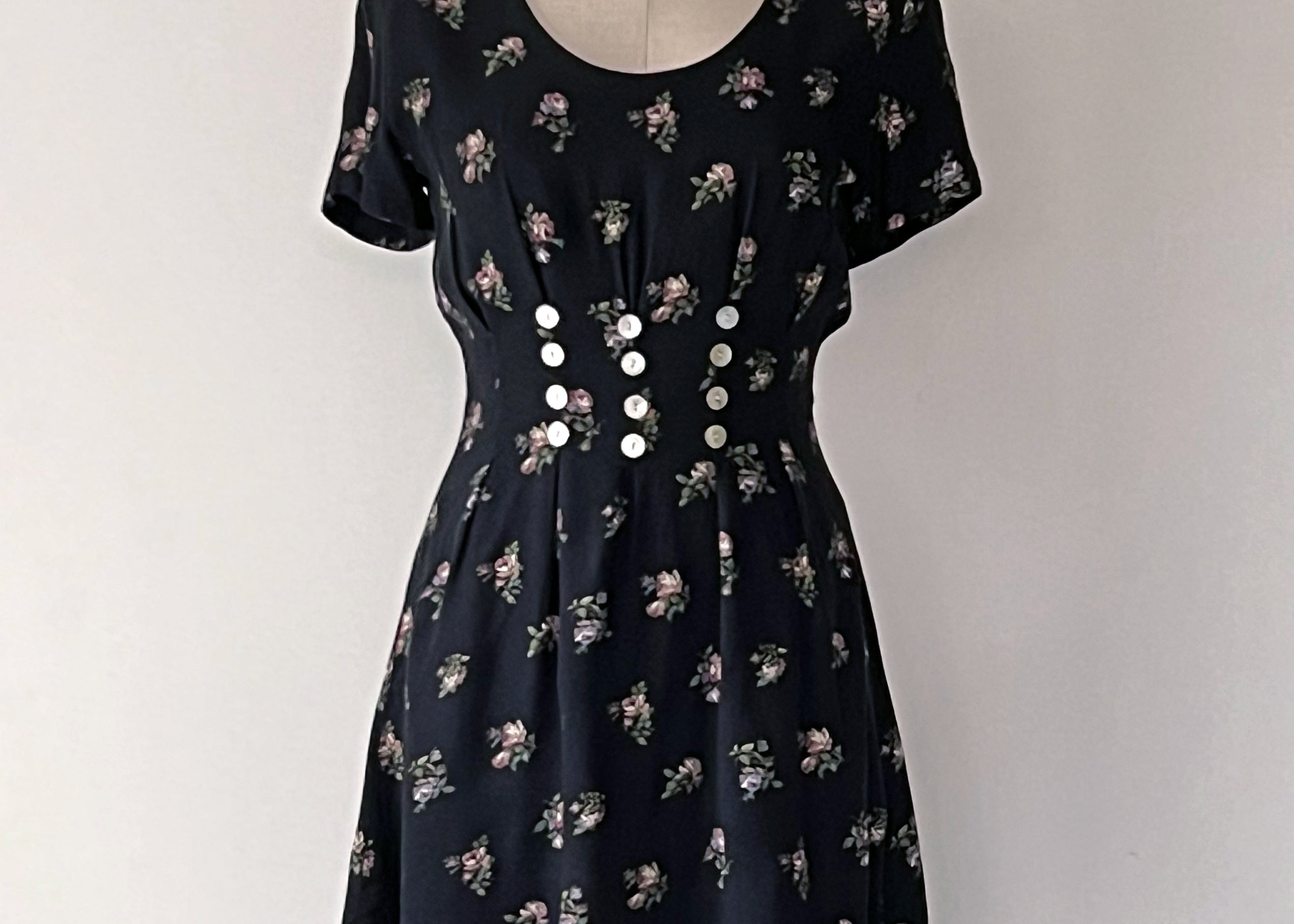 Vintage 1990s Pleated + Buttoned Dark Floral Cottagecore Dress