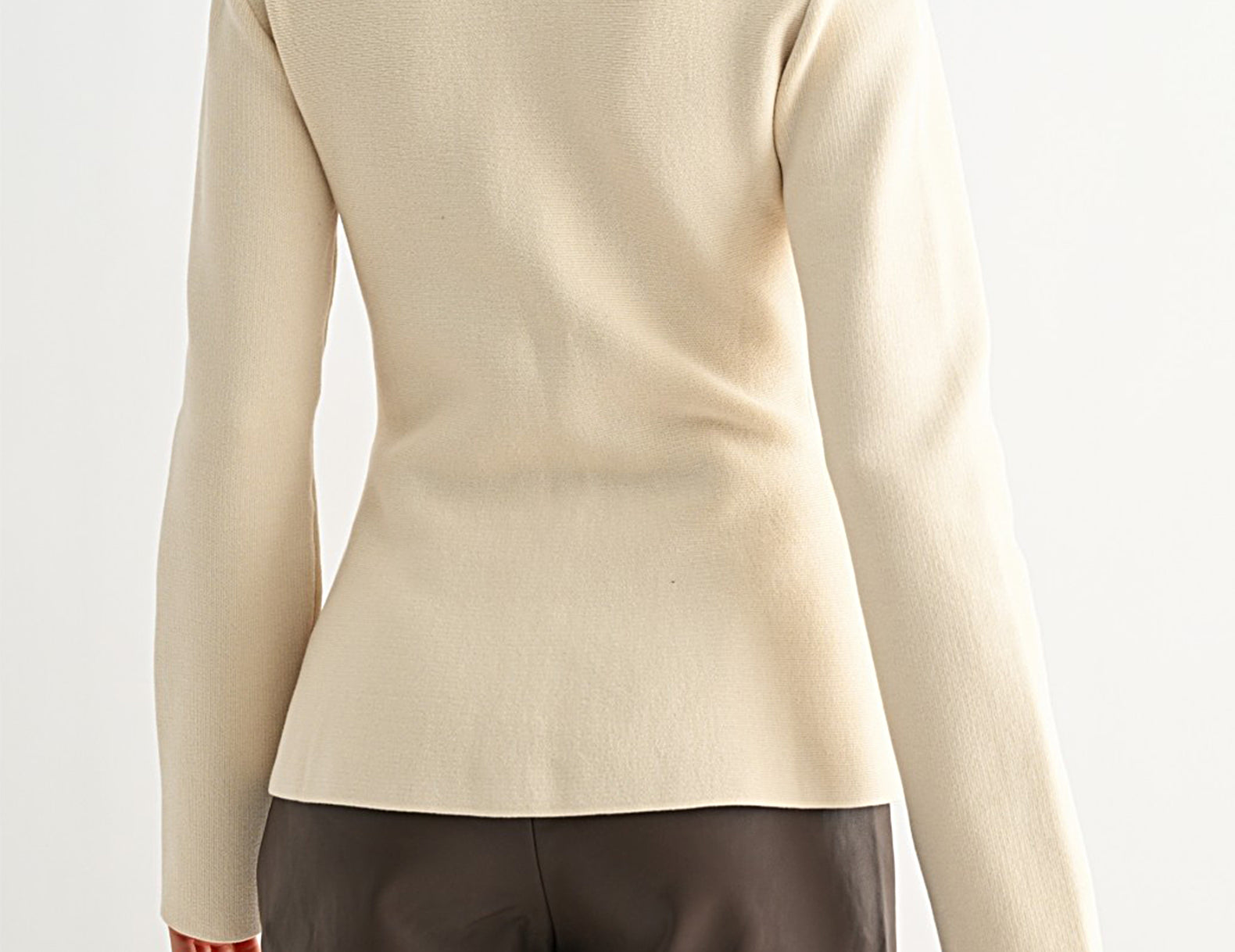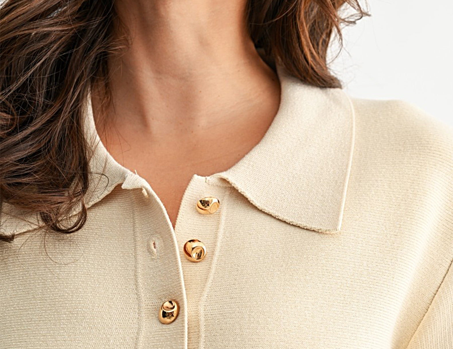 In a structured, ponte, ivory knit punctuated with round, gold buttons down the front, the Ainsley top is an elevated classic. This top is cut from a weighted, fine rib knit with long sleeves, a curved silhouette, and finished with a collared neckline. Pair Ainsley with washed denim and pointed boots, or make it dressy with a pencil skirt and kitten heels.