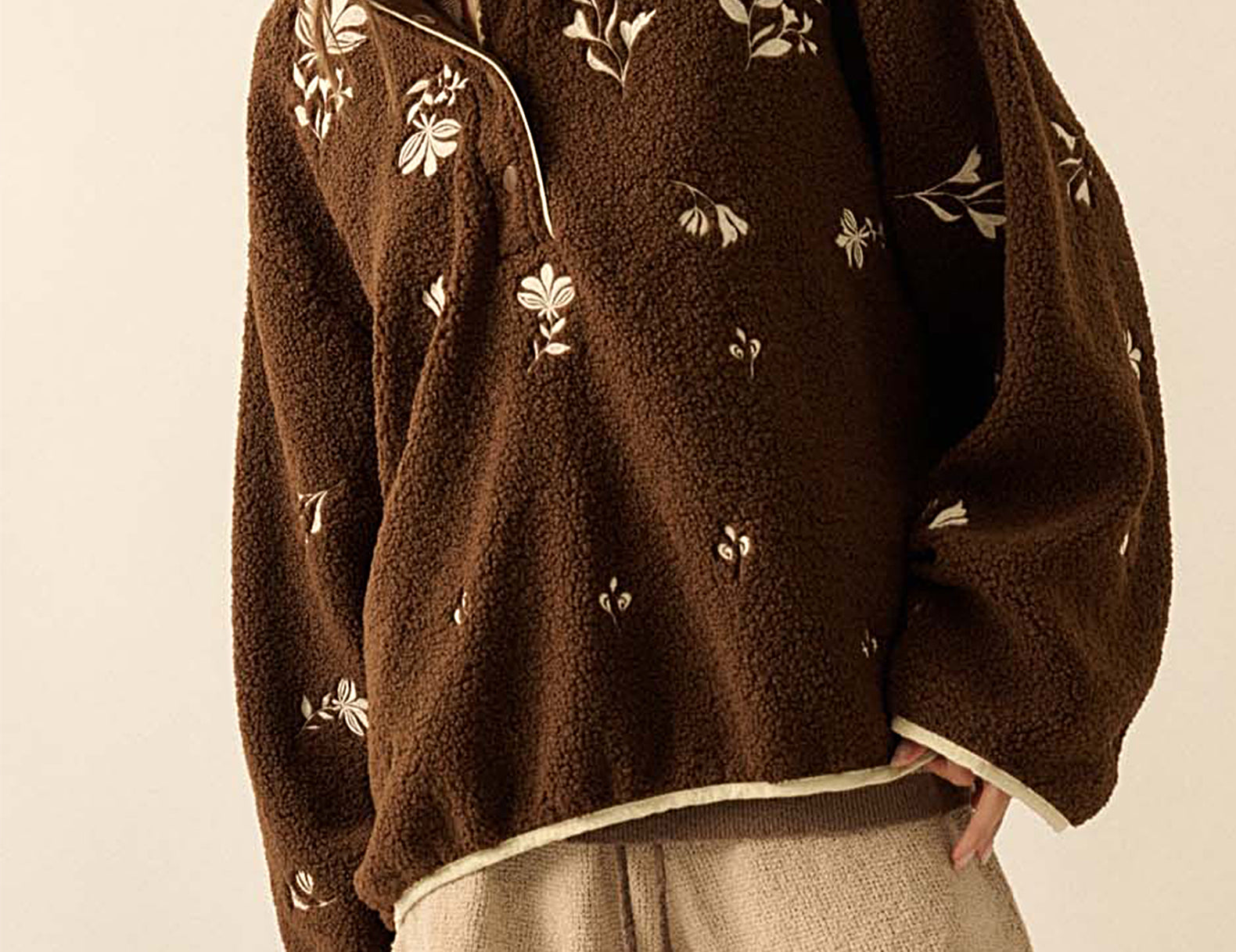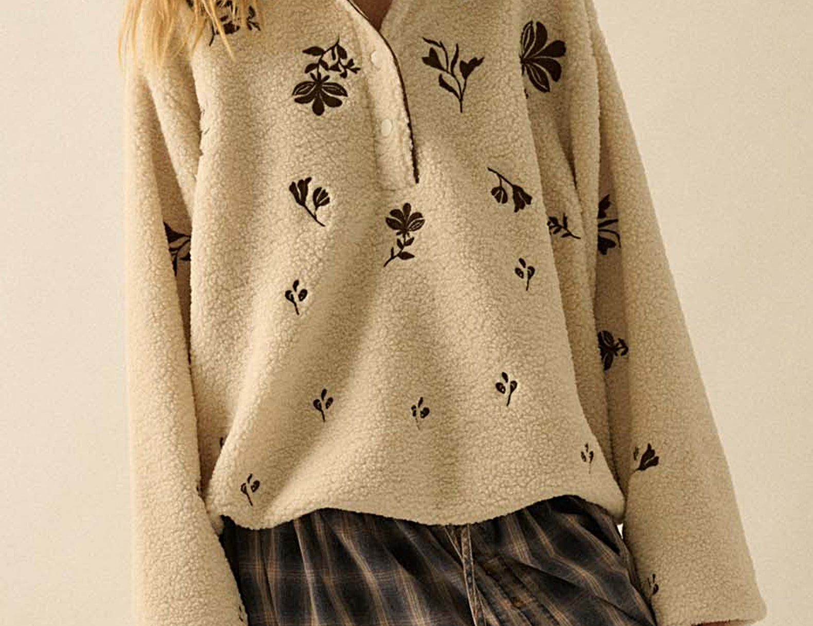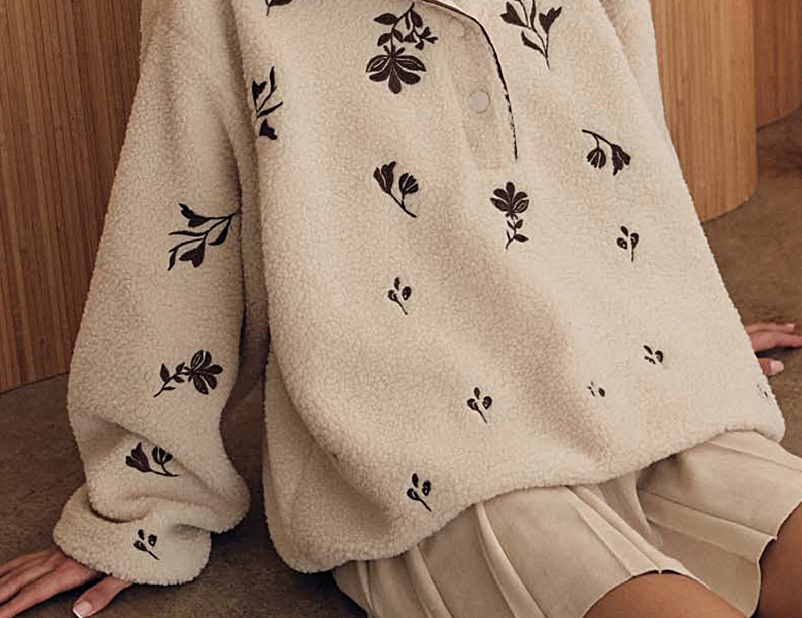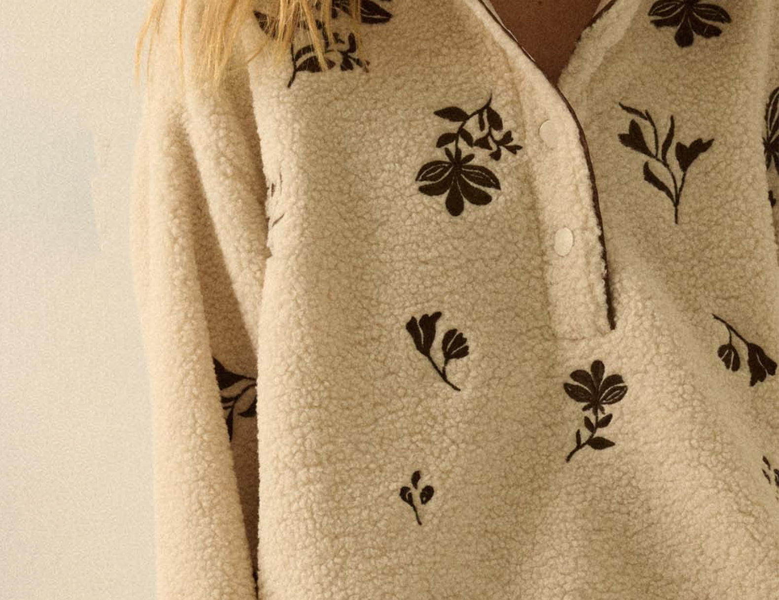 Fleece, but make it charming. The ultra-cozy Alexis pull-over features a half snap-up placket and a tall, foldable collar. The fit is oversized and roomy. Trimmed with a contrast binding at the hem, collar, and cuffs, and dappled with embroidered florals of varying sizes, this cute and casual layer is an easy go-to for running errands, morning walks, and backyard BBQs.