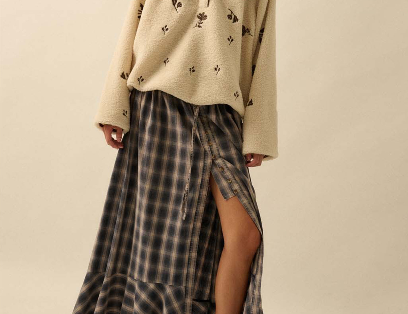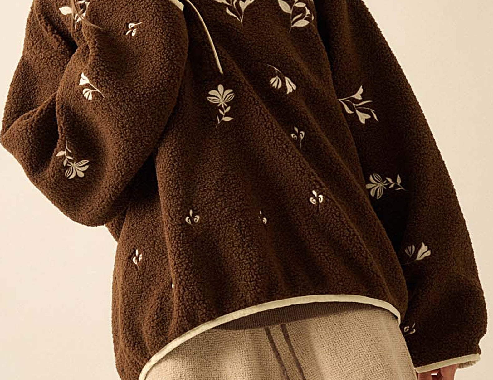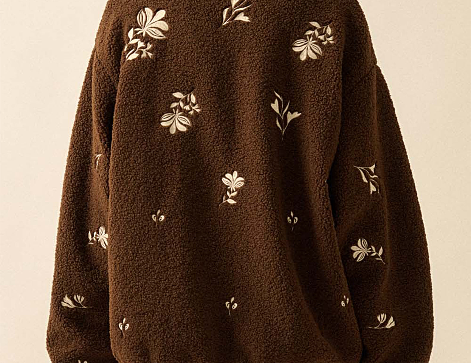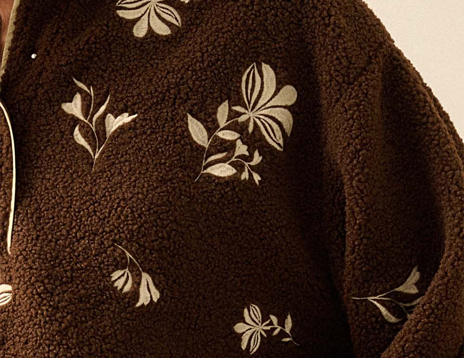 Fleece, but make it charming. The ultra-cozy Alexis pull-over features a half snap-up placket and a tall, foldable collar. The fit is oversized and roomy. Trimmed with a contrast binding at the hem, collar, and cuffs, and dappled with embroidered florals of varying sizes, this cute and casual layer is an easy go-to for running errands, morning walks, and backyard BBQs.