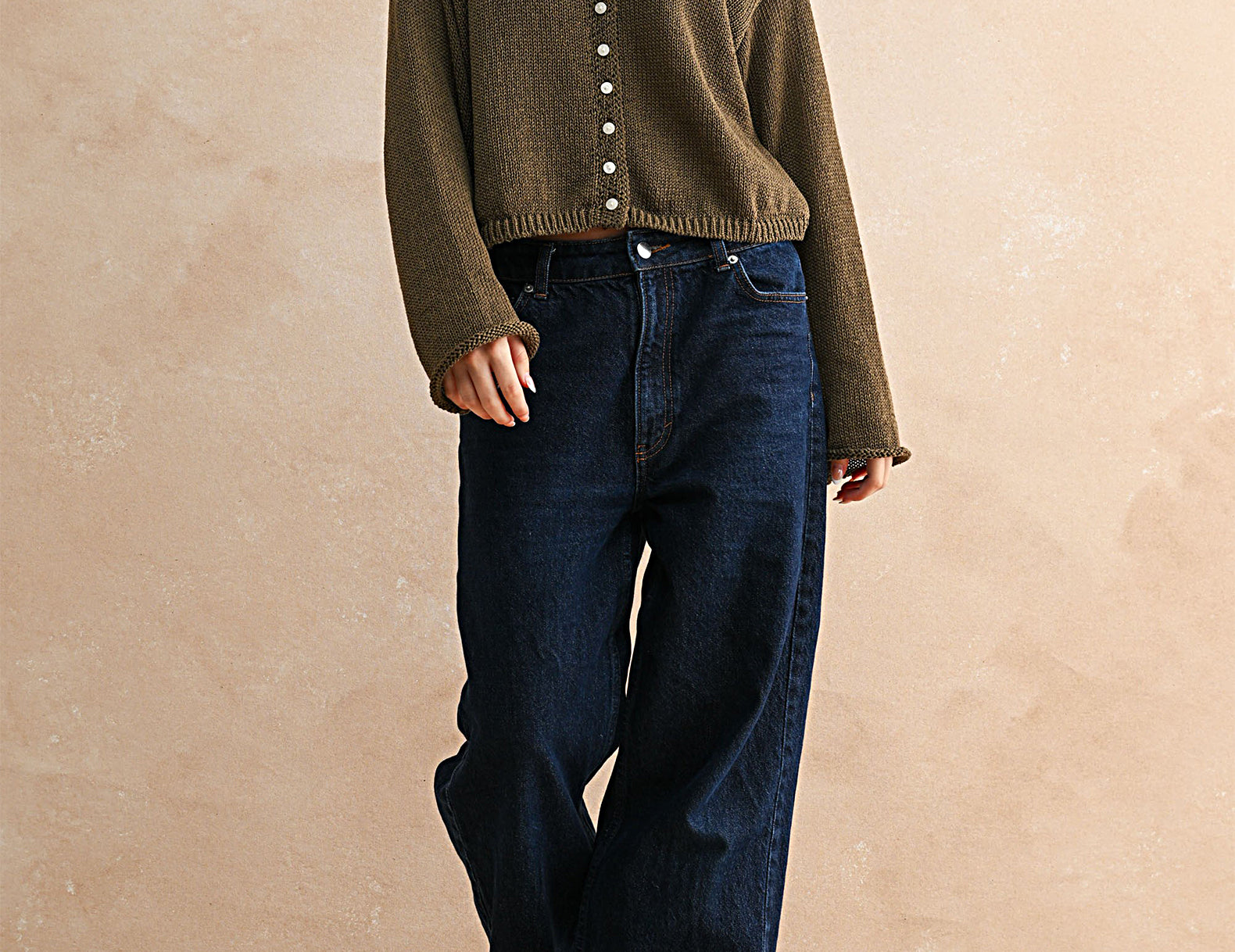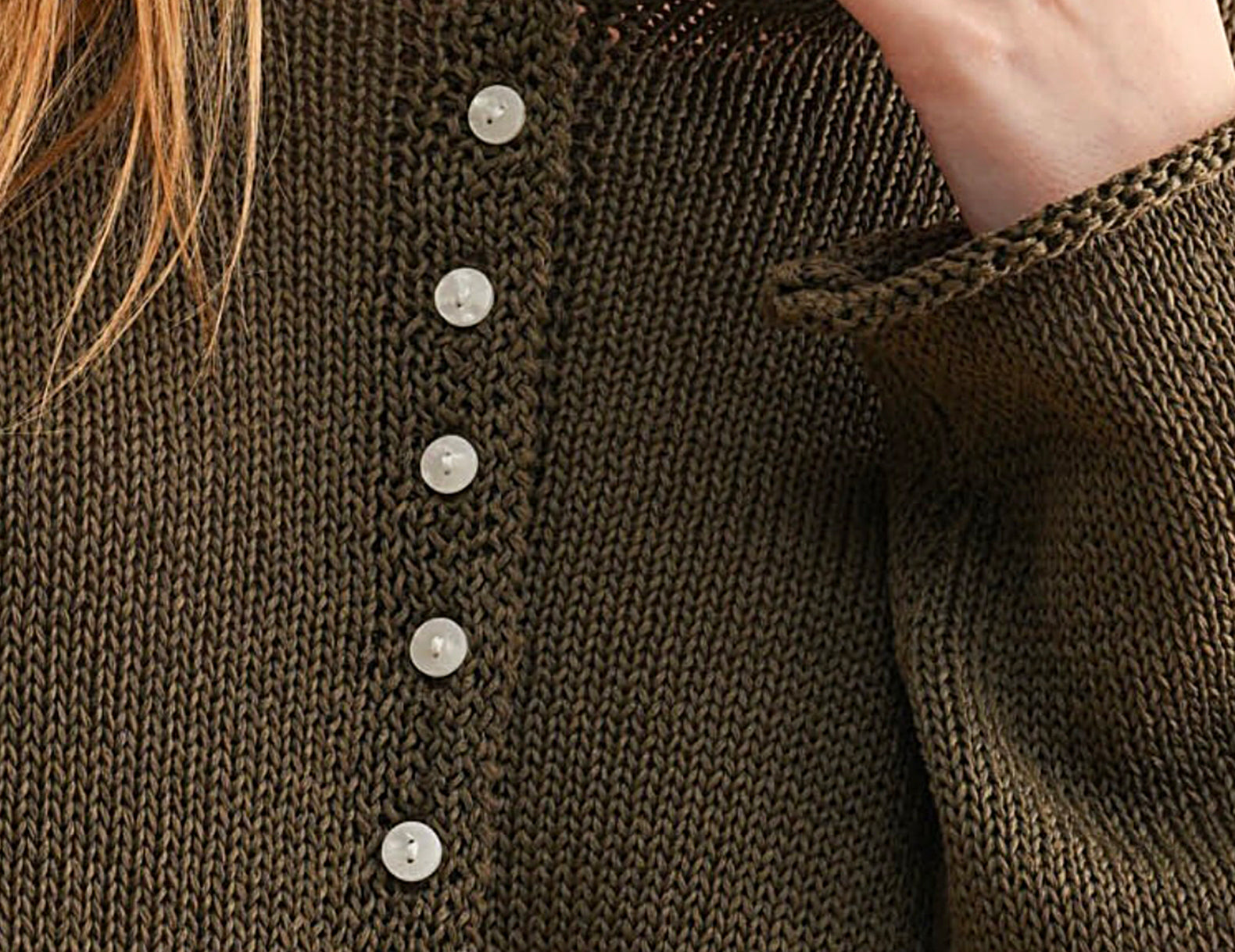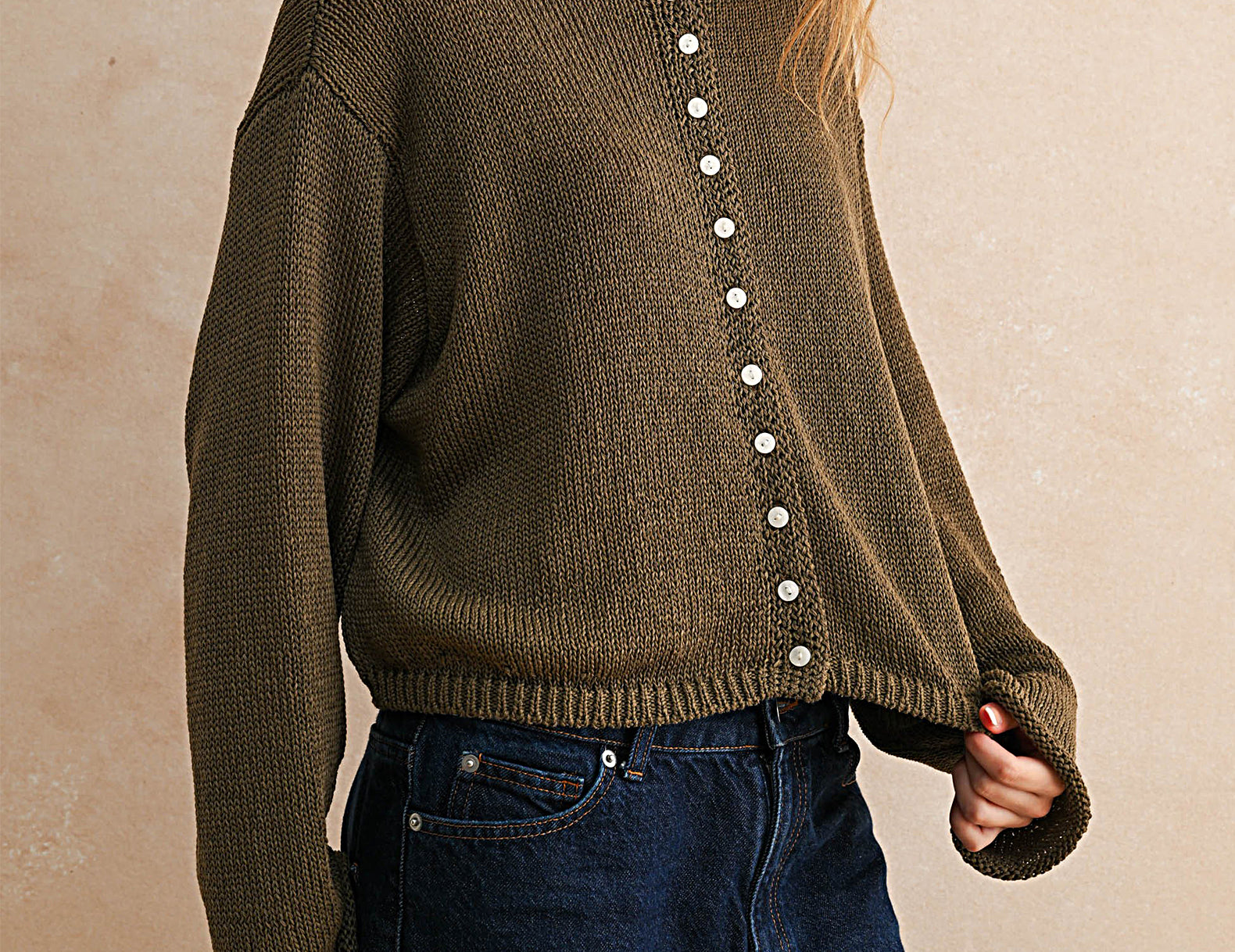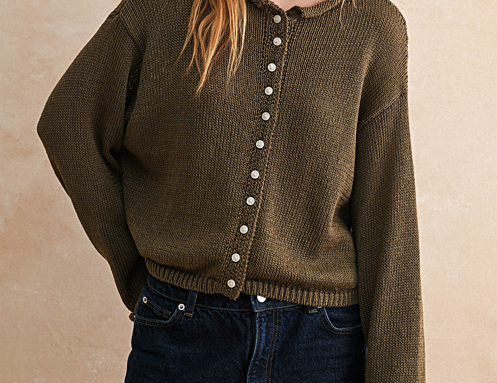 Done in a mid-weight cotton knit, this at-ease, boxy button-up sweater is perfect in any season. At the front, delicate ivory buttons contrast with the rich, coffee brown hue. The neckline and long, knuckle-grazing sleeves are finished with a rolled hem. Pair Andie with just about any bottom, or try it worn open over a cotton dress.