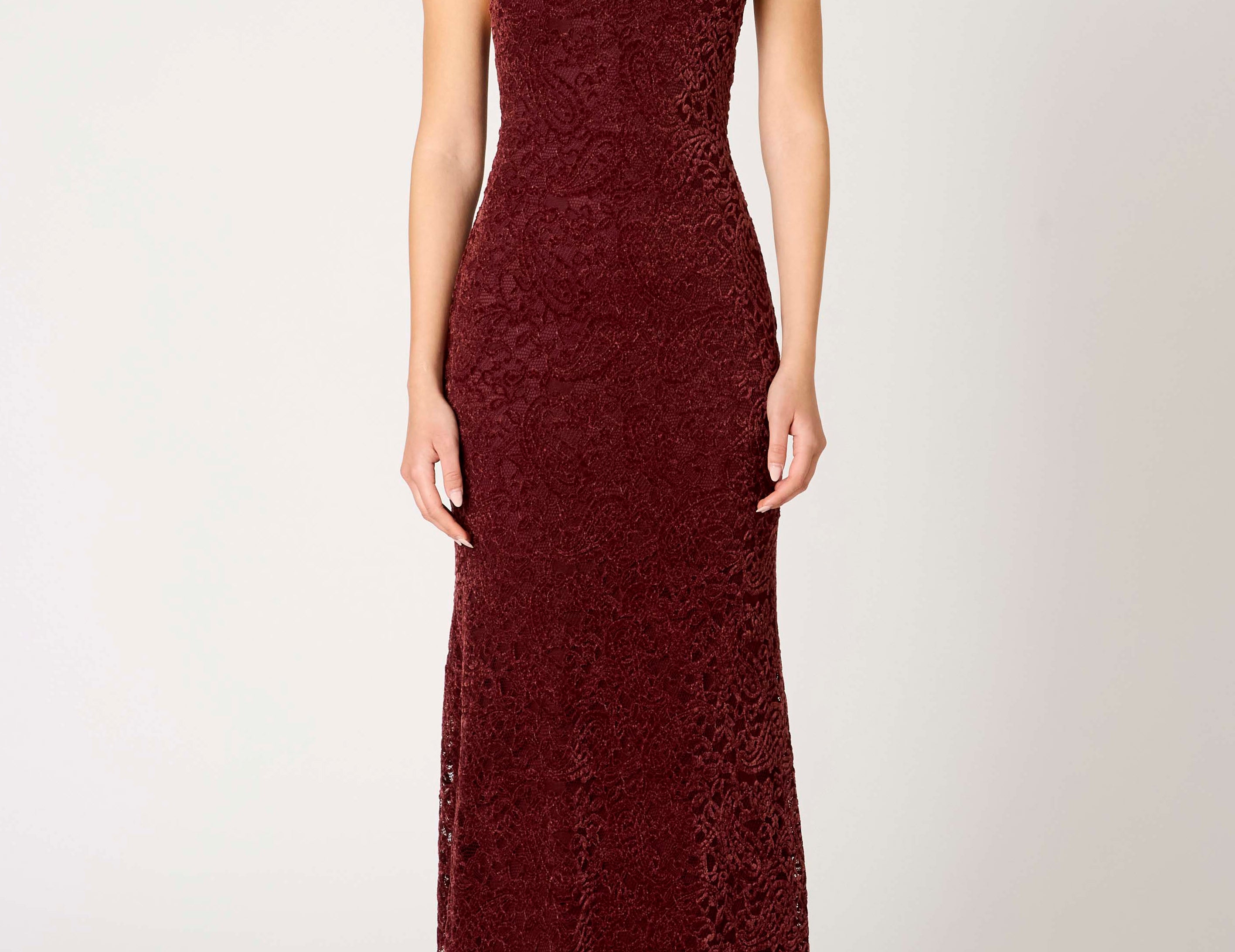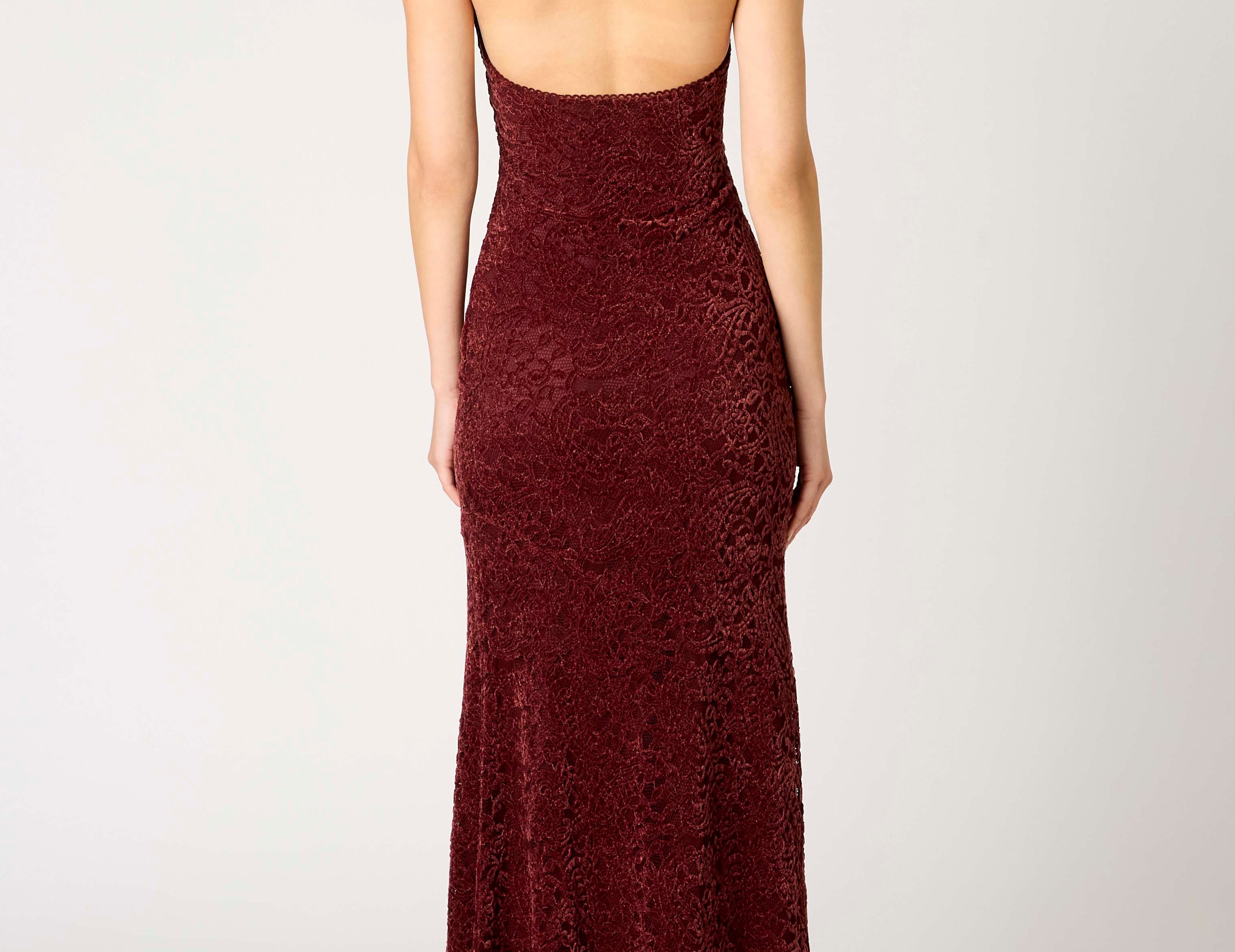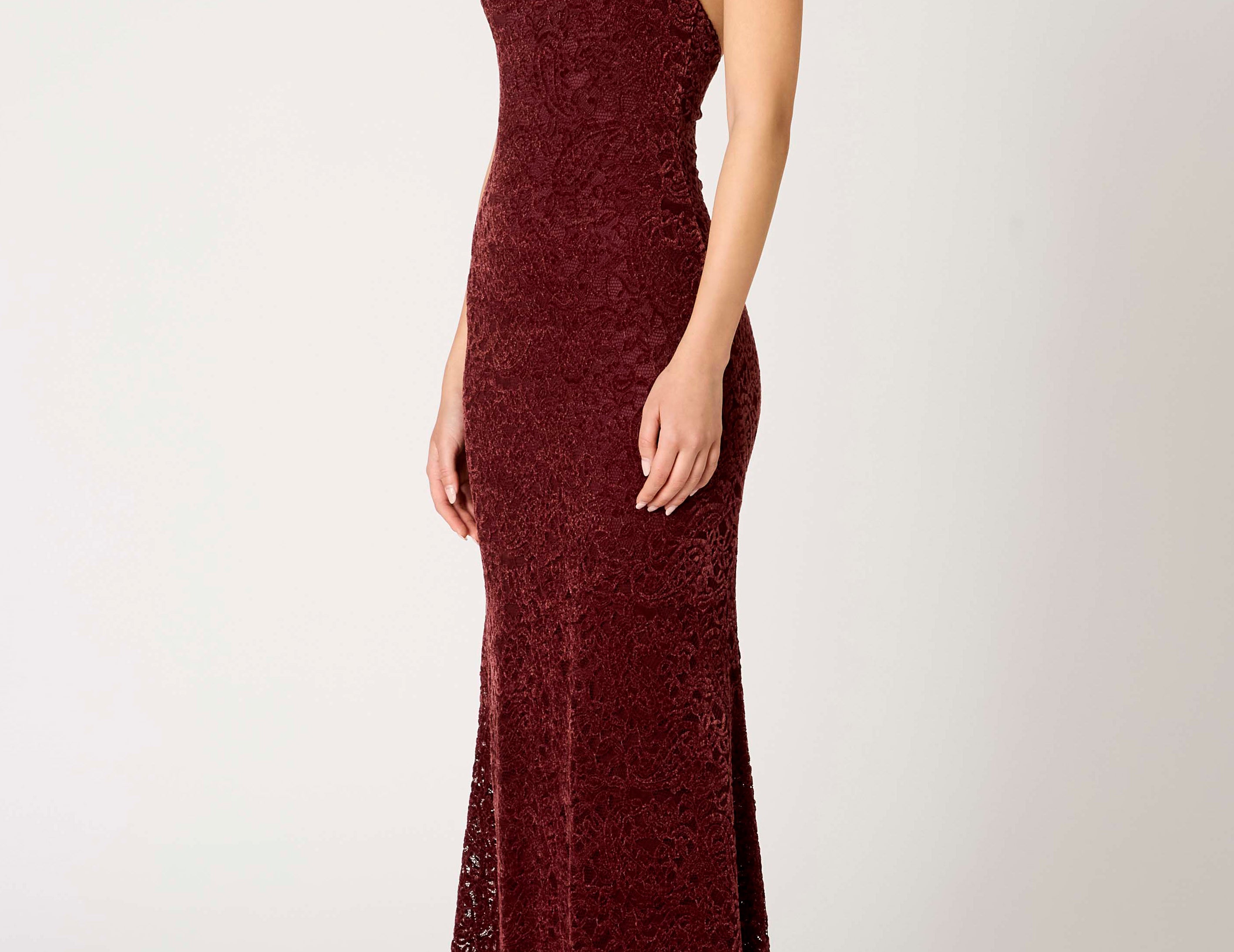 Decadent in a rich mahogany brown lace, the Aurelia hugs in a figure-flattering silhouette that’s raised at the halter neckline and flares at the floor-sweeping hem. Soft and textured in a velvet flocked lace with scalloped trim and a nearly backless finish - make this gown event-ready with slim heels, gold earrings, and a woody scent.