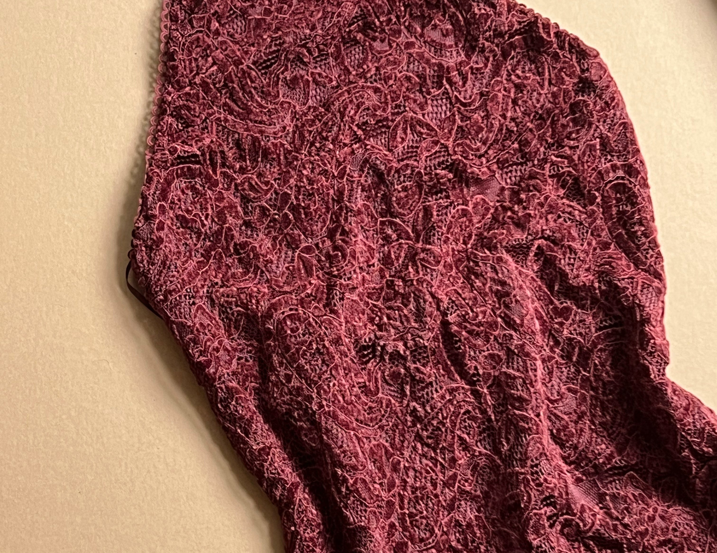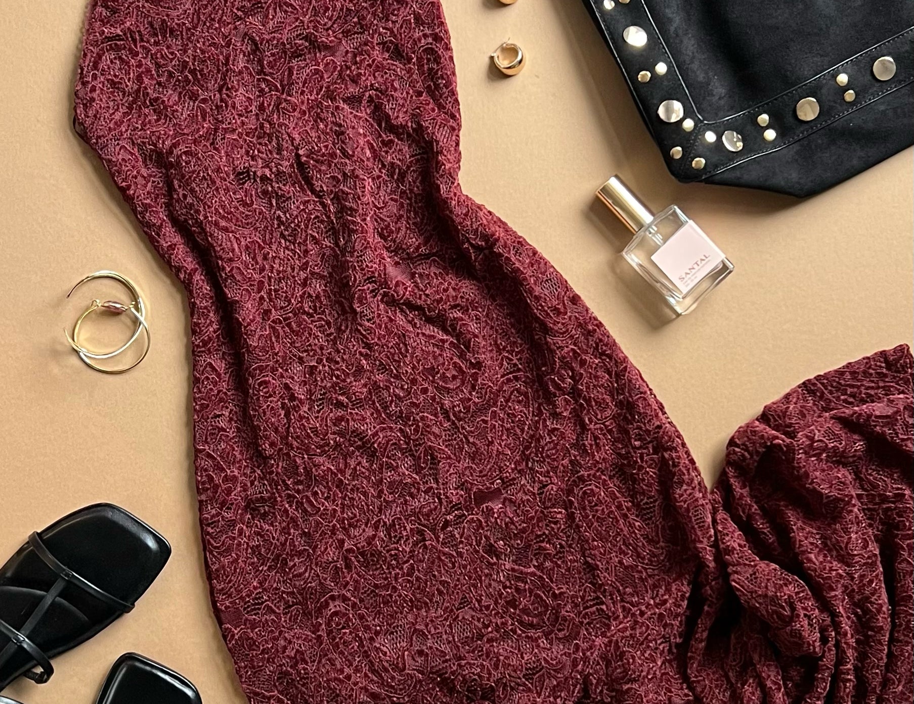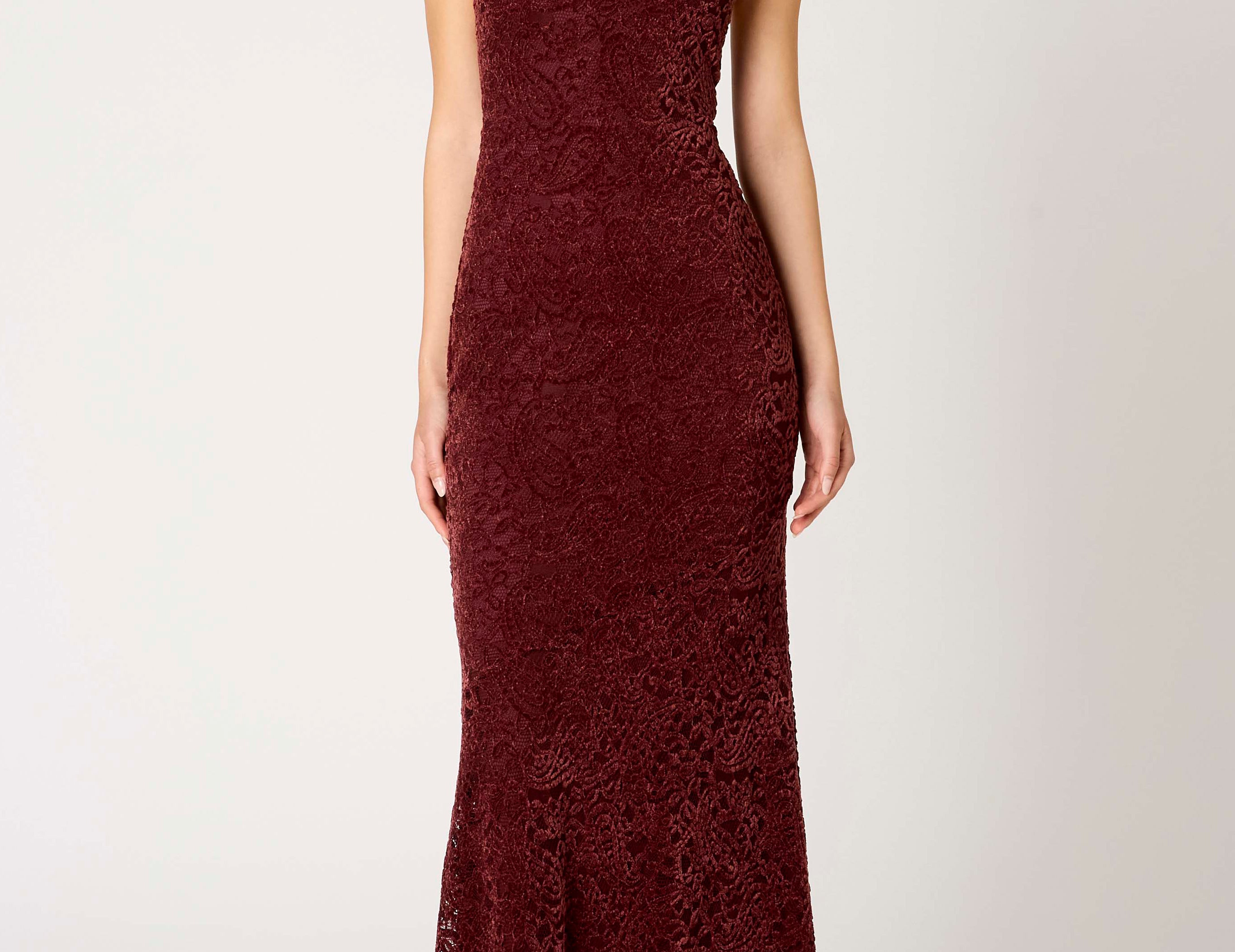 Decadent in a rich mahogany brown lace, the Aurelia hugs in a figure-flattering silhouette that’s raised at the halter neckline and flares at the floor-sweeping hem. Soft and textured in a velvet flocked lace with scalloped trim and a nearly backless finish - make this gown event-ready with slim heels, gold earrings, and a woody scent.