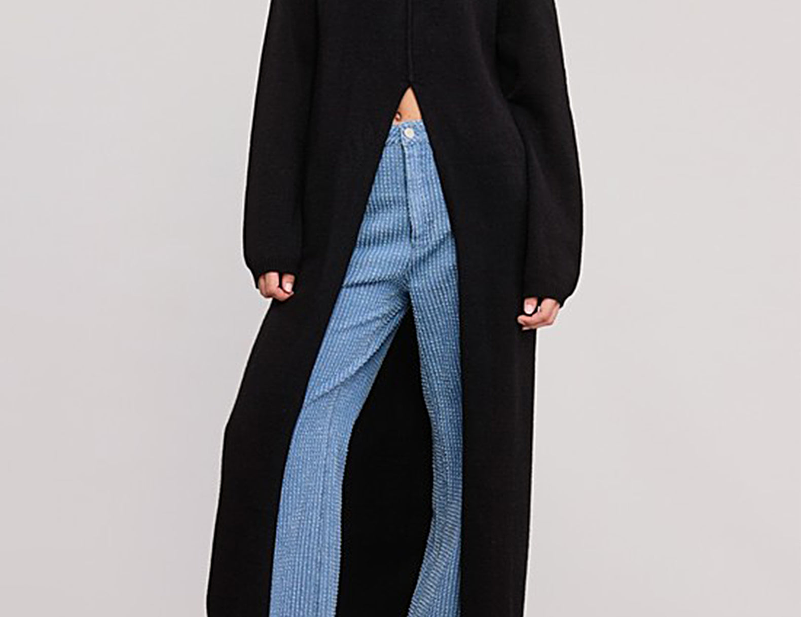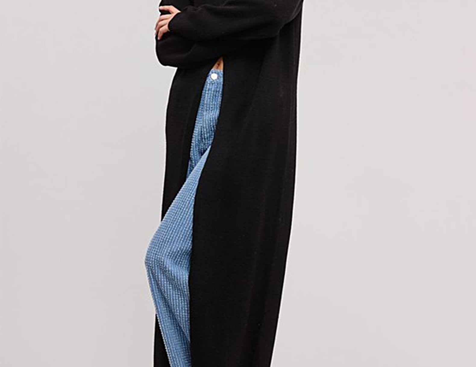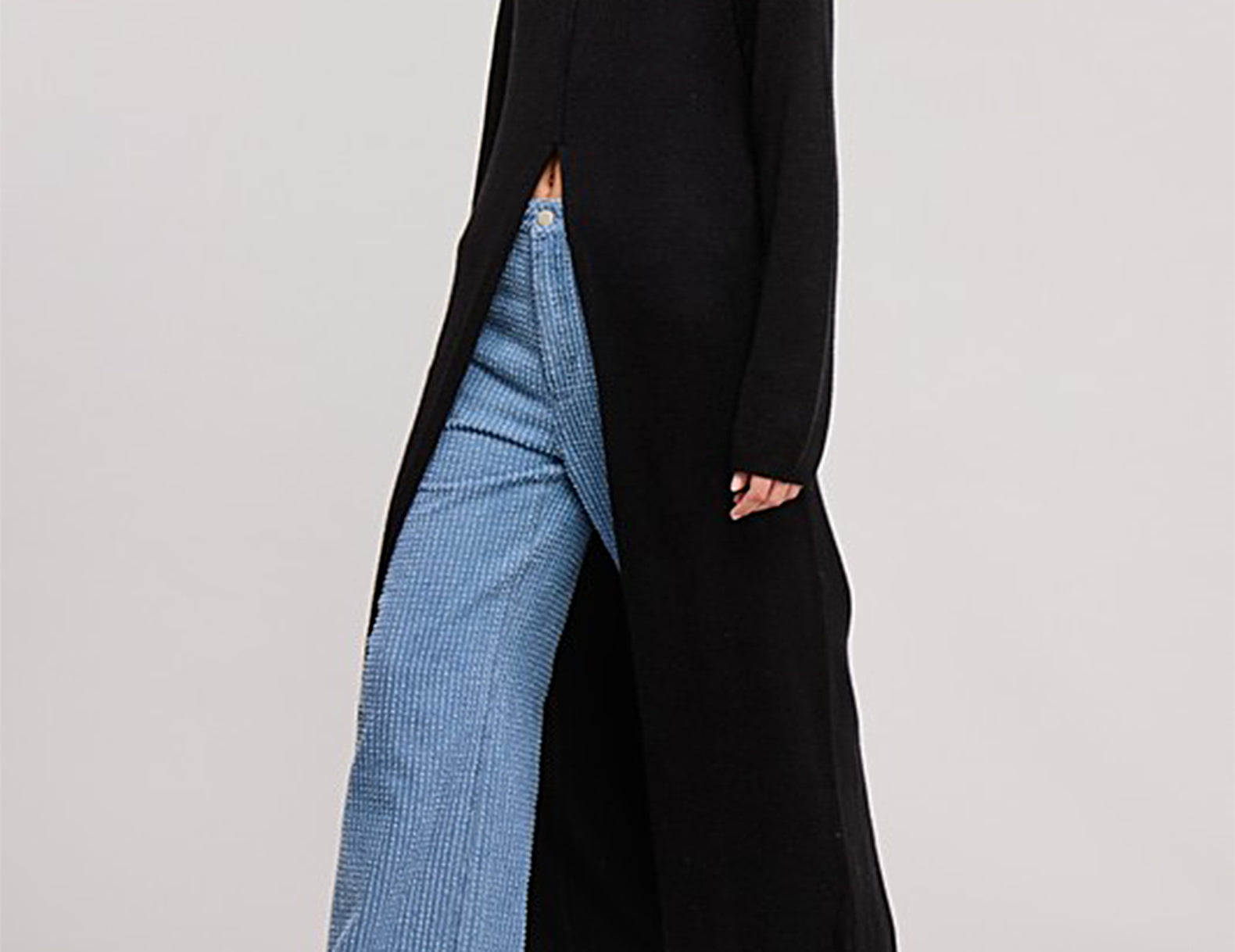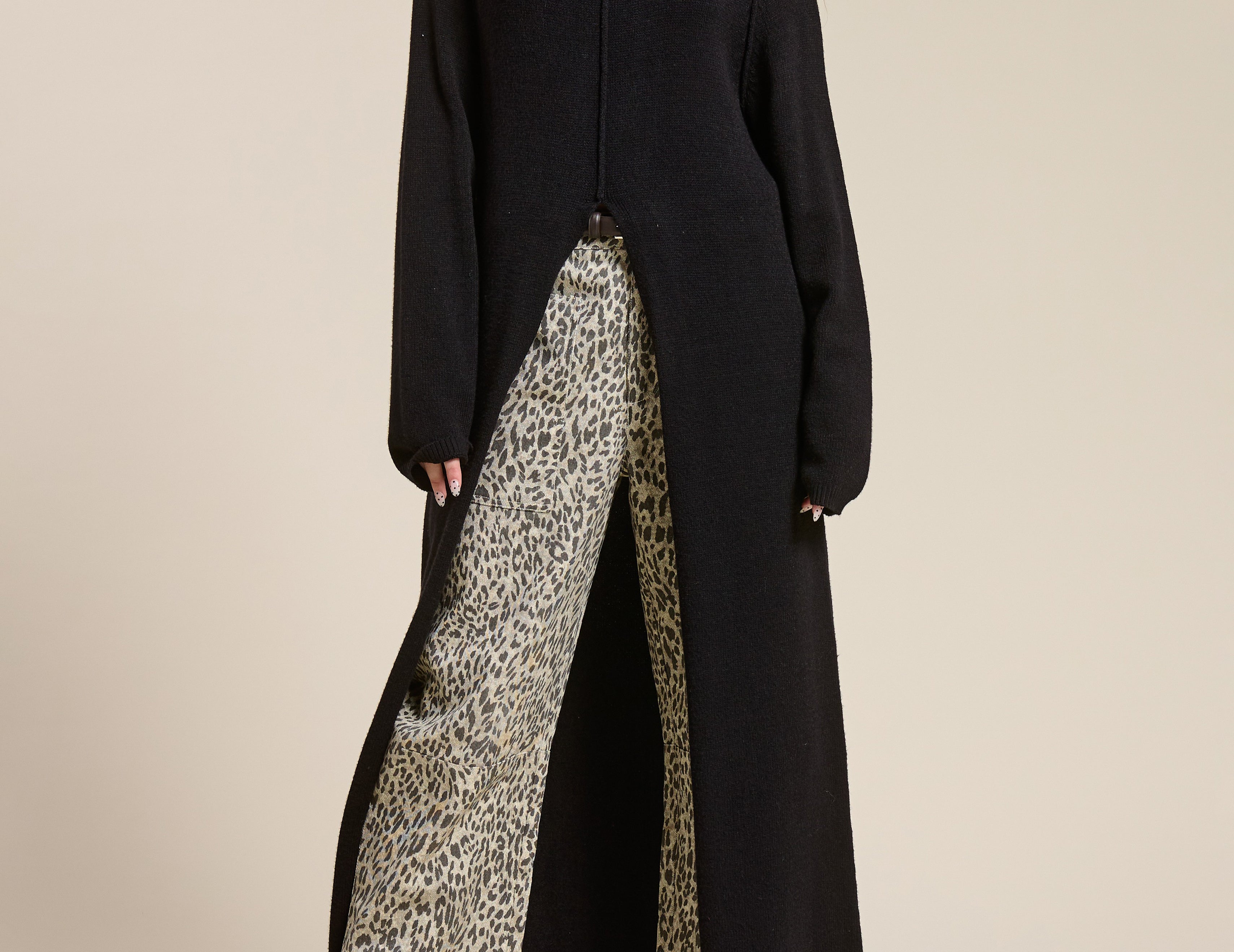 A modern take on the classic duster, the Ayla sweater is designed in a longline silhouette with a chunky, fold-over turtleneck and an eye-catching center split for an open front finish. Easy to wear in an ultra-soft knit and detailed with exposed seaming at the top, both neutral copper and true black add a modern finish to trousers and ankle boots, or update your favorite dress with this elevated layer.
