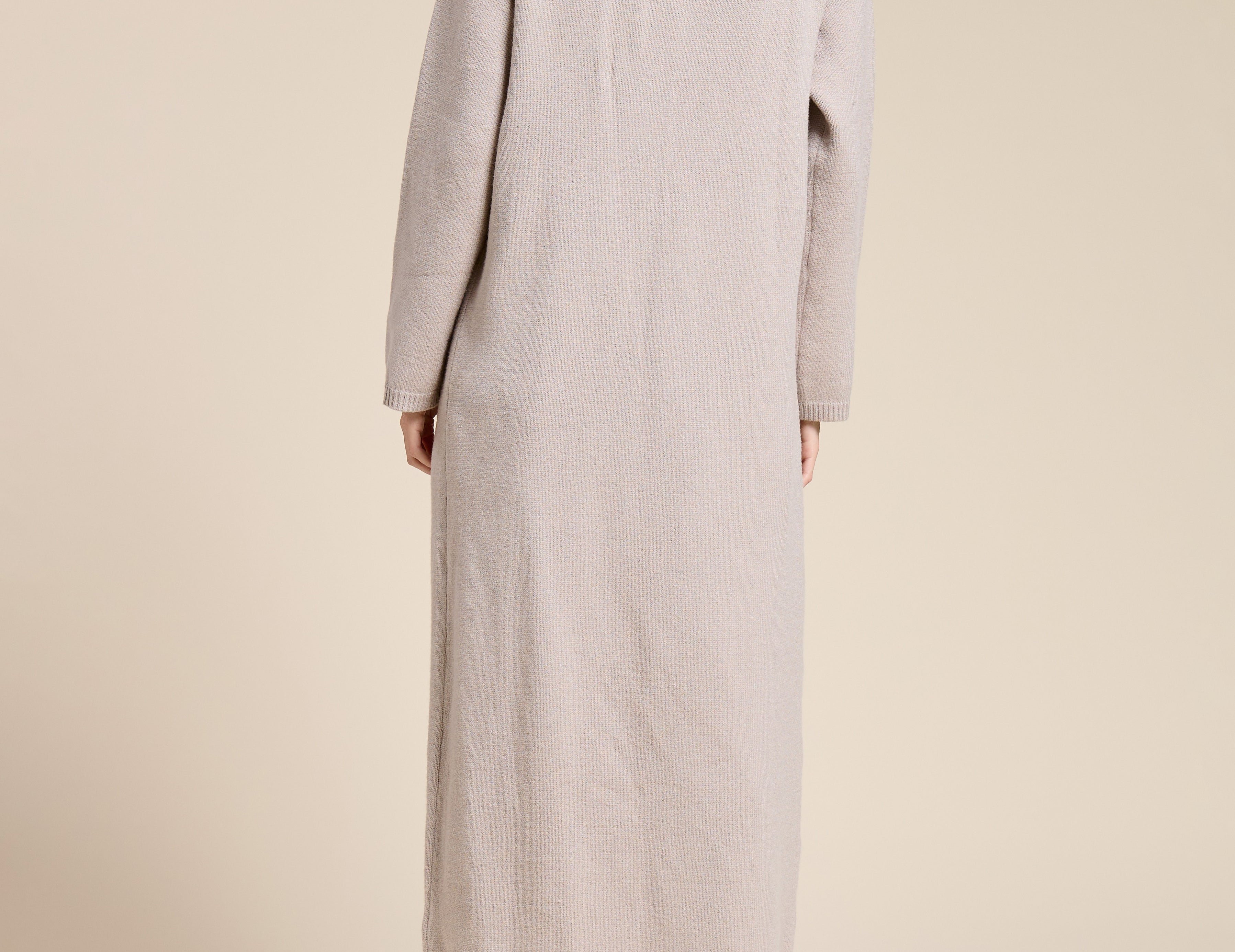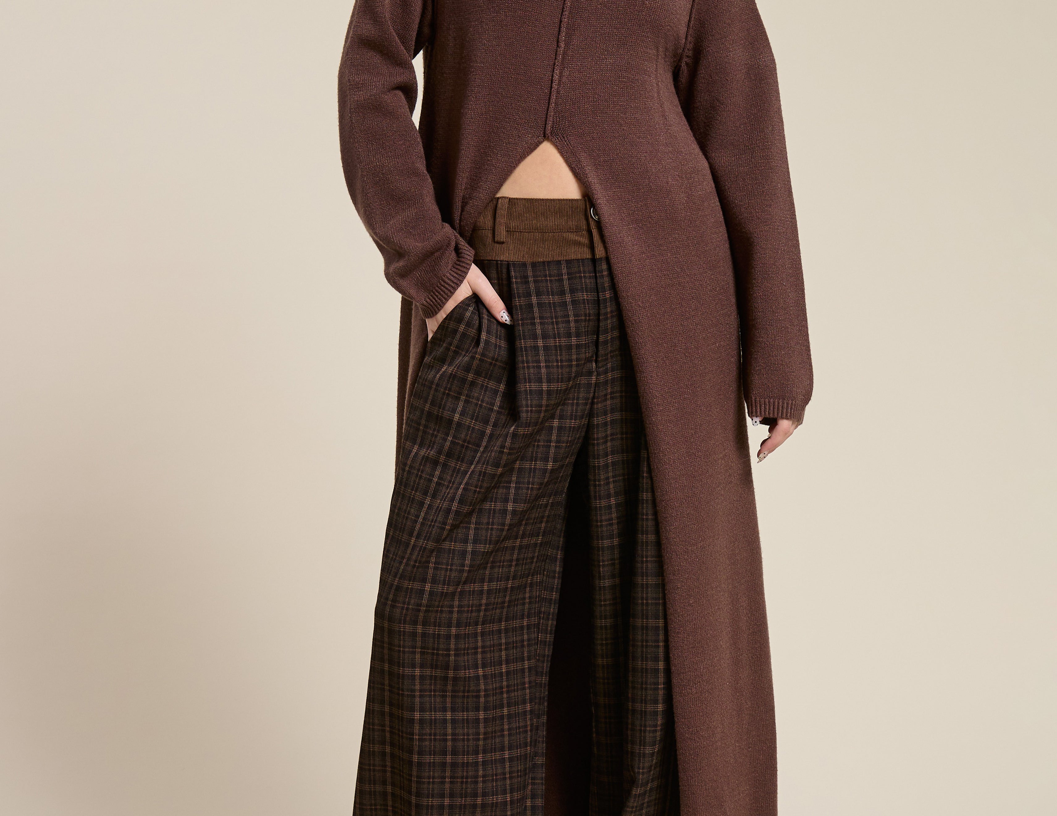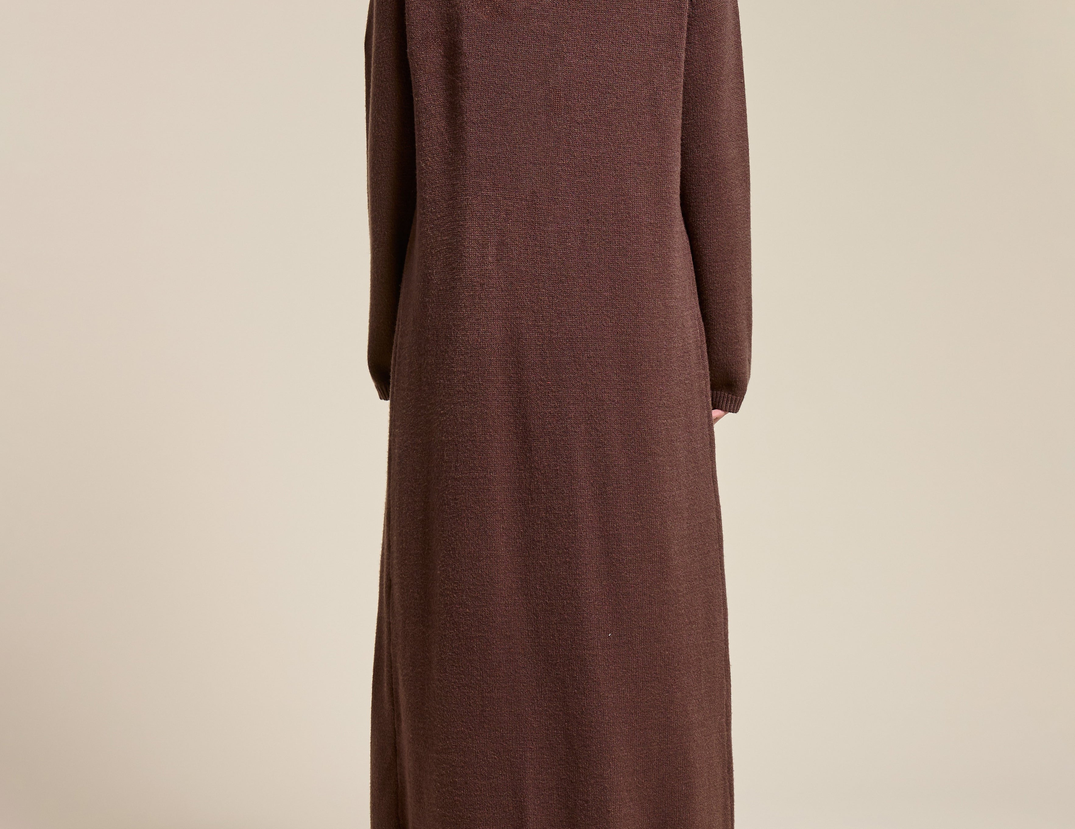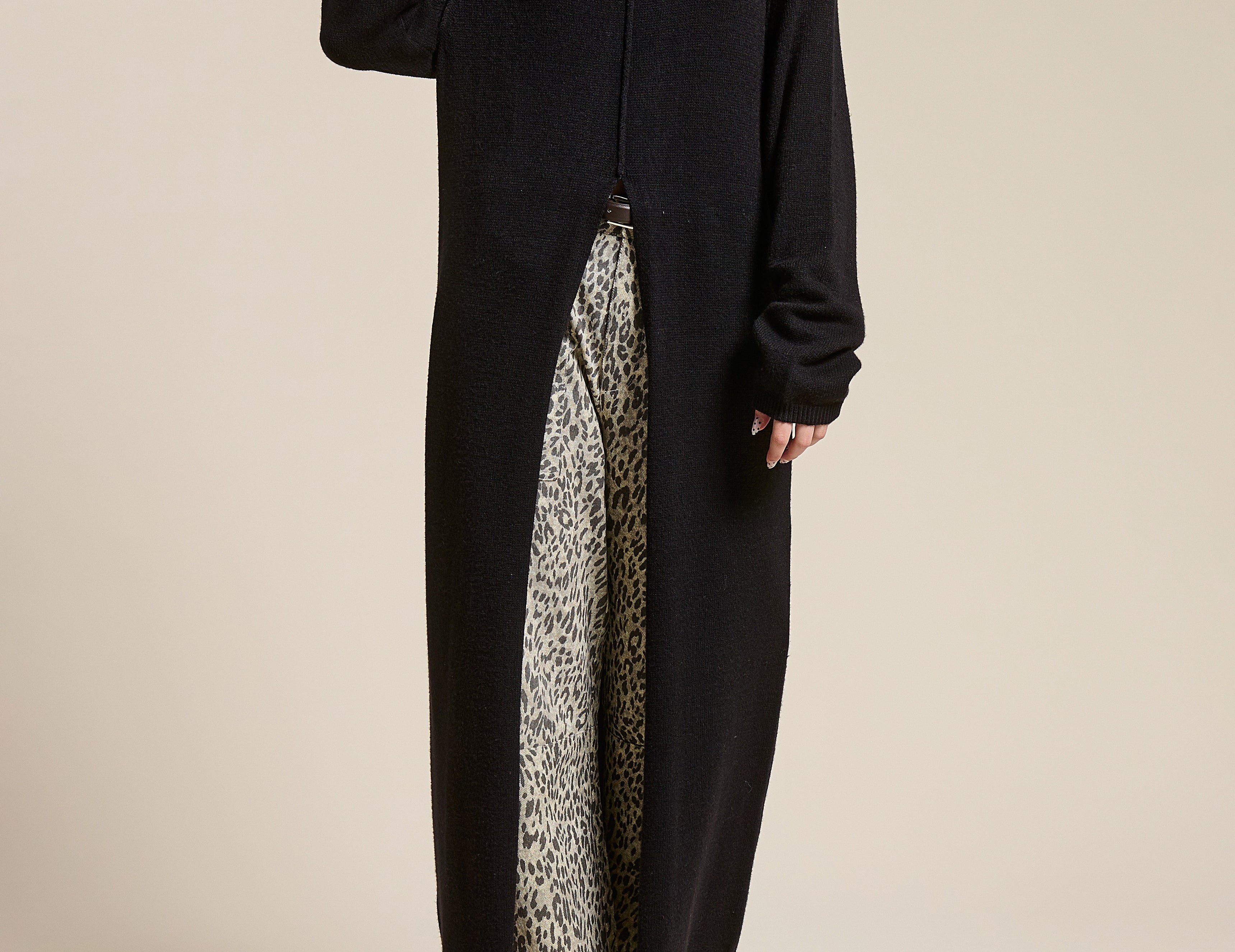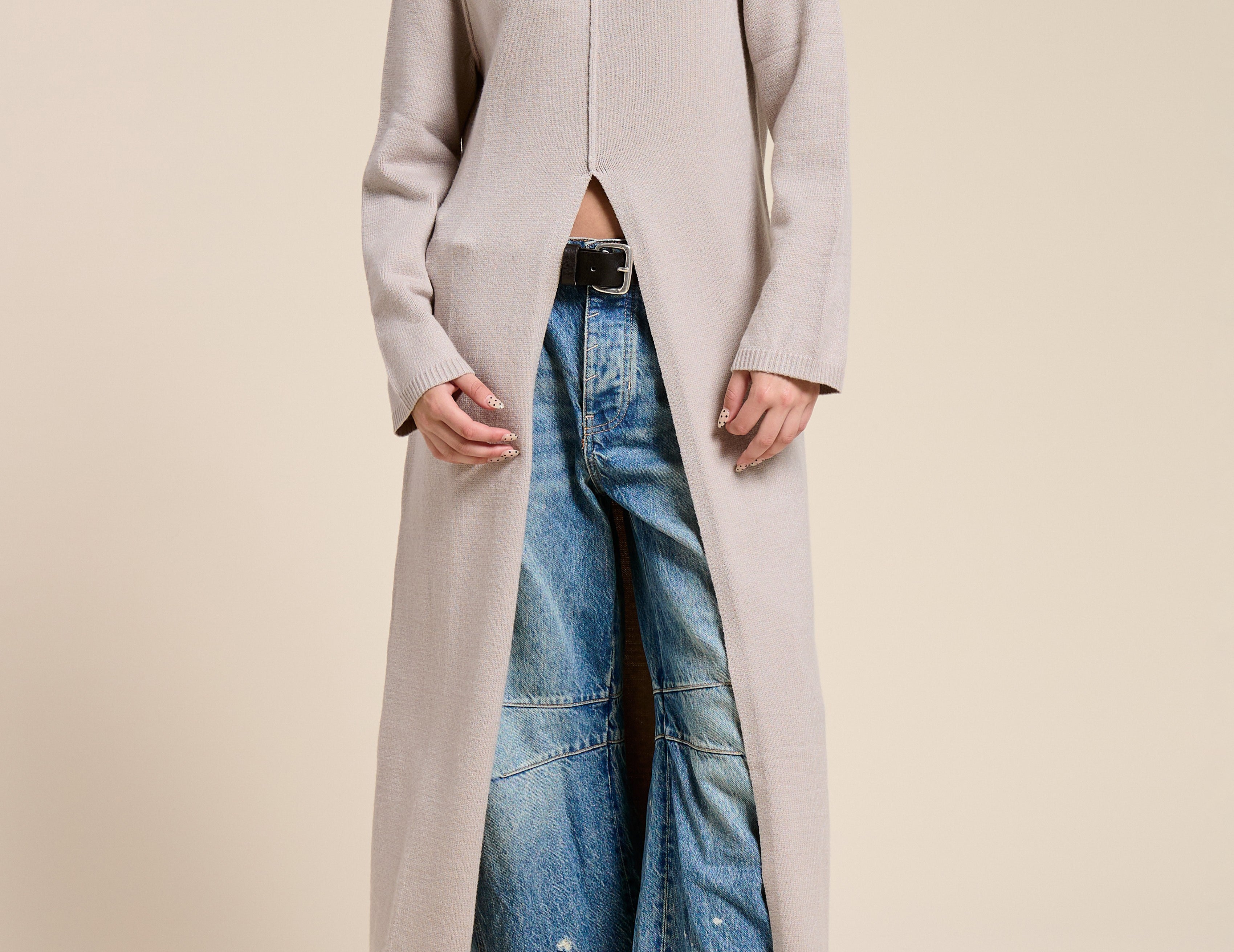 A modern take on the classic duster, the Ayla sweater is designed in a longline silhouette with a chunky, fold-over turtleneck and an eye-catching center split for an open front finish. Easy to wear in an ultra-soft knit and detailed with exposed seaming at the top, both neutral copper and true black add a modern finish to trousers and ankle boots, or update your favorite dress with this elevated layer.