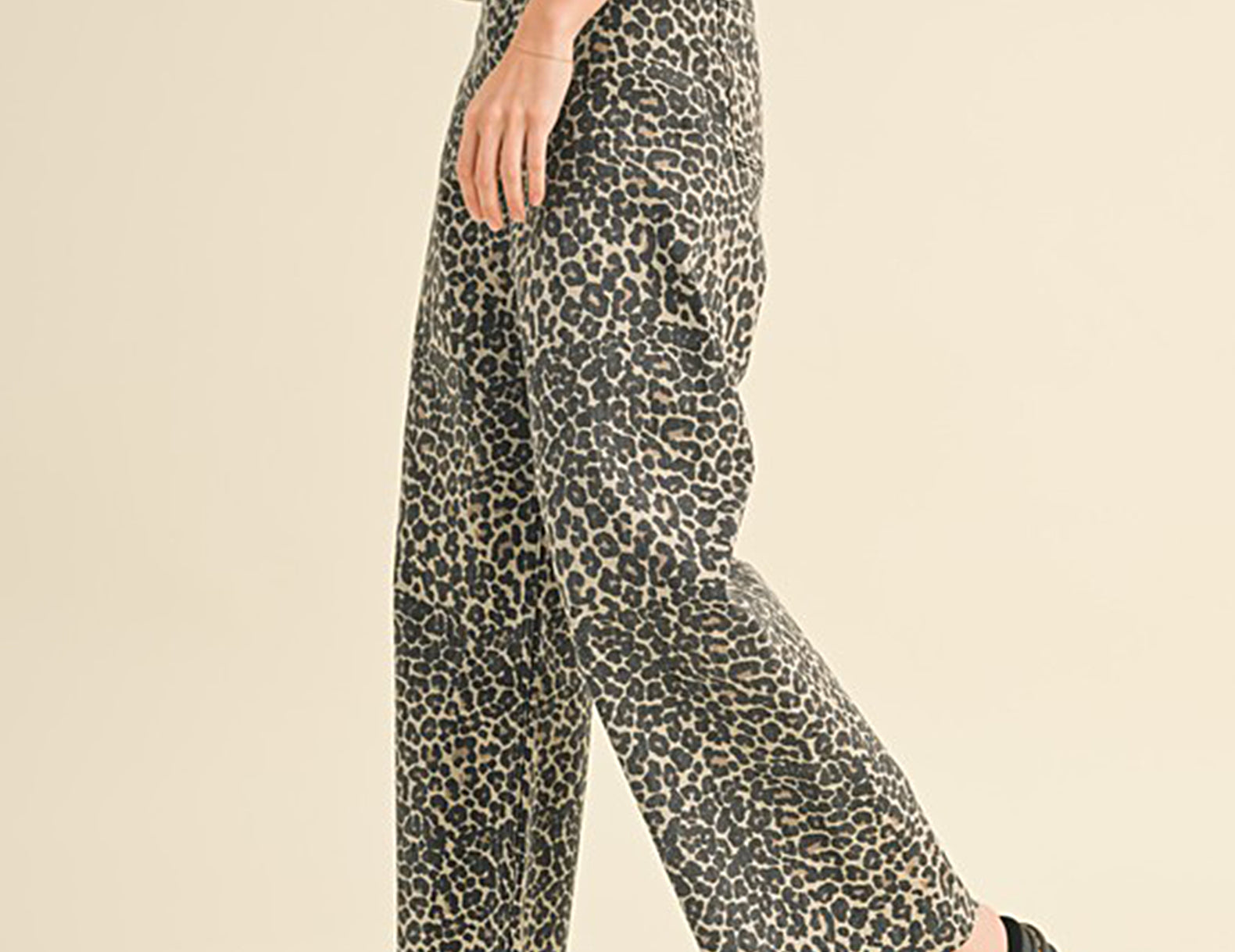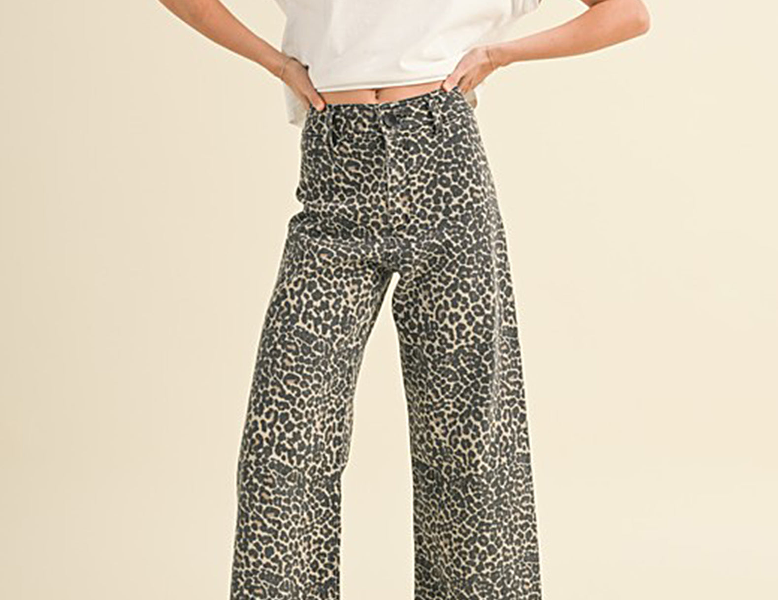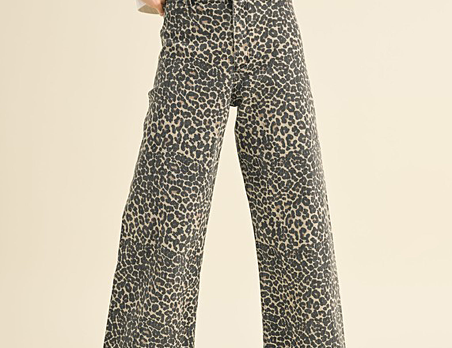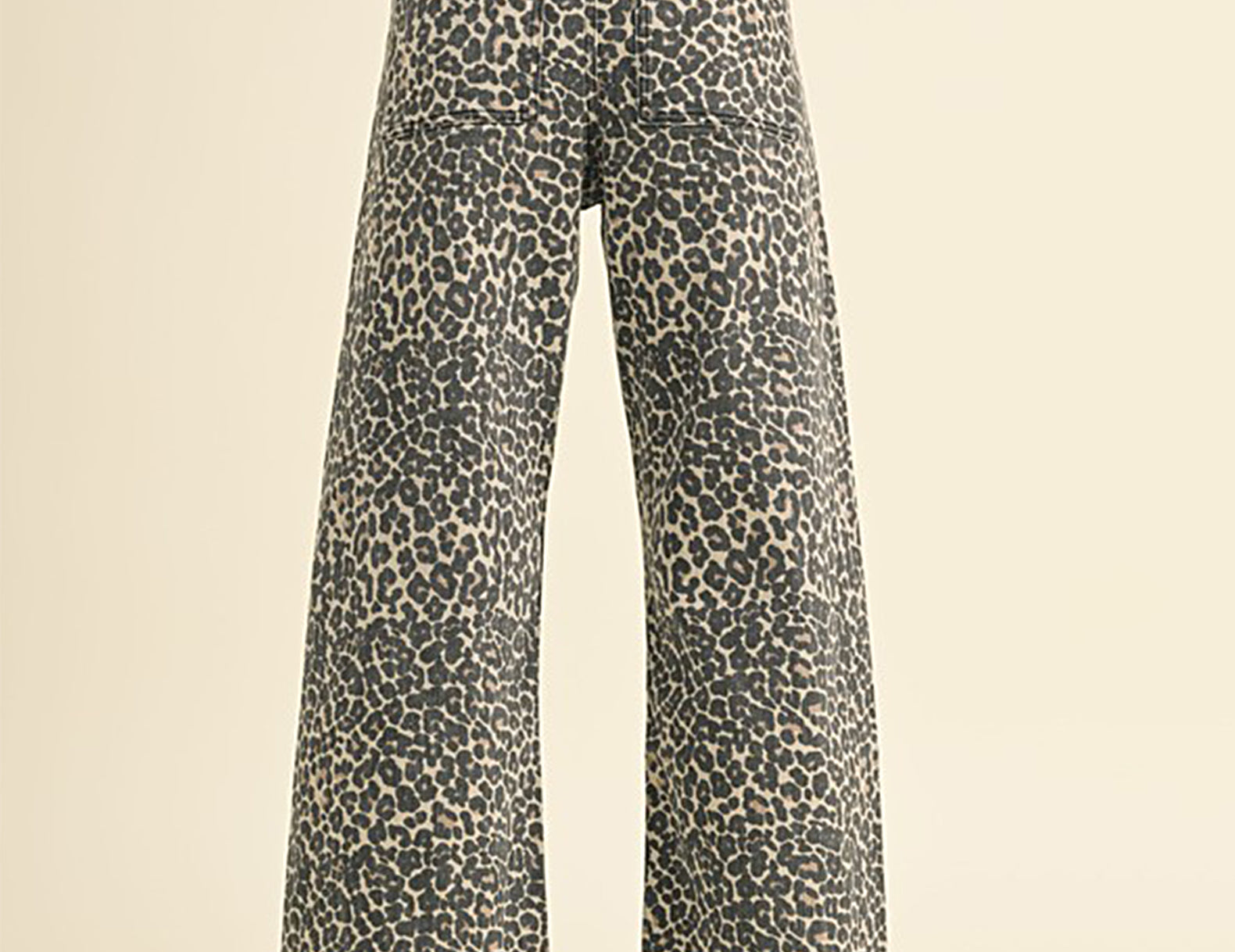 Nostalgic in a washed leopard print, these denim pants are stretch infused and cut to a wide leg, high-rise silhouette with raw hemlines and black contrast stitching. Hugging high on the waist for a curve-loving finish, these printed pants pair well with a denim button-up or a graphic tee and Docs.