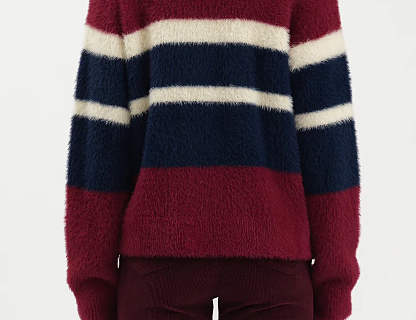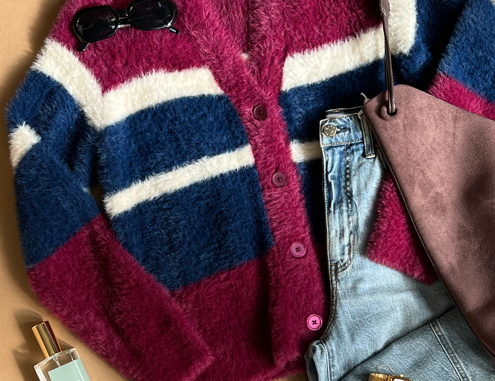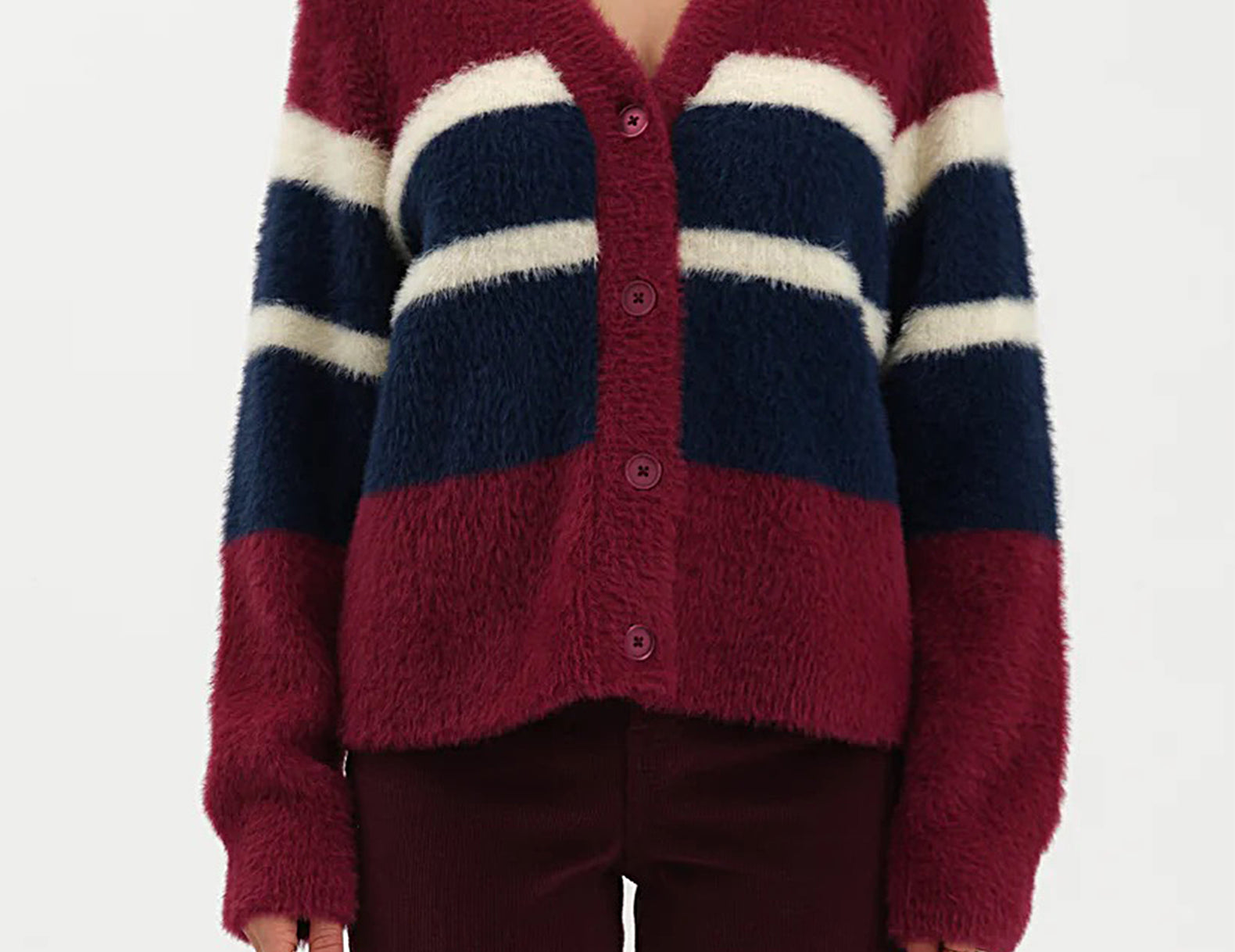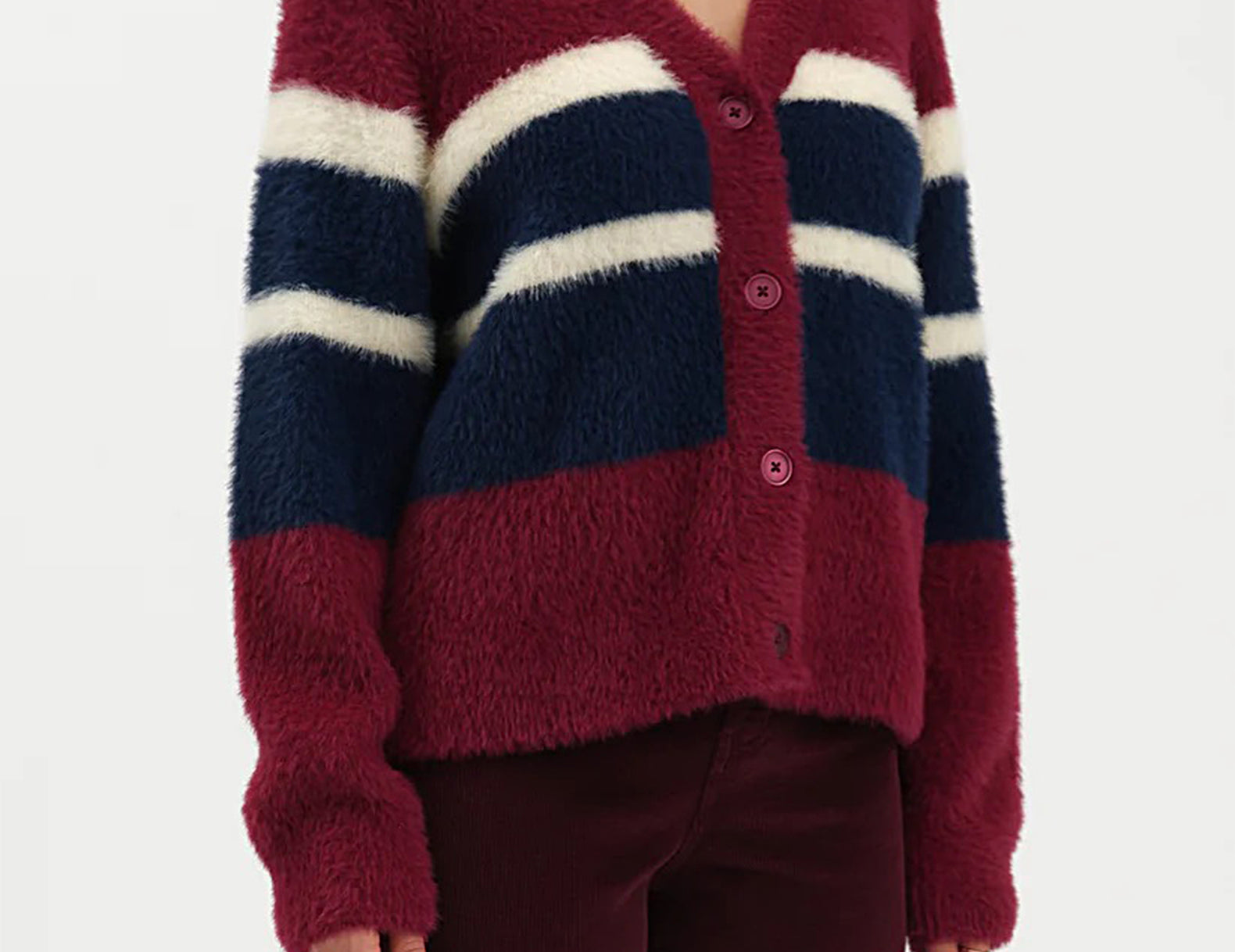 Ridiculously plush in an ultra-fuzzy, weighted knit, the Bleeker cardigan from Daze is designed to be roomy. It has a relaxed, hip-length silhouette with knuckle-gazing sleeves, thick ribbed edges, and four buttons down the front. With a hint of varsity vibes in a chunky striped color block, this luxe cardigan is a cool-weather favorite with dark-wash denim and boots, or trousers and flats.