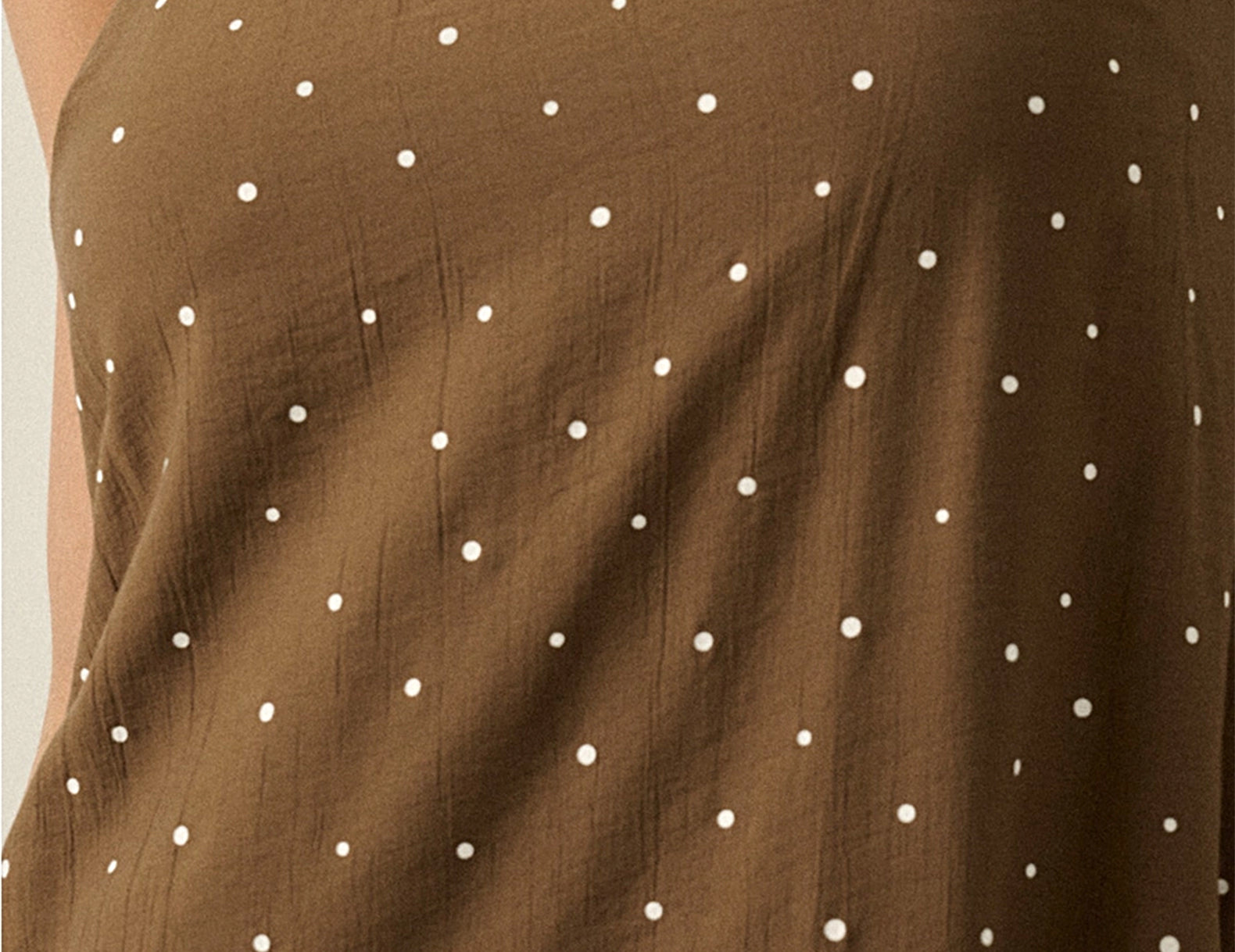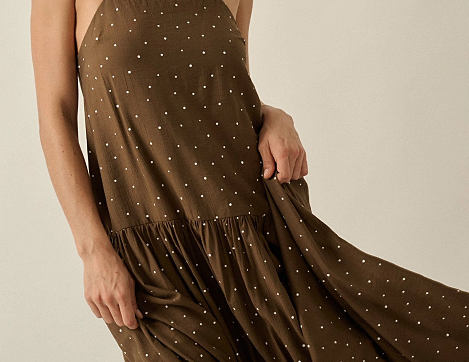 Effortless in a relaxed, drop-waist silhouette, the Blythe sundress is an elevated piece you'll reach for when comfort is top of mind. It's done in a textured crepe in rich chocolate brown, with white polka dots throughout. The neckline and back are cut square beneath narrow, adjustable straps, and the gathered waist is dropped just around the hips.