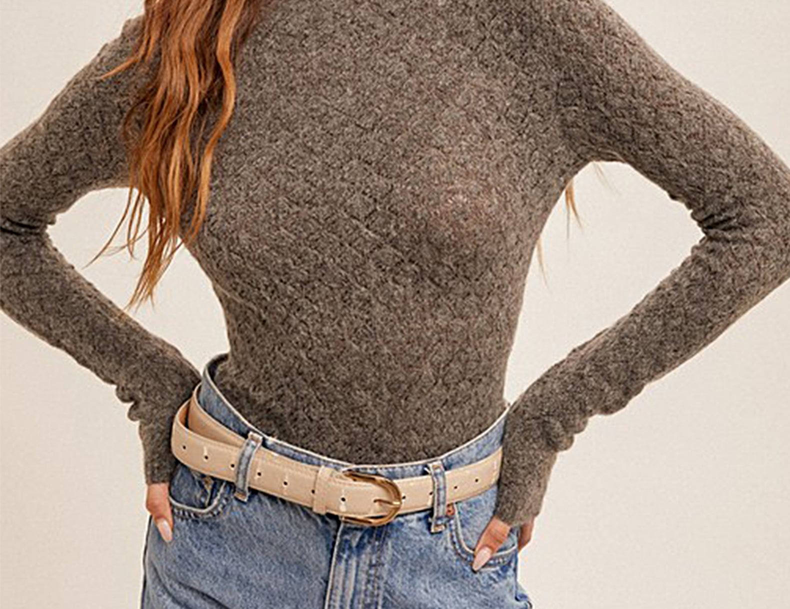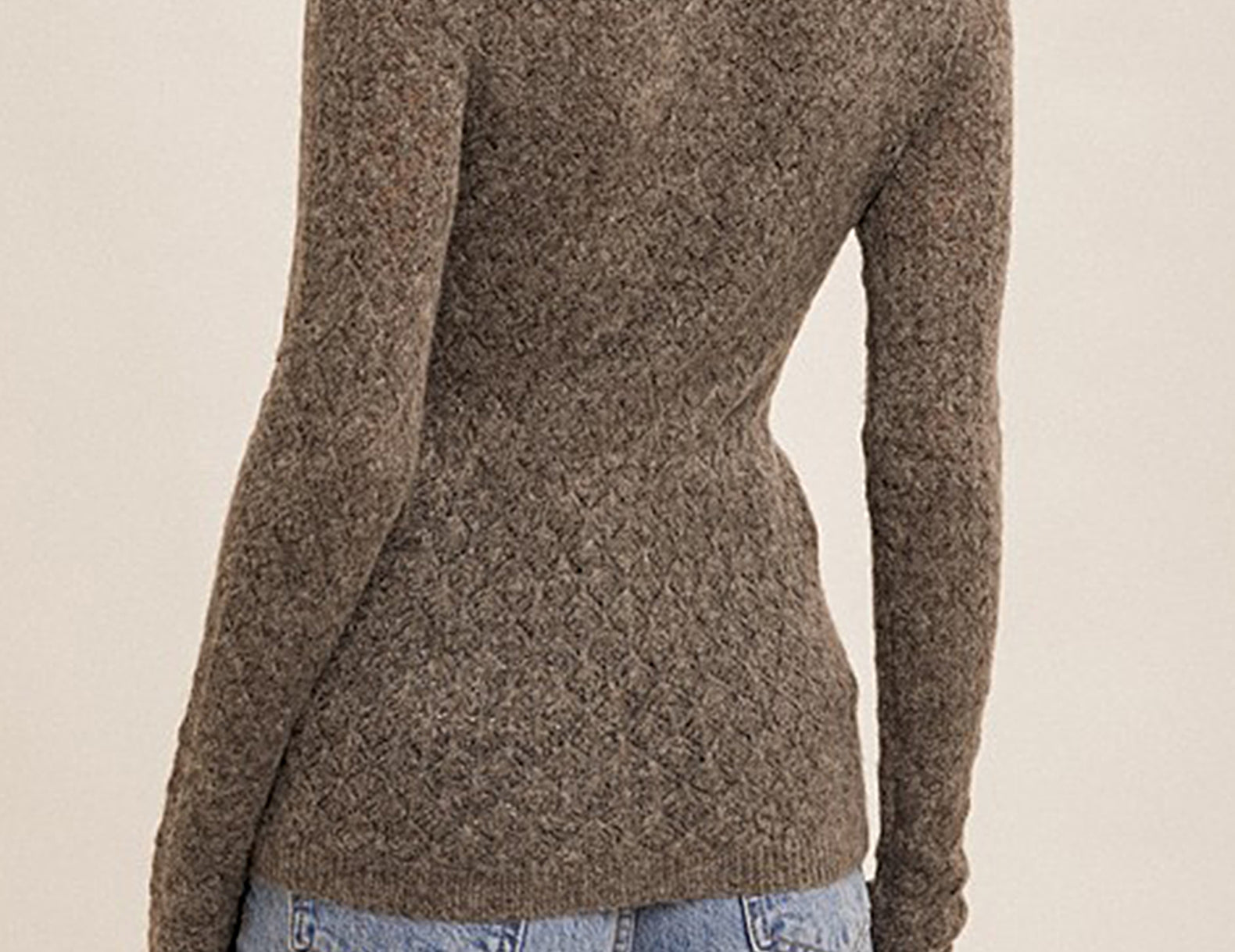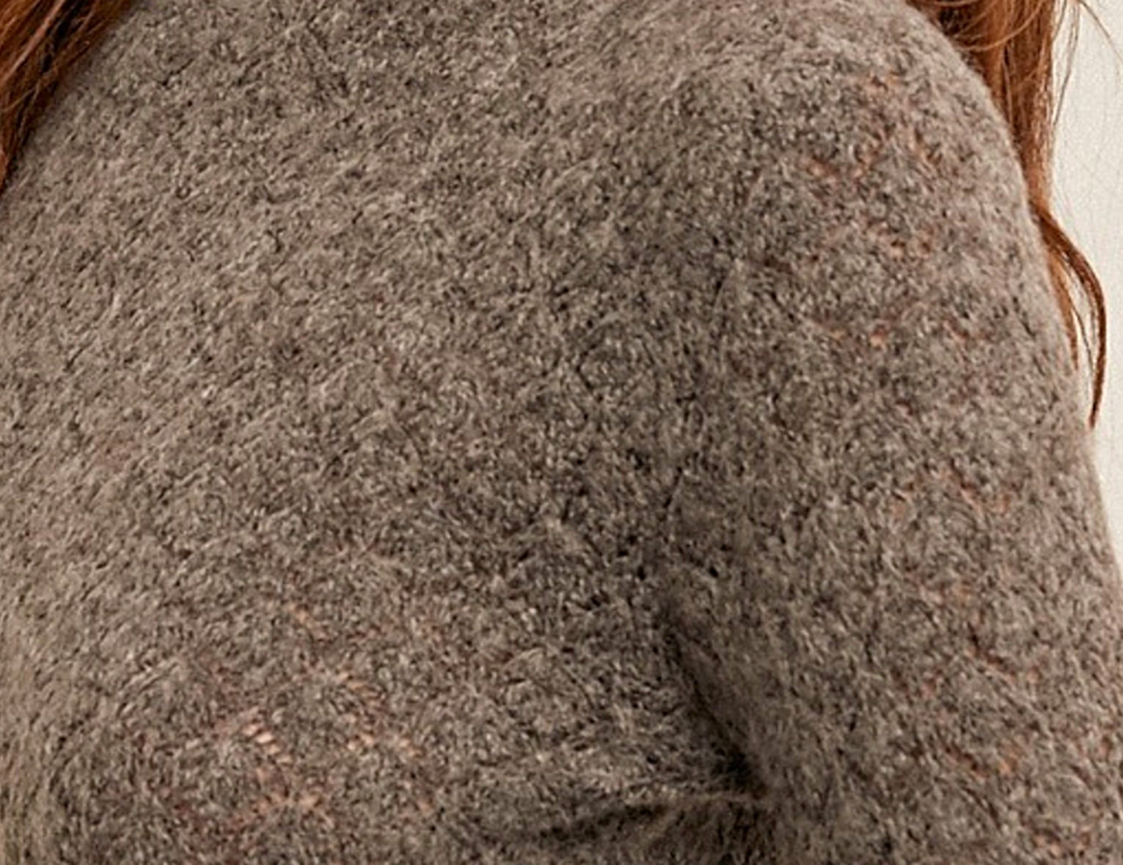 Subtle texture in a slim fit, this sweater top is cozy with a raised mock neck and knuckle-grazing long sleeves. Barely sheer in a diamond pointelle knit against cedar gray, try this soft favorite tucked into jeans or layered with a vest and pleated skirt.
