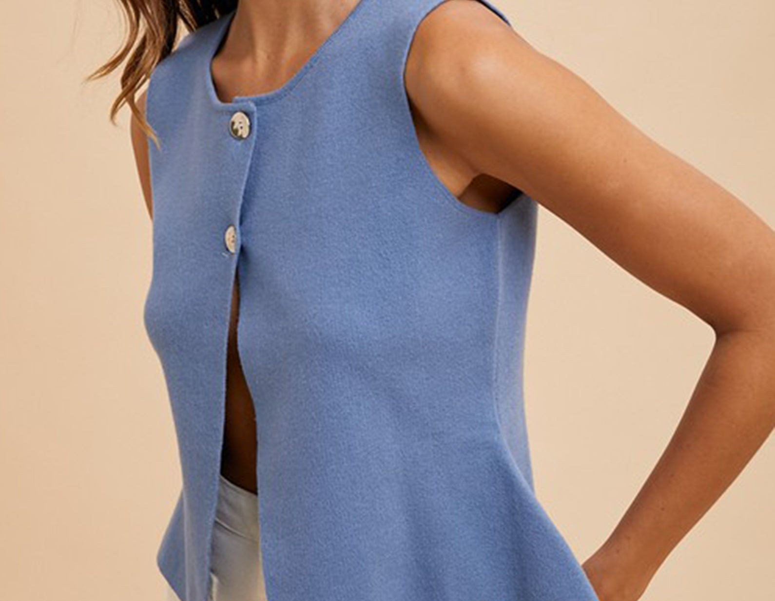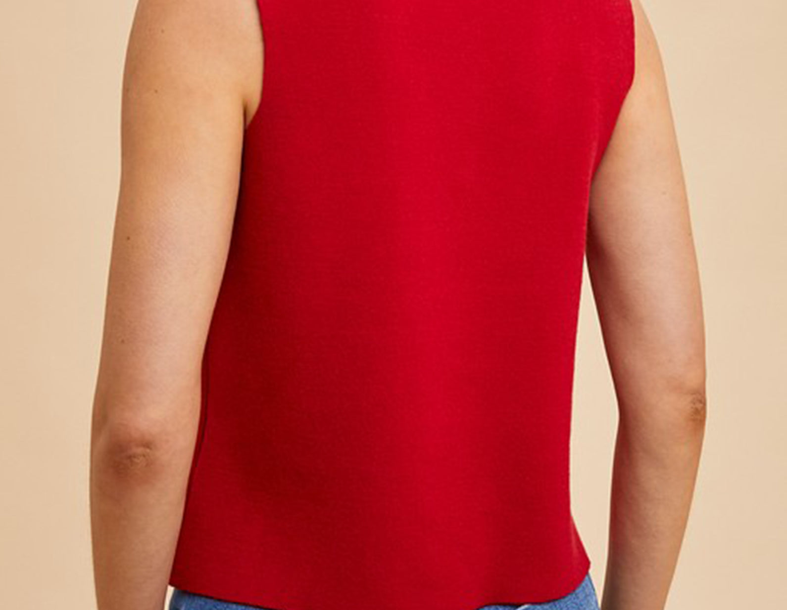 Soft, versatile, and double buttoned with freeform, silver buttons, this vest top is breezy in a boxy, split front, semi-cropped silhouette. Perfectly weighted in a plush, ponte knit in creamy azure or cherry red, try the Callen tossed over a billowy button-down with denim or structured trousers.