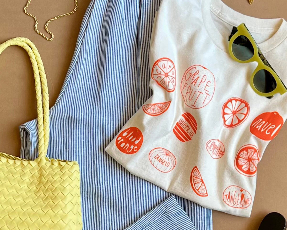 Sour and sweet, this playful tee is sketched with a variety of citrus fruits against an extra relaxed, longline silhouette in a unisex fit. Cut from soft, off-white cotton with artful, hand-drawn designs to finish, try this zesty tee with denim and fisherman sandals, or with a satin midi and strappy flats.