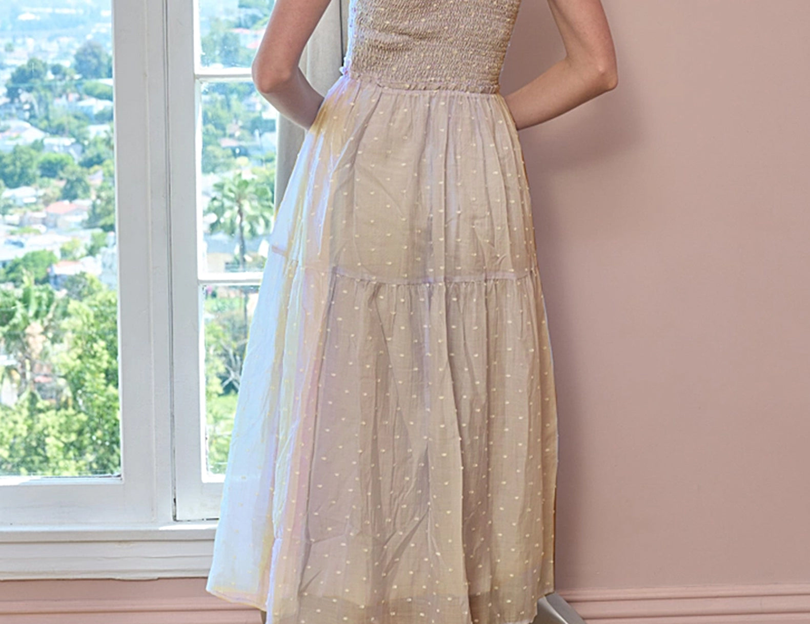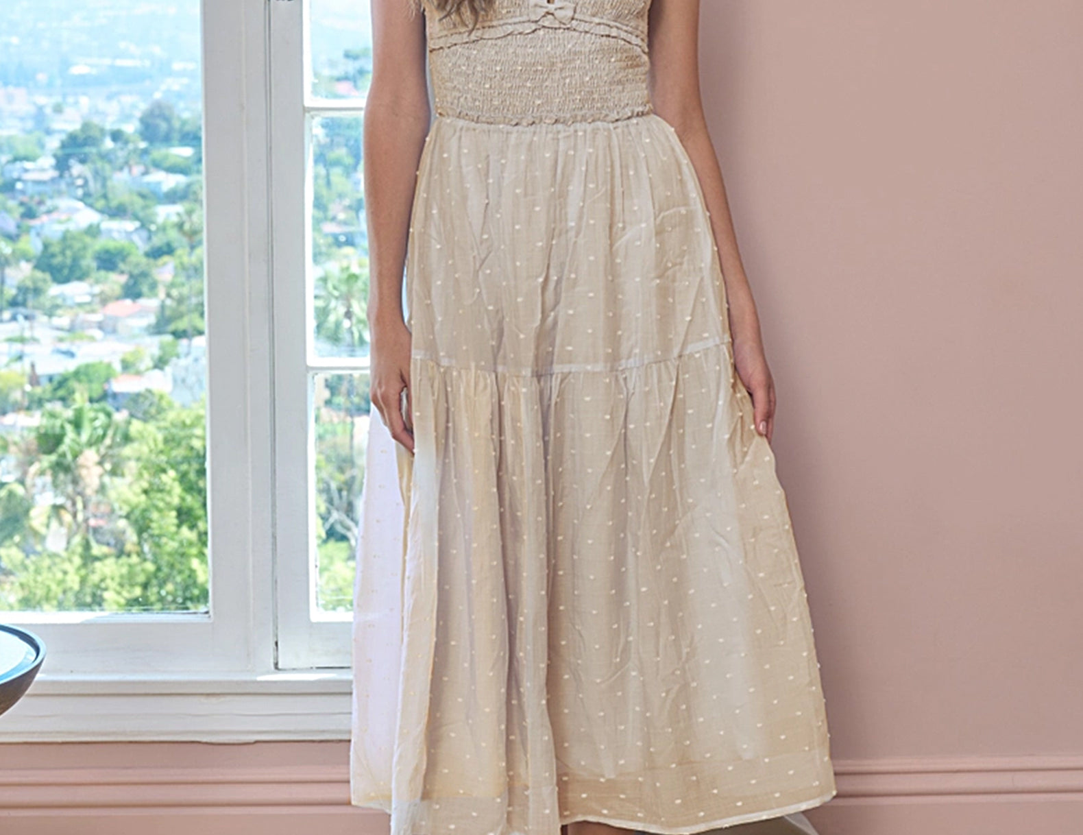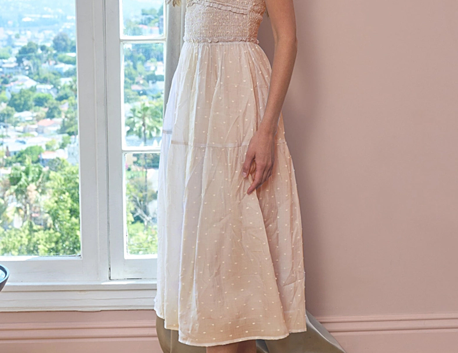 Feminine and vintage-inspired in almond white, the charming Claudia dress is all about the details. It's done in a sheer, clip-dot tencel fabrication, with a stretch-infused smocked bodice above a full tiered skirt. Small bows punctuate peekaboos at the bust, and ruffles trim the seams and straps. Make this romantic midi dress complete with a vibrant lip and your favorite perfume.