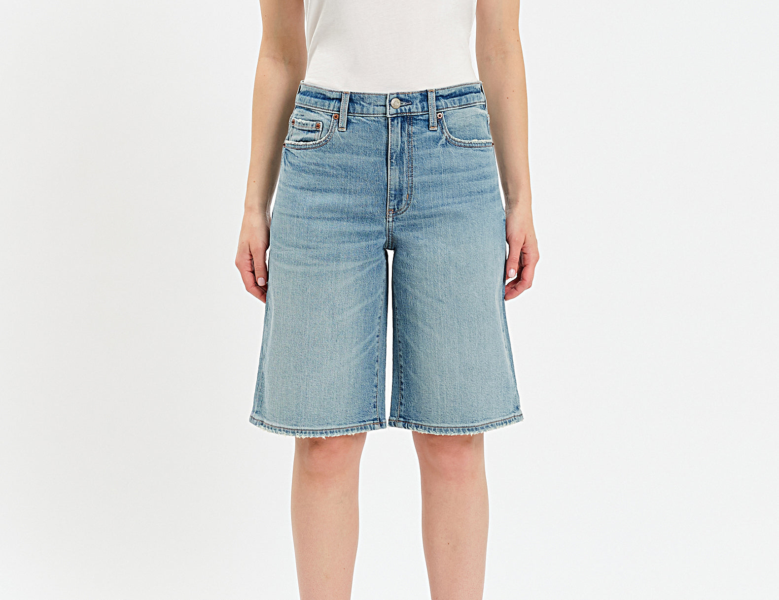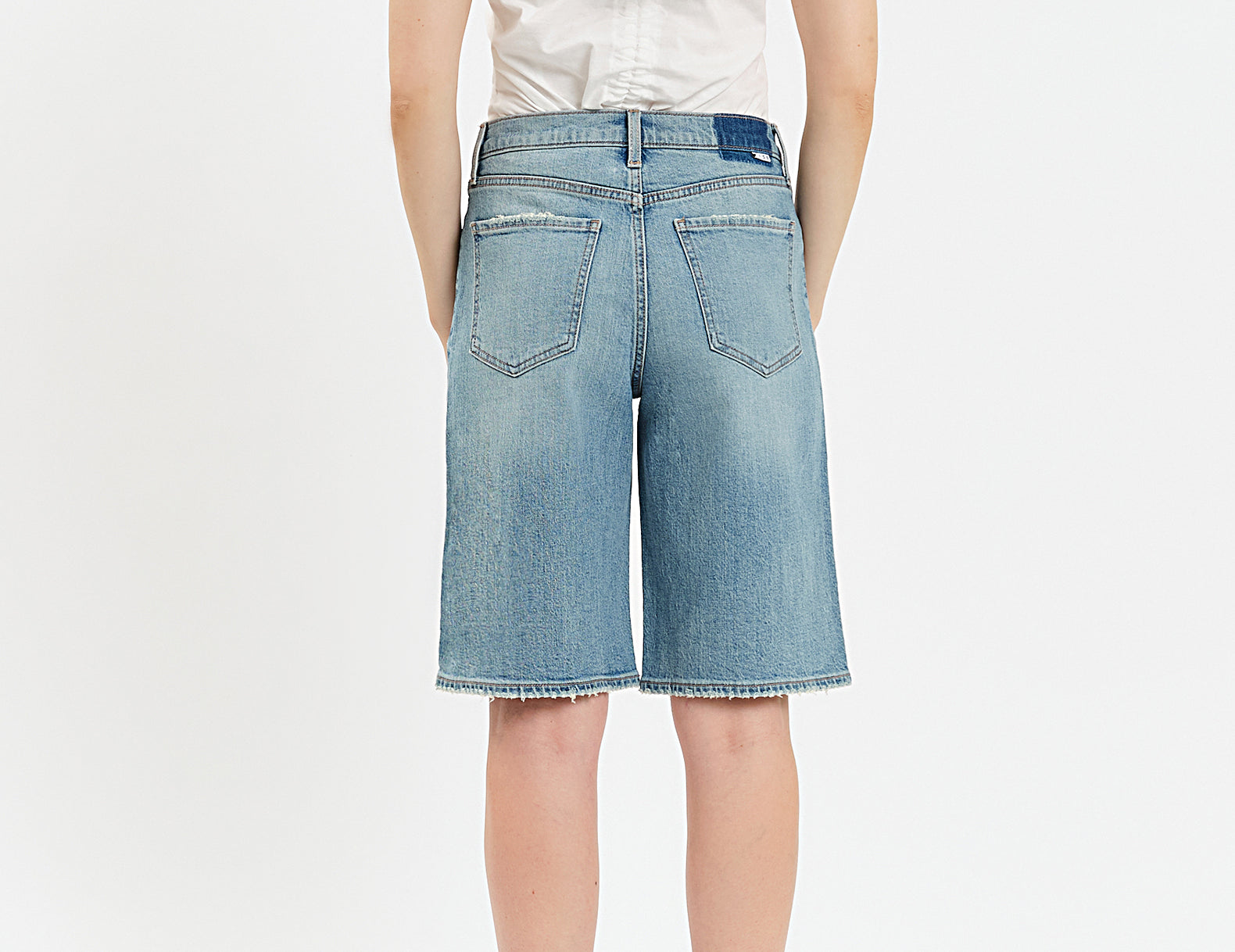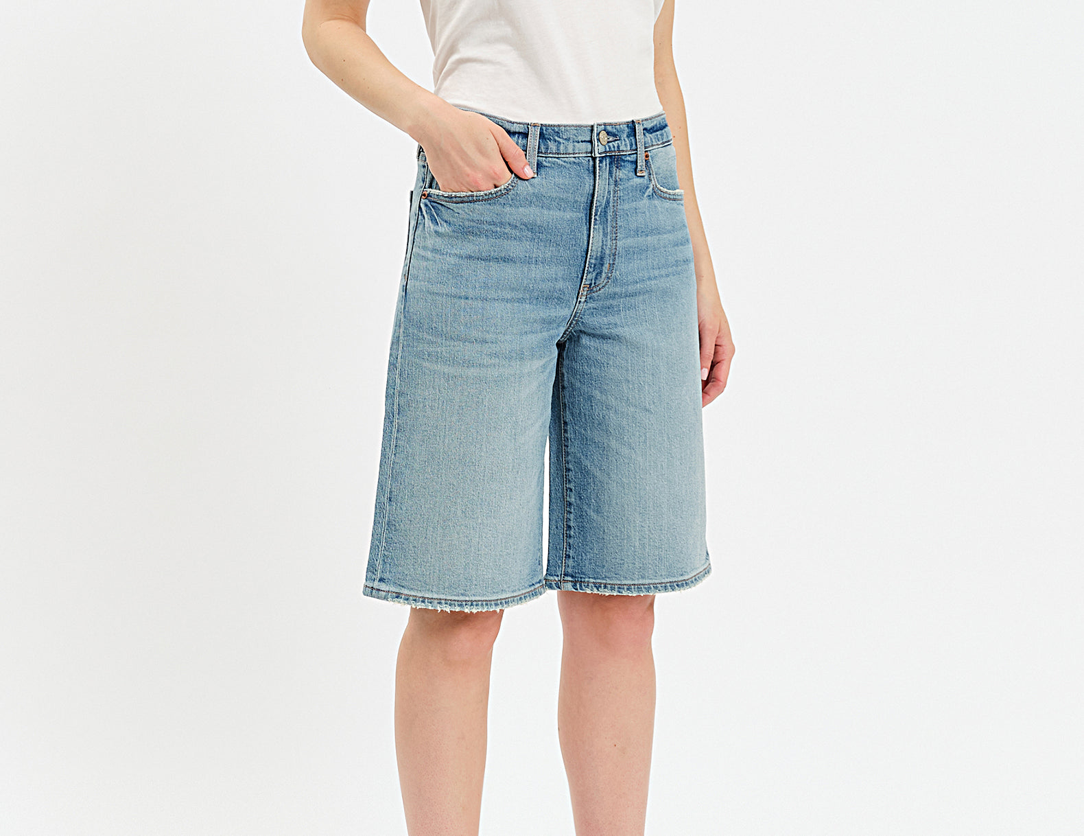 Ultra-relaxed in an oversized, long-length cut, the Cruiser Jorts by Daze Denim are a cool-girl pick for low-key days. They're done in a medium wash, rigid denim with a mid-rise waist and a wide-leg shape. Finished with five classic pockets, pair these knee-length denim shorts with a fitted tank, stacked necklaces, and kitten heels, or try them with a crisp button-up, socks, and loafers for a menswear-inspired look.