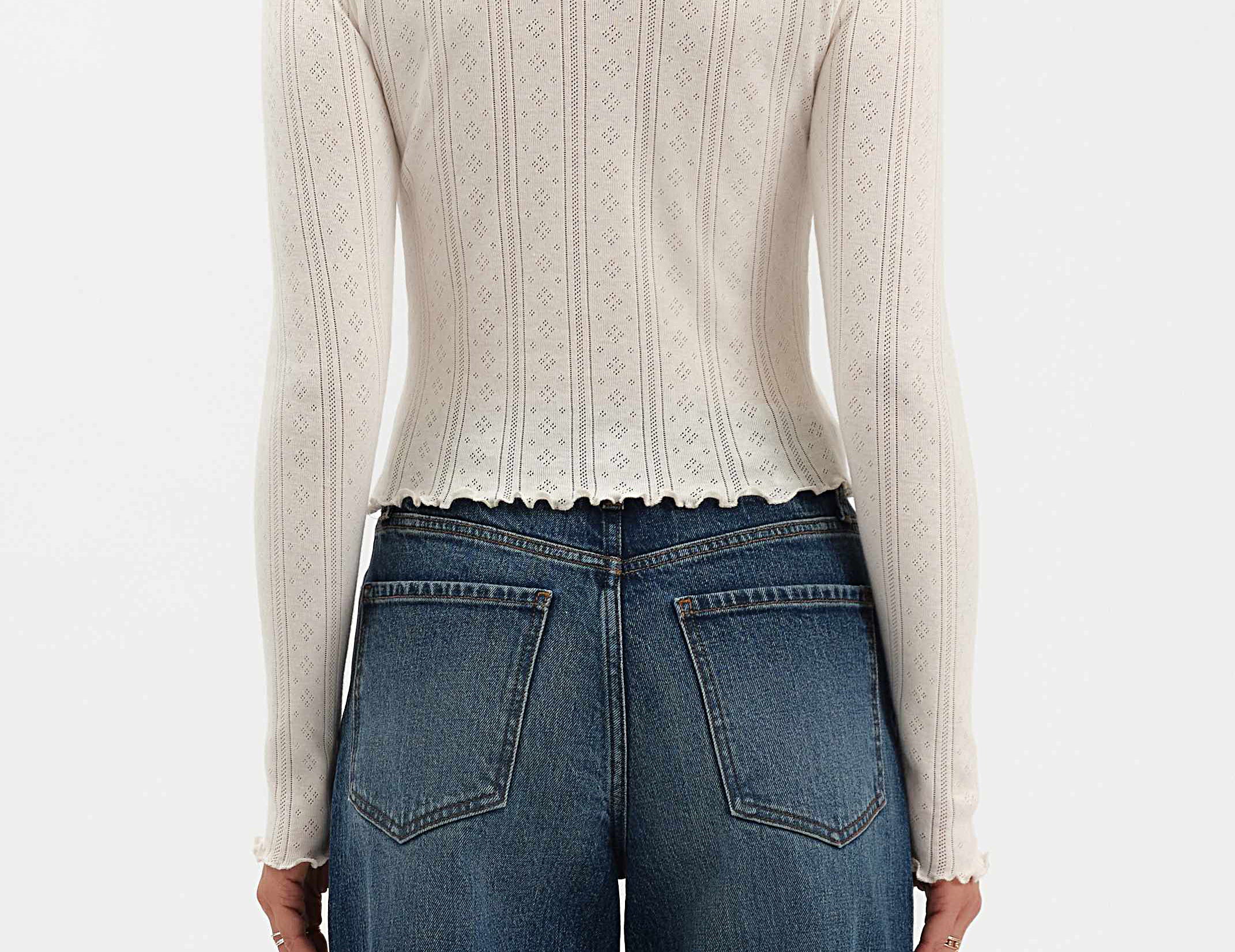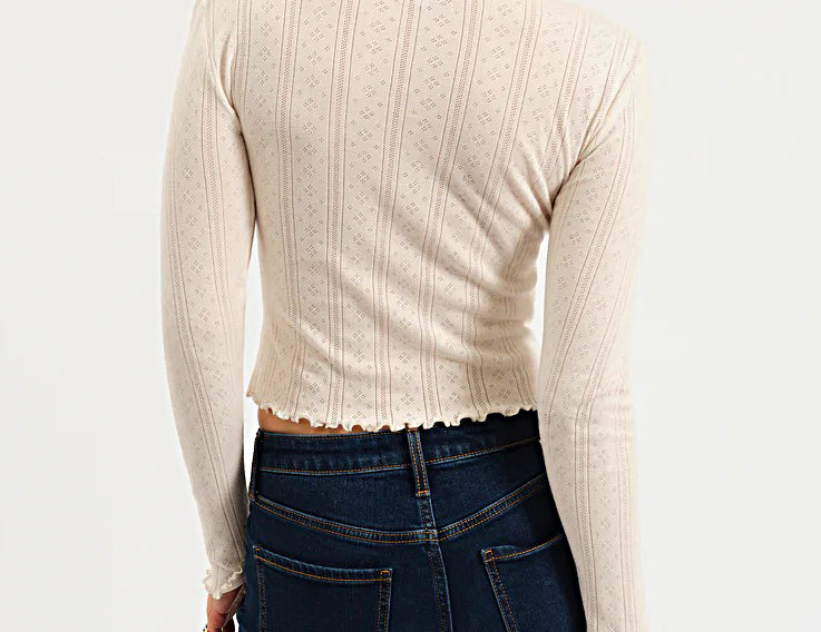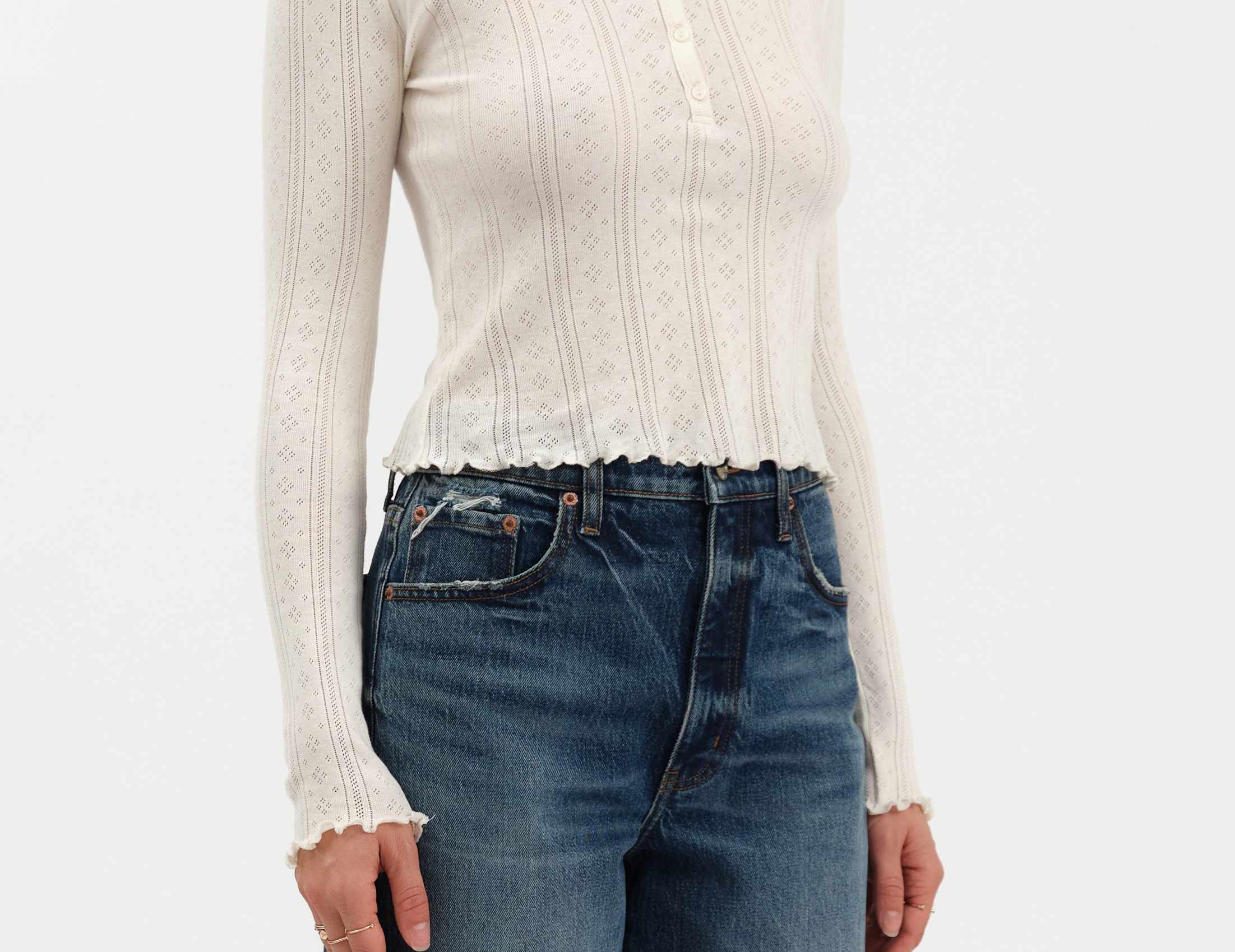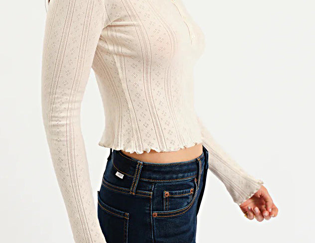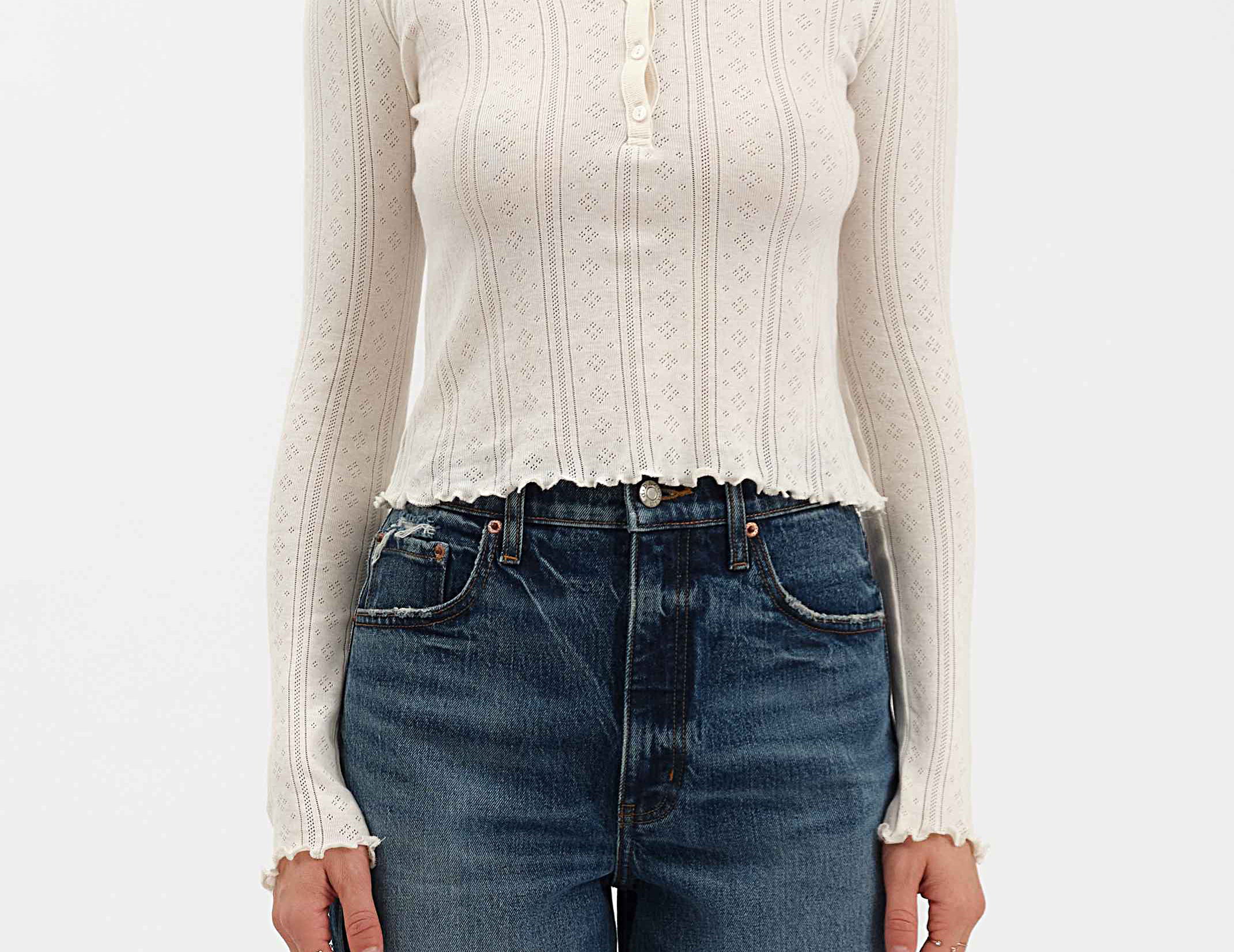 Nearly sheer in a pretty pointelle knit, this 90s-inspired henley top from Daze is designed in an airy cream cotton knit with lettuce ruffled hems and slim, long sleeves. Soft and stretch-infused in a fitted, hip-grazing silhouette, finish this V-neck top with washed denim and sneakers, or add a romantic touch with a silken midi and mary jane flats.