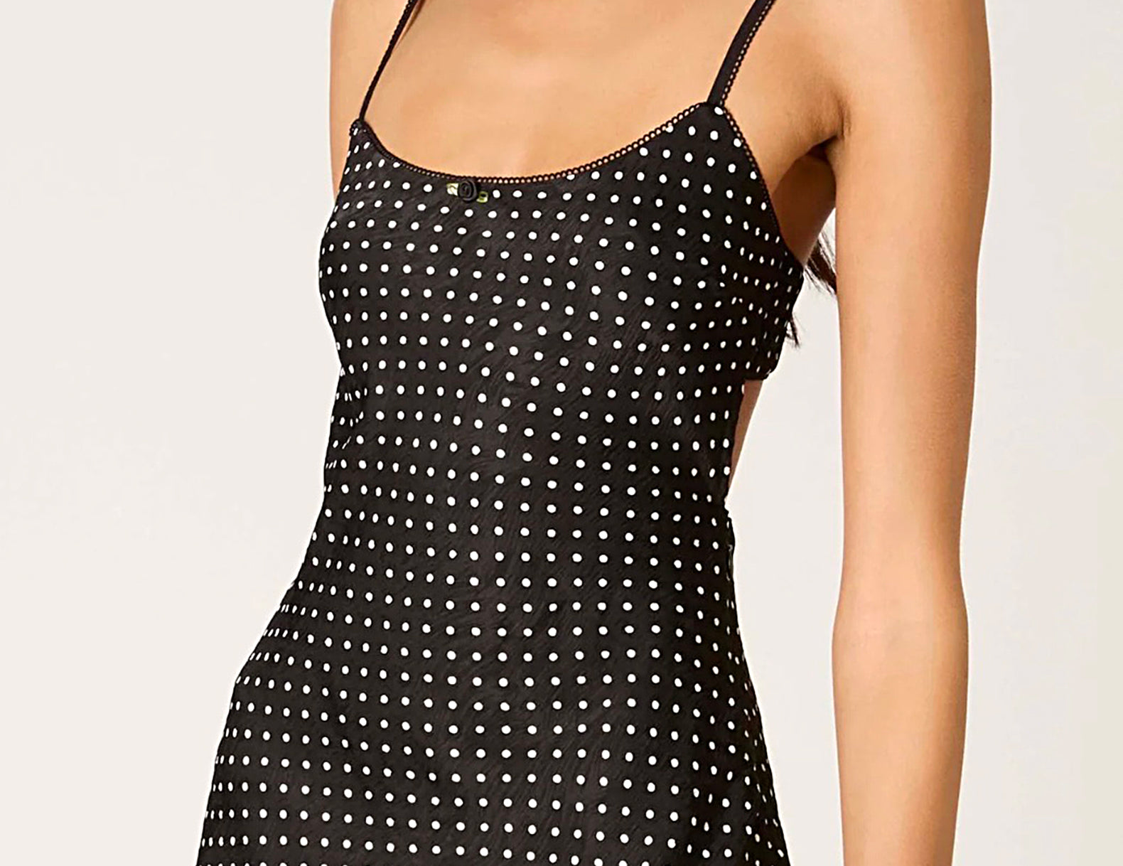 - Scalloped trim at the edges of the neckline, straps, and open black