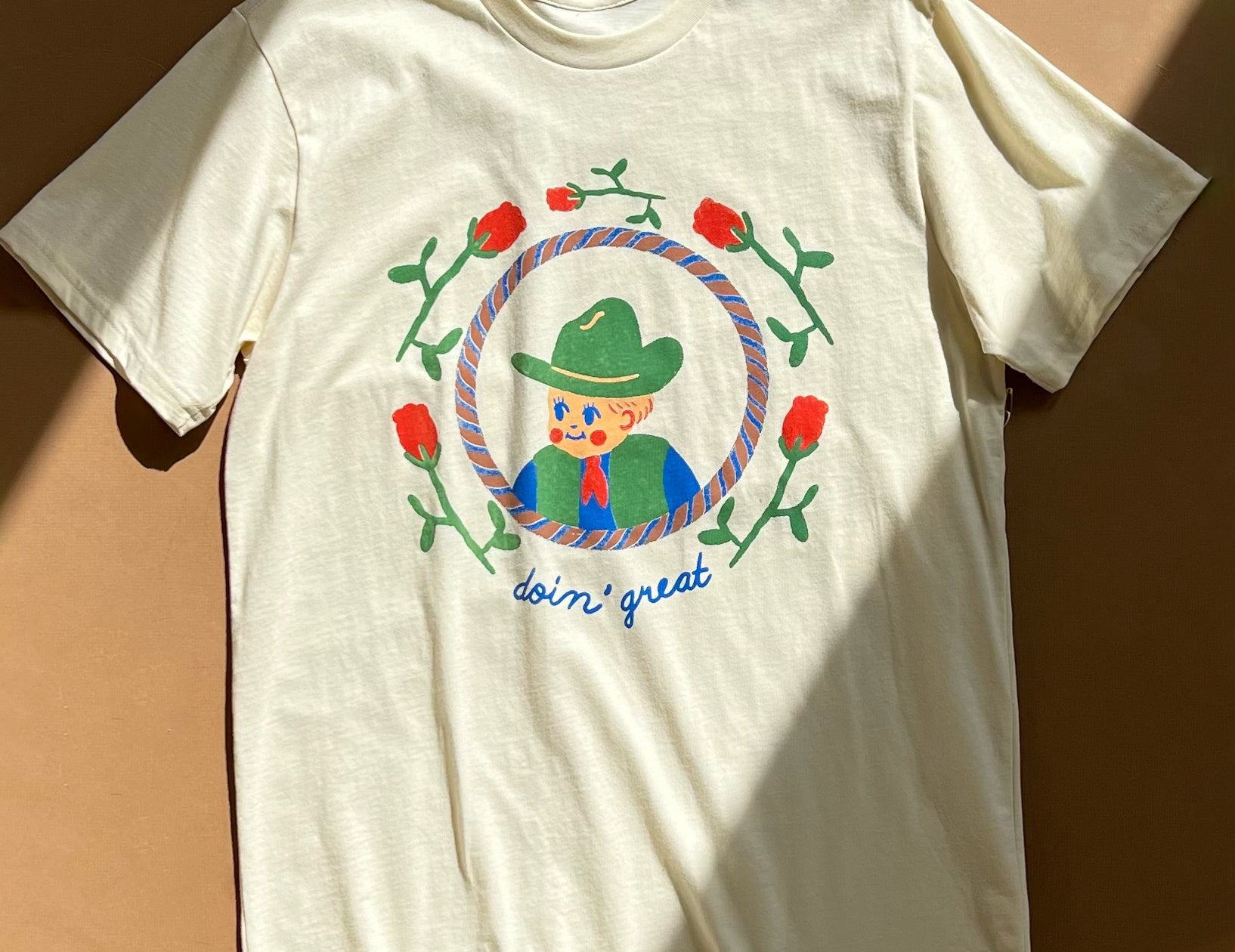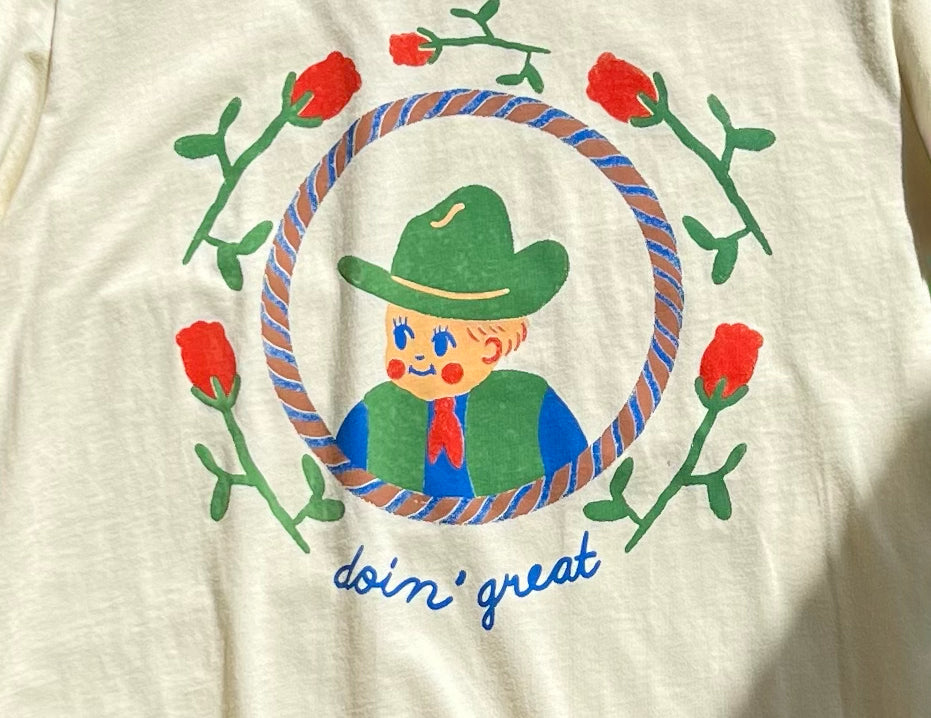 Blending western charm and positive vibes, the “Doin’ Great” tee features a kewpie ranger with floral accents against a soft and breathable cotton. Relaxed and longline in a unisex fit, this tee is perfect for everyday wear with shorts, denim or a vintage broomstick skirt.