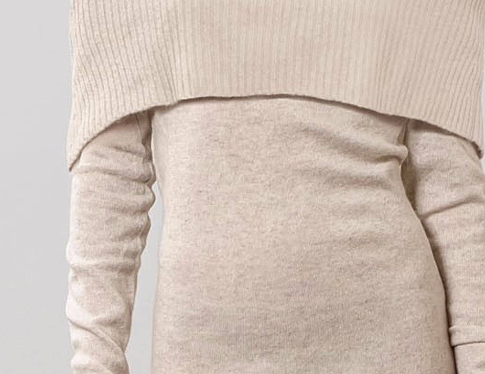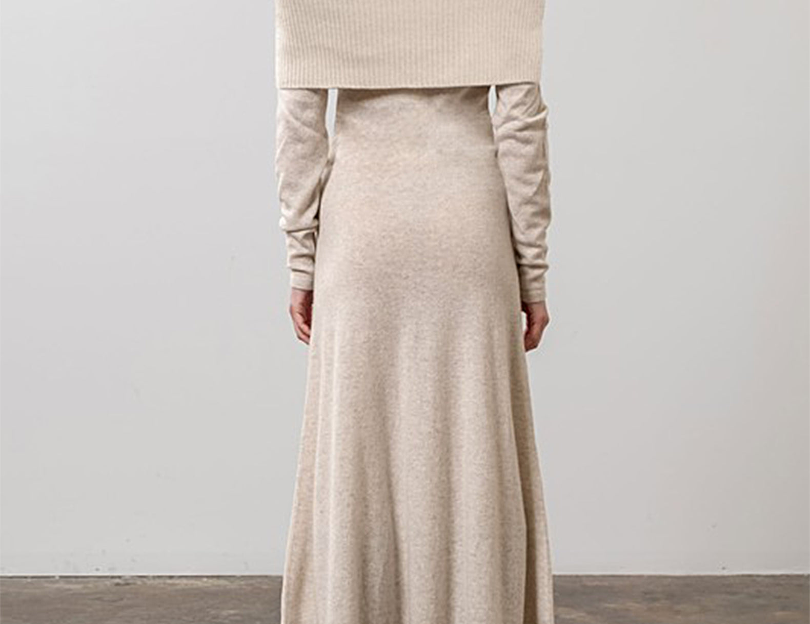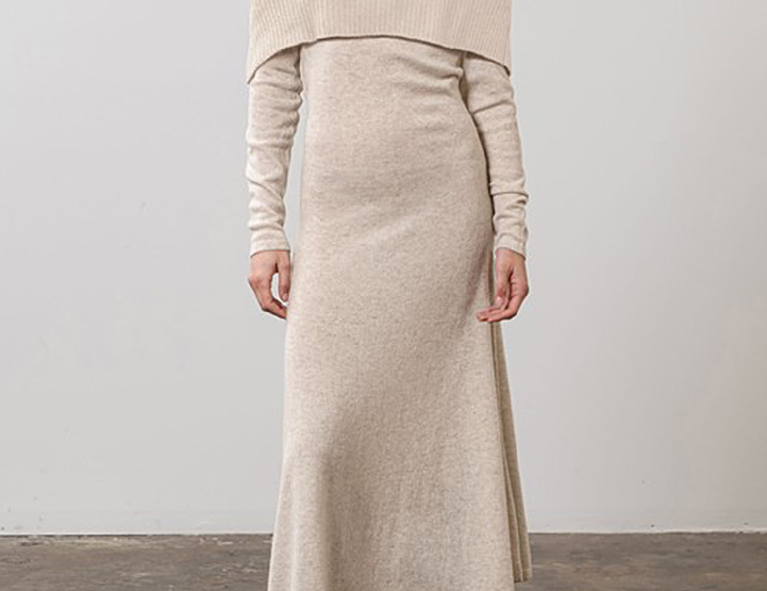 Modern and elegant in a warm ecru, this elevated sweater dress features a slim, longline silhouette that flares at the hemline with a folded, off-the-shoulder neckline in a ribbed knit. Soft and warming in a lightweight knit with extra long, slim sleeves to finish—make the Dylan celebration-ready with spiked boots and gold jewelry.