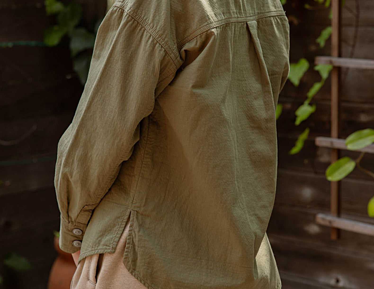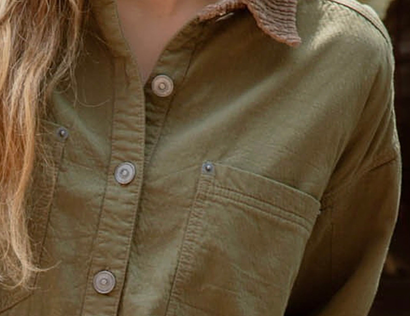 Done in a soft yet sturdy washed cotton, cut to an oversized fit, Eleanor has that borrowed-from-your-boyfriend feel. It features a contrasting latte brown corduroy collar, oversized chest pockets with rivet detailing, and a curved shirt hem for a relaxed finish. Pop it on over cropped wide-leg trousers and sneakers, or wear it open as a lightweight jacket.