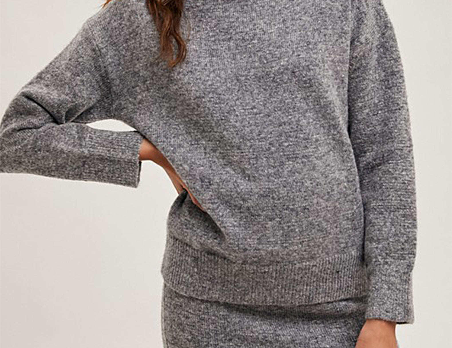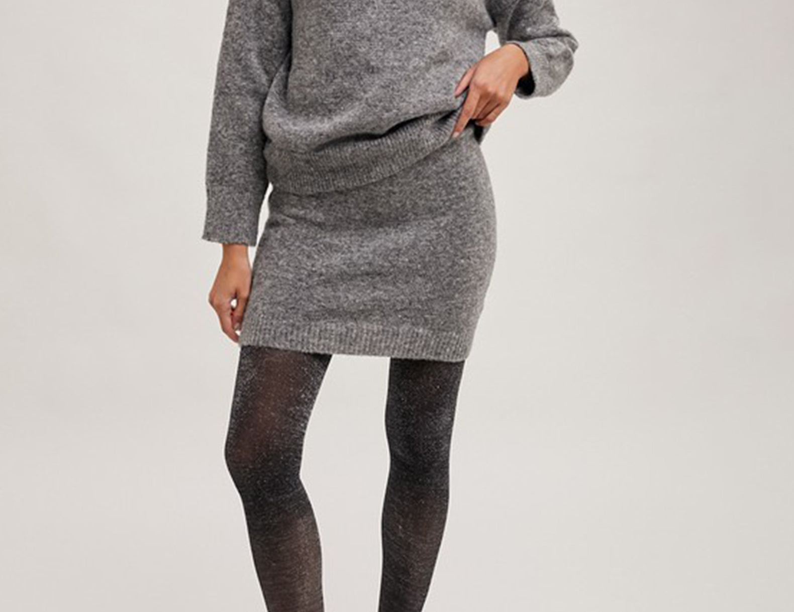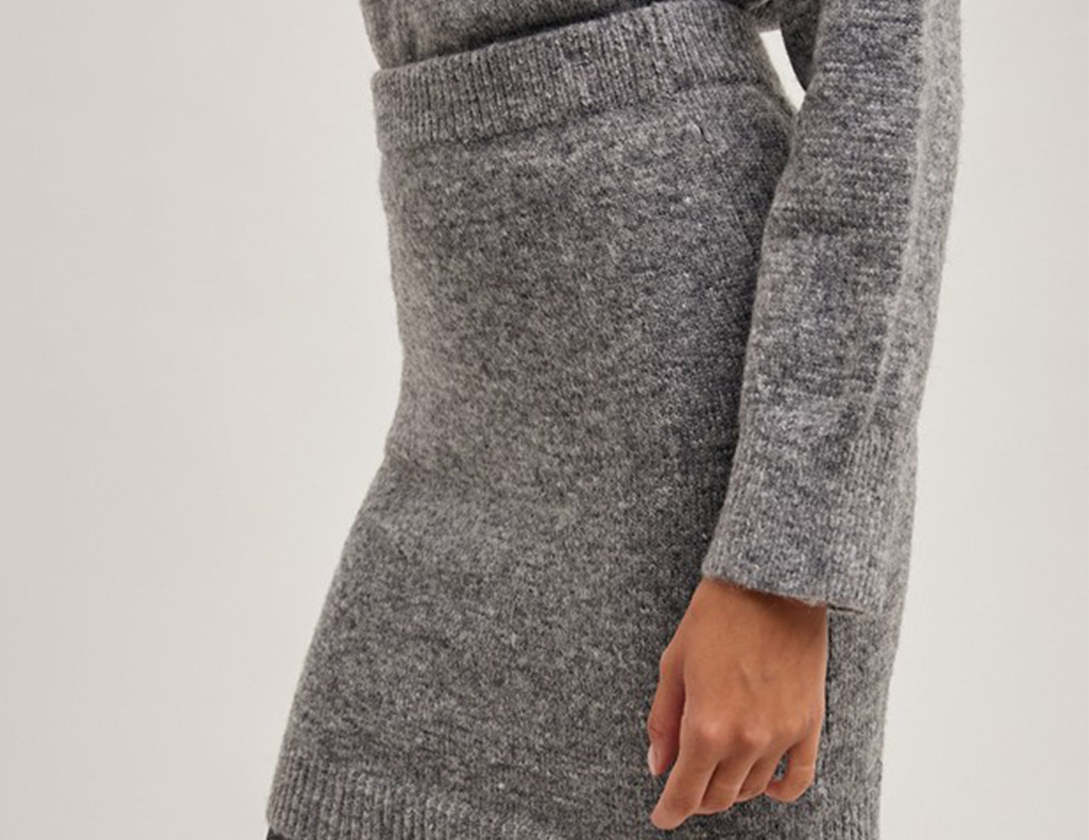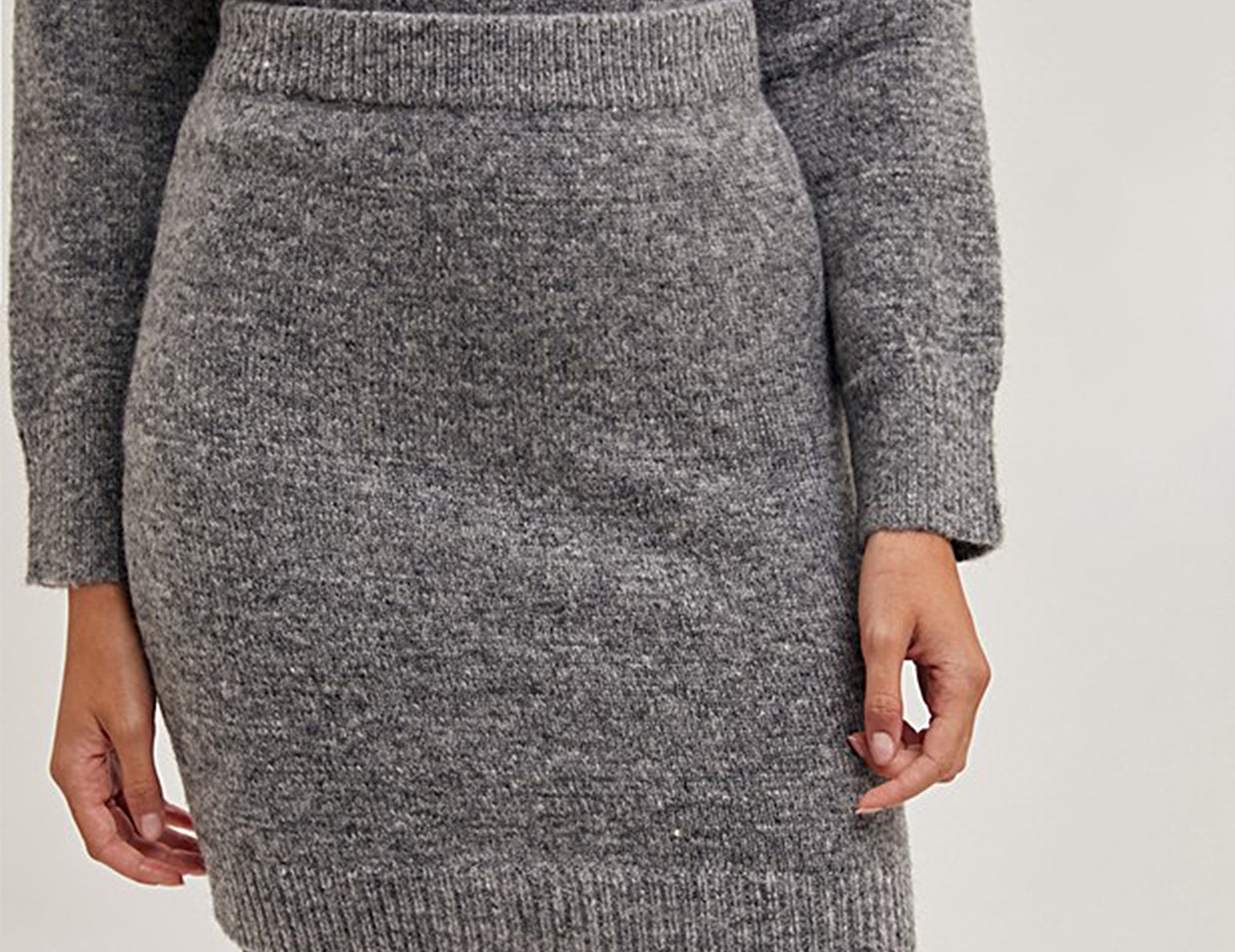 Staple knitwear in a mini pencil silhouette, the Eliana skirt is designed in a plush, heather grey knit with a ribbed hem for a slim, curve-loving finish. Warm, cozy and so easy to wear in a stretchy, pull-on fit—make it a flawless monochromatic set with the matching Eliana Heather Grey Turtleneck Sweater.