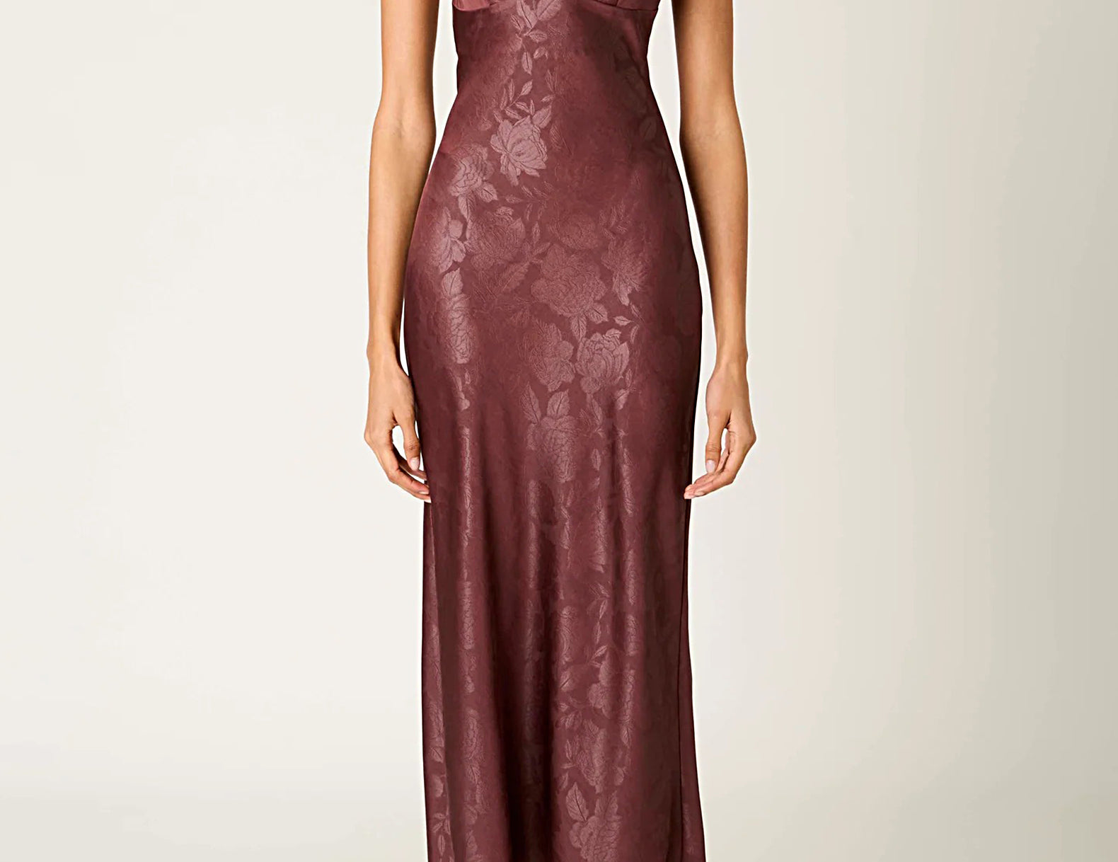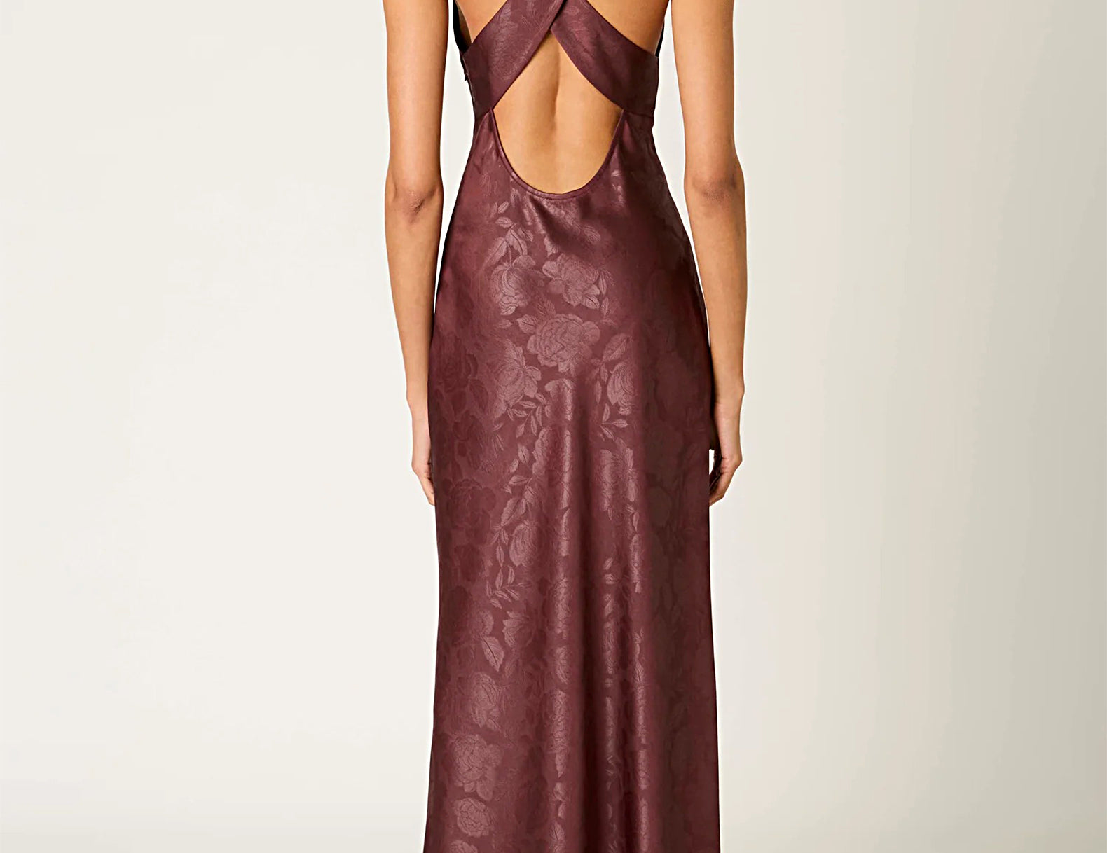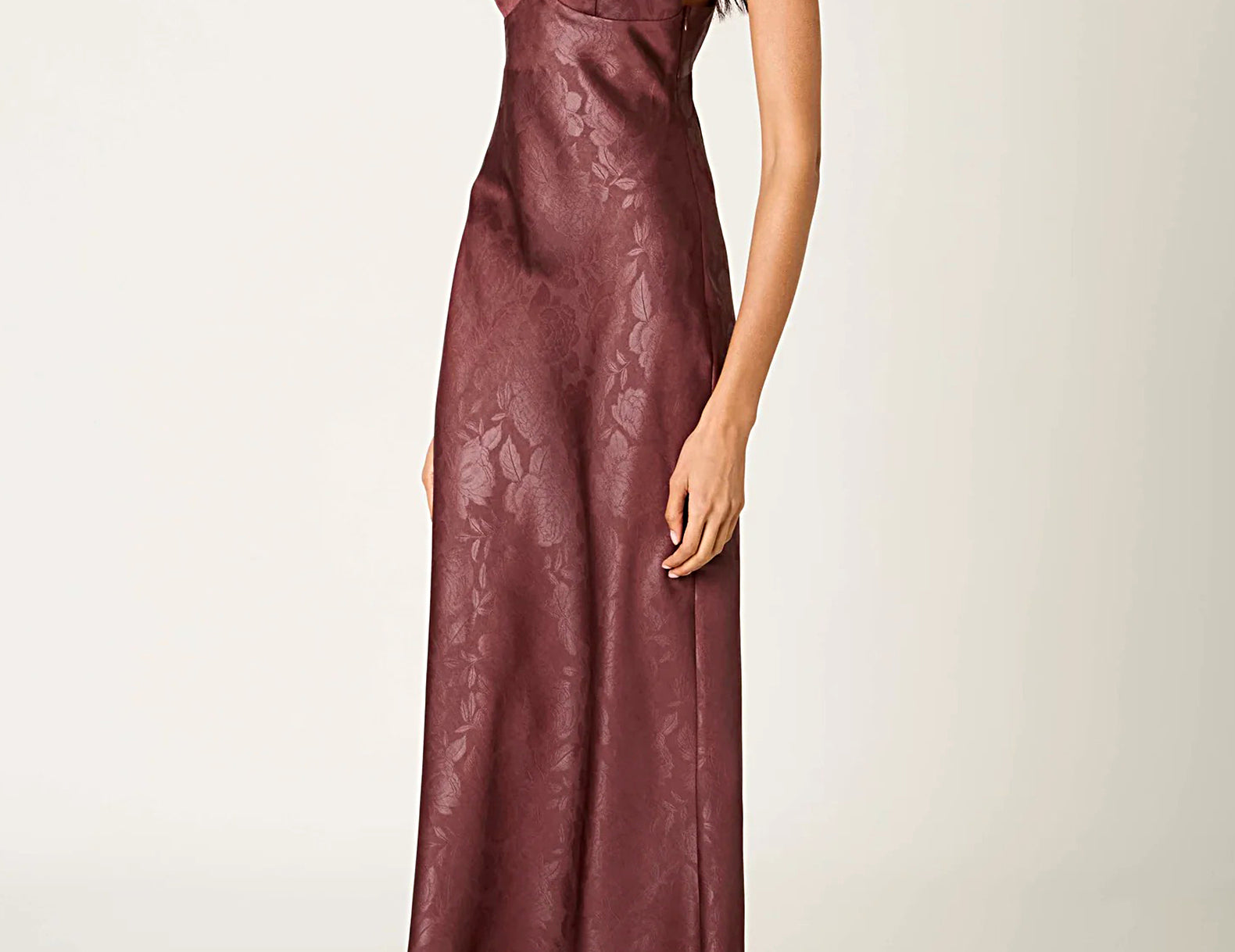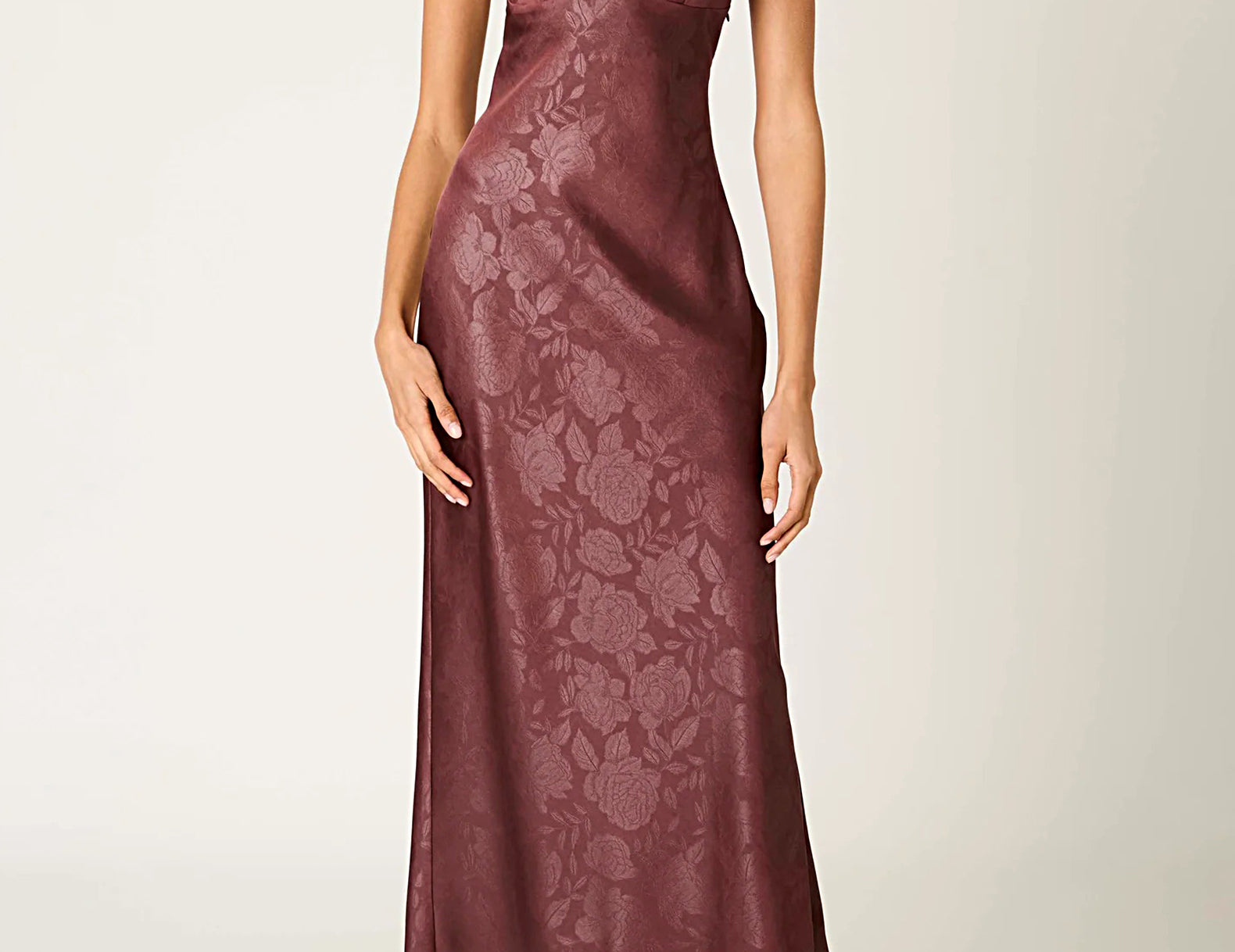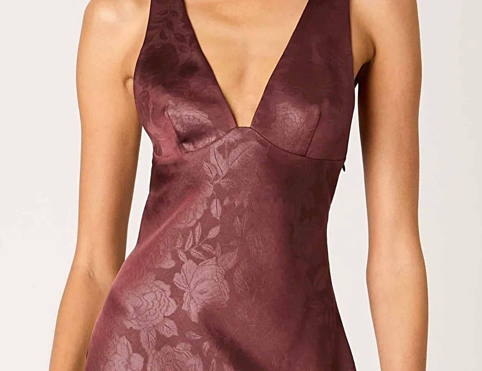 Done in a striking, glossy jacquard rose print fabrication, the Elowen dress is a cool-girl take on romance. The tonal, matted sheen finish has a leather-look, but is soft to the touch and wears comfortably. At the top, a plunging neckline over an empire waist. At the back, criss-crossed straps over a scooped, open back. Pair this deep burgundy midi dress with black kitten heels and layered necklaces, or try it layered under a loose-knit sweater with boots.