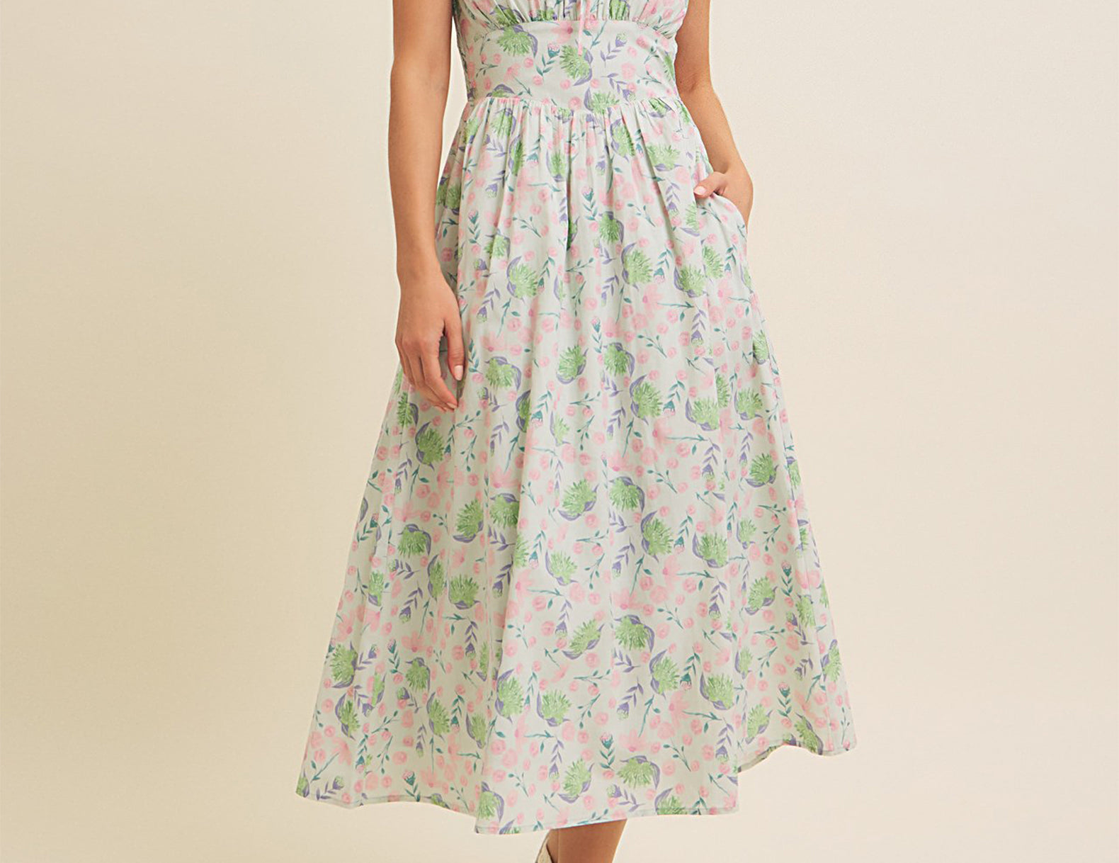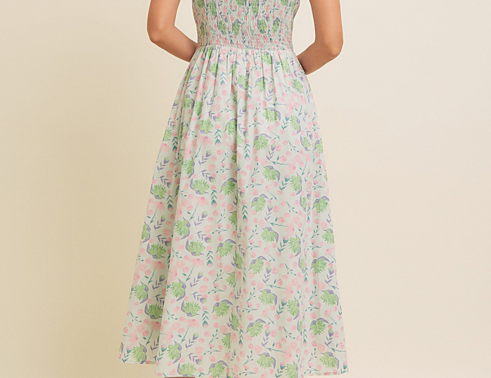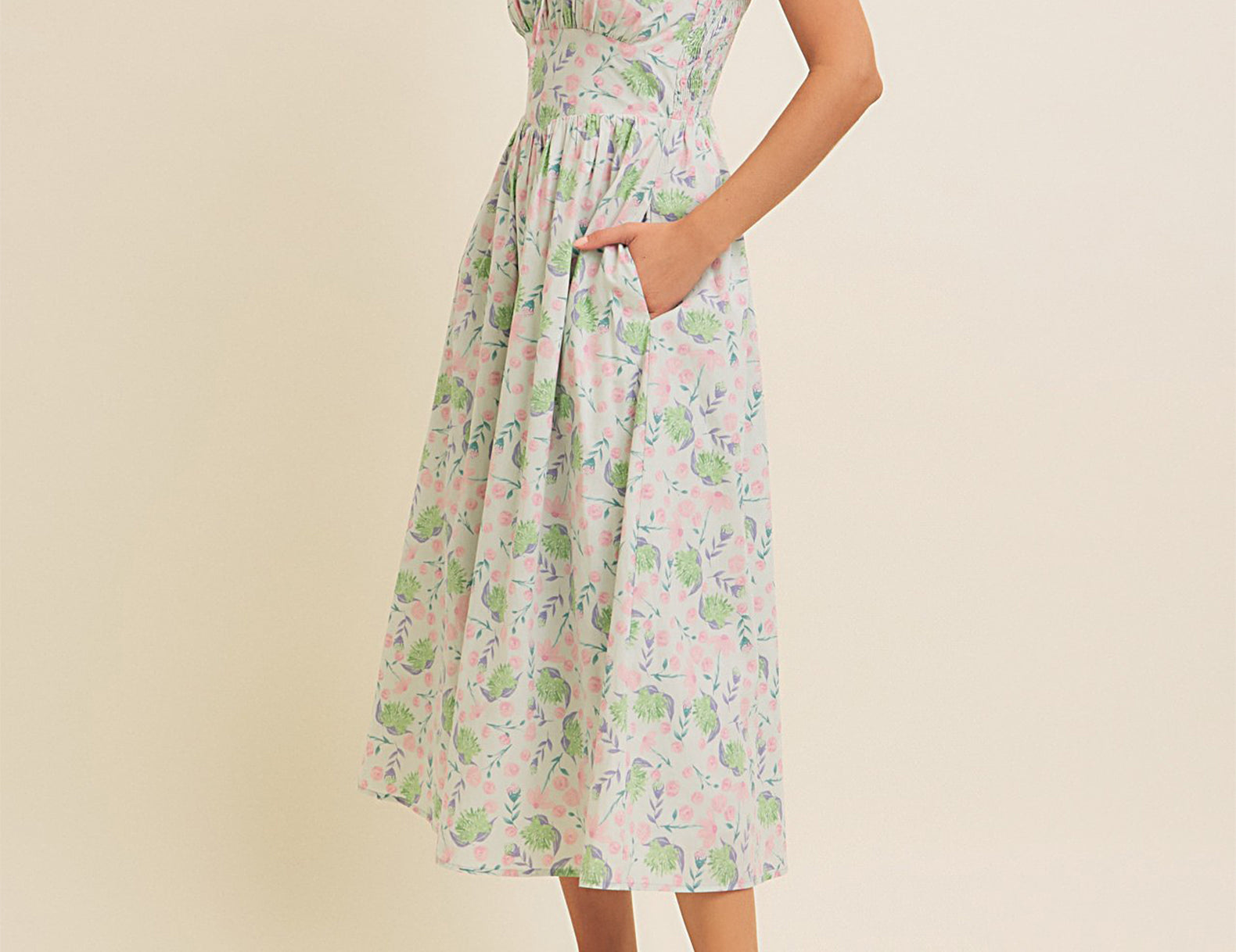 Blooming pastel florals against a vintage-inspired silhouette, this dreamy sundress features a smooth and structured bodice with a stretch-infused, smocked back and buttoned straps. Cut from an airy cotton with a billowy skirt and essential side pockets, give the Emery a summery finish with white heels or chunky sandals.
