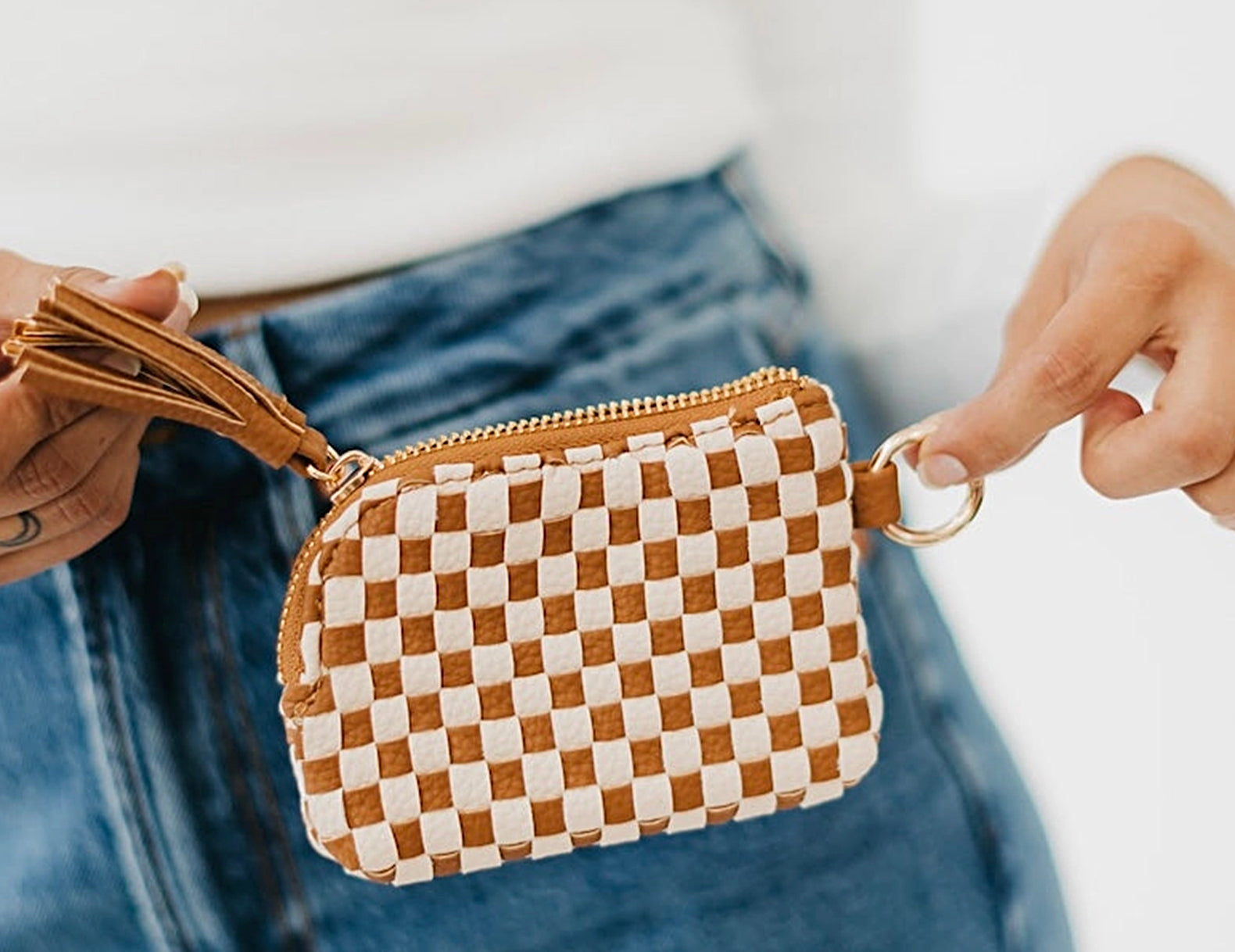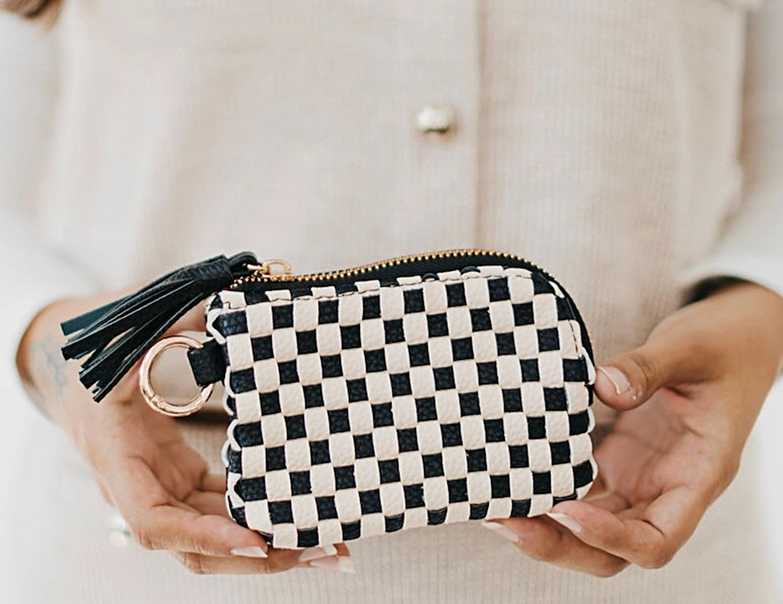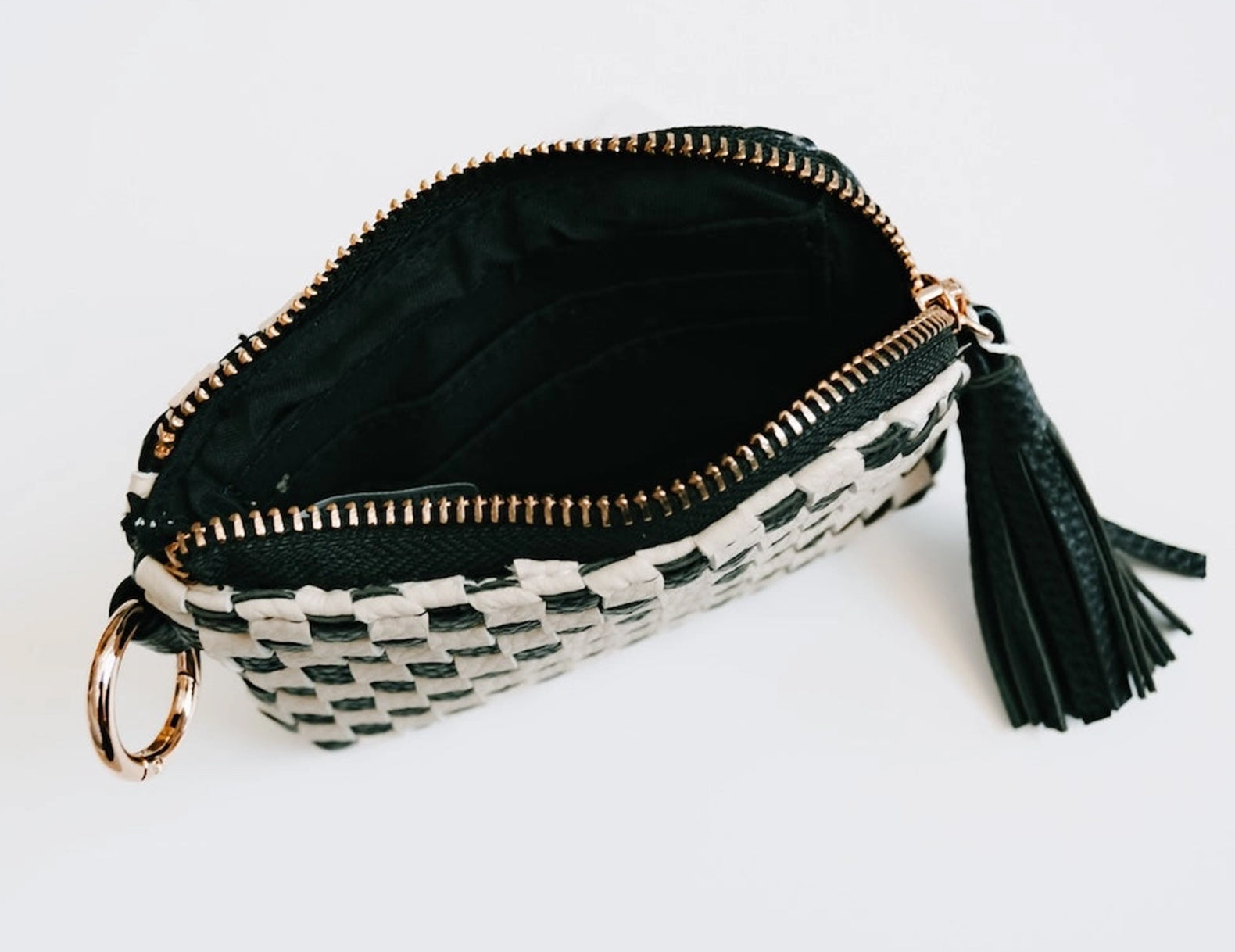 A texture-rich wallet for just the essentials, Evita is both functional and eye-catching. The tasseled zip closure wraps around two sides, opening up to a lined interior that's roomy enough for cash, cards, and a lip balm or two. It's done in both a solid weave and a checkered option, and finished with an o-ring clip to secure it to your purse or a belt loop.