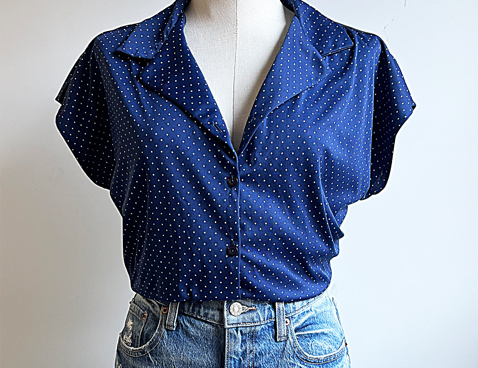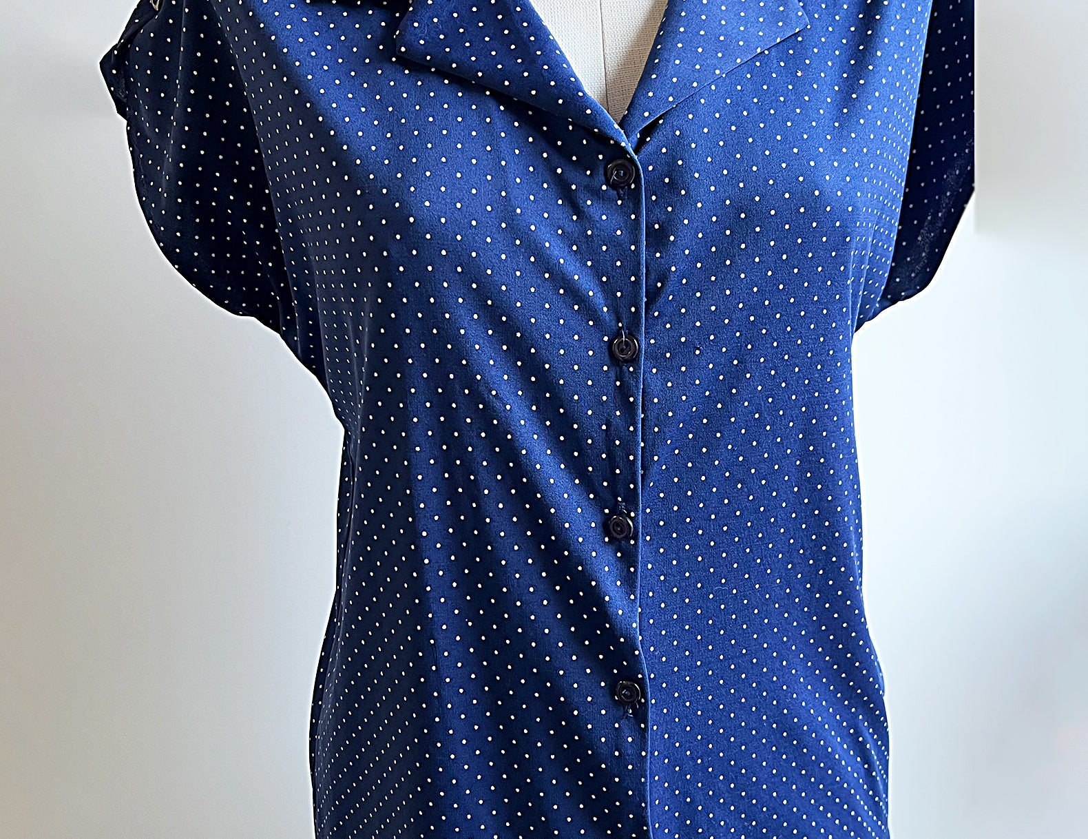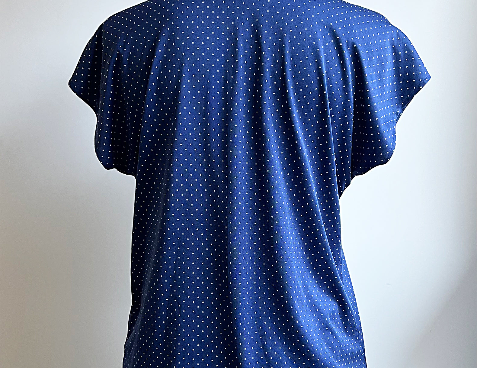 - A timeless navy polkadot blouse with a soft drape and an easy, flattering silhouette.