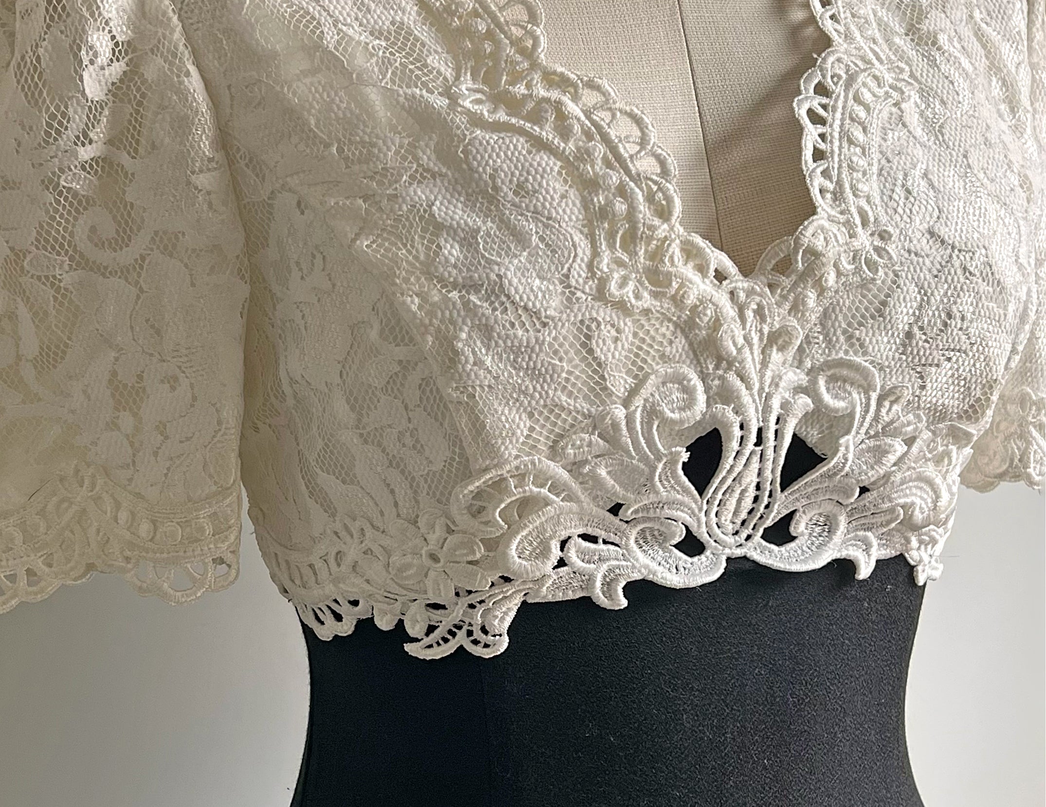 - Scalloped lace trim along neckline, sleeves, and bodice