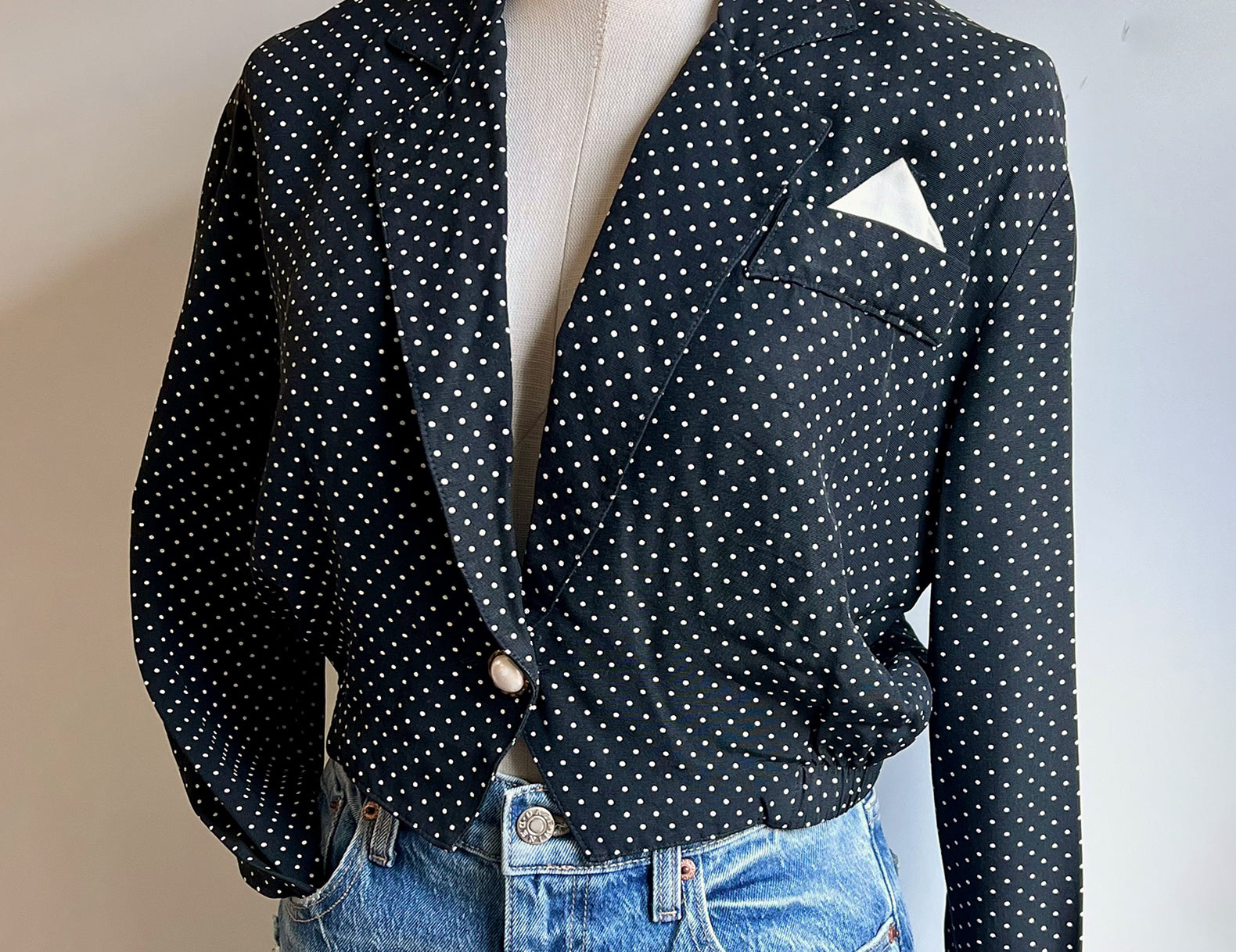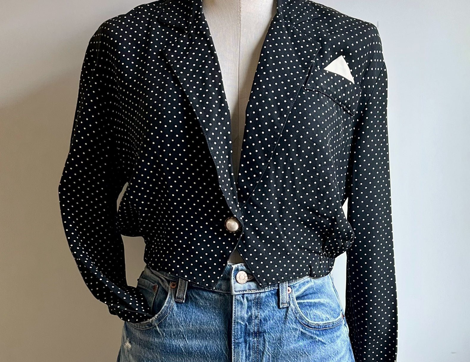 - A playful black polkadot blouse with a flattering cropped silhouette that feels equal parts vintage charm and modern styling staple.