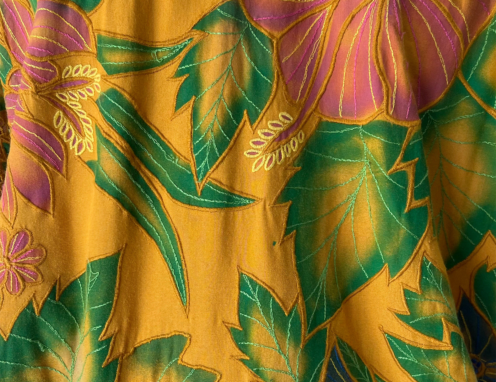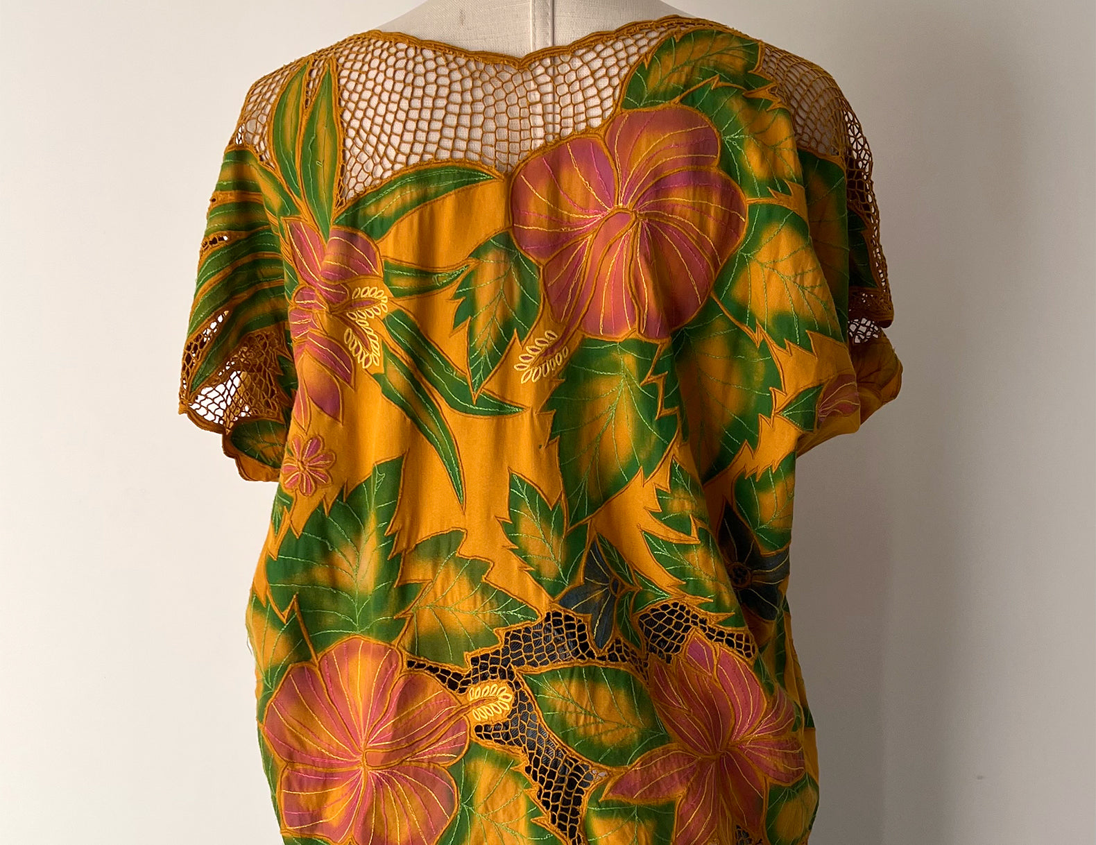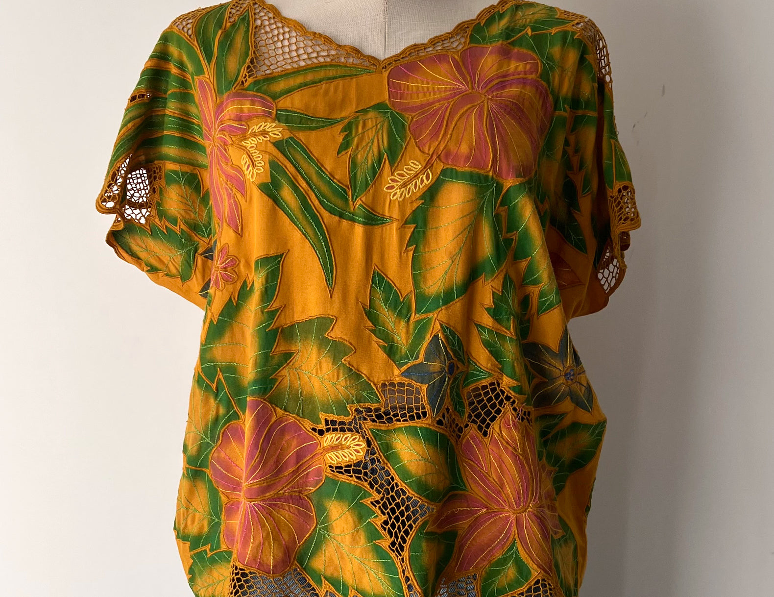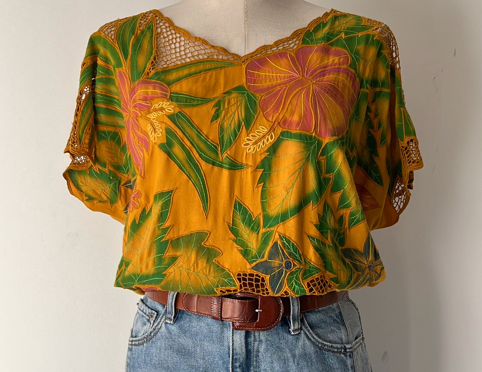 - Vacation-ready top featuring vibrant tropical florals with dimensional embroidery and openwork lace panels.