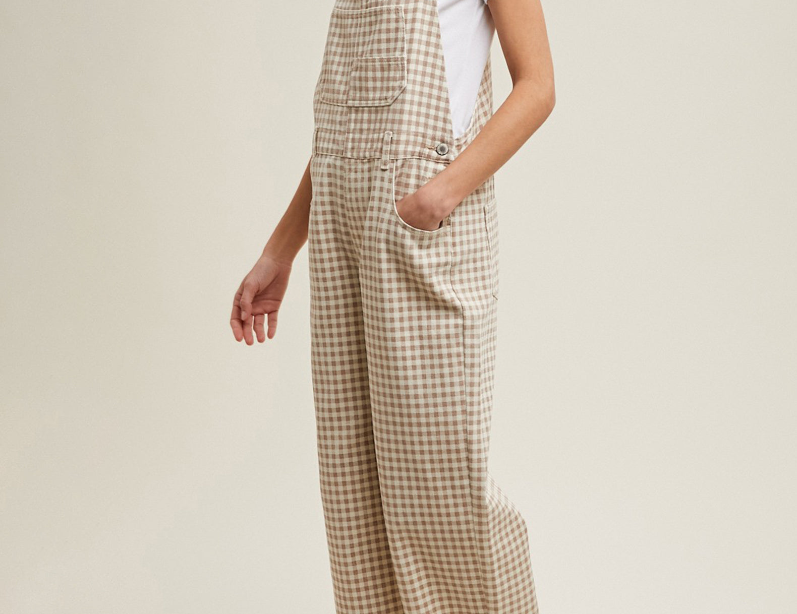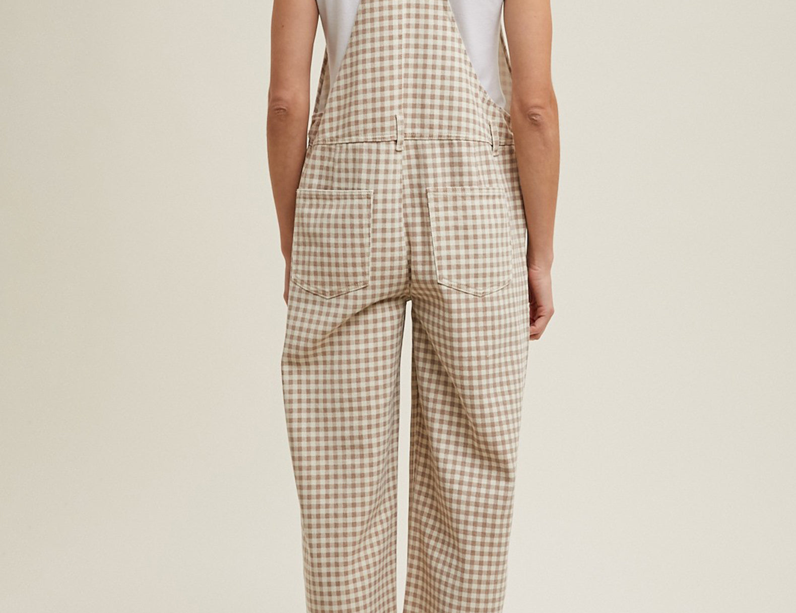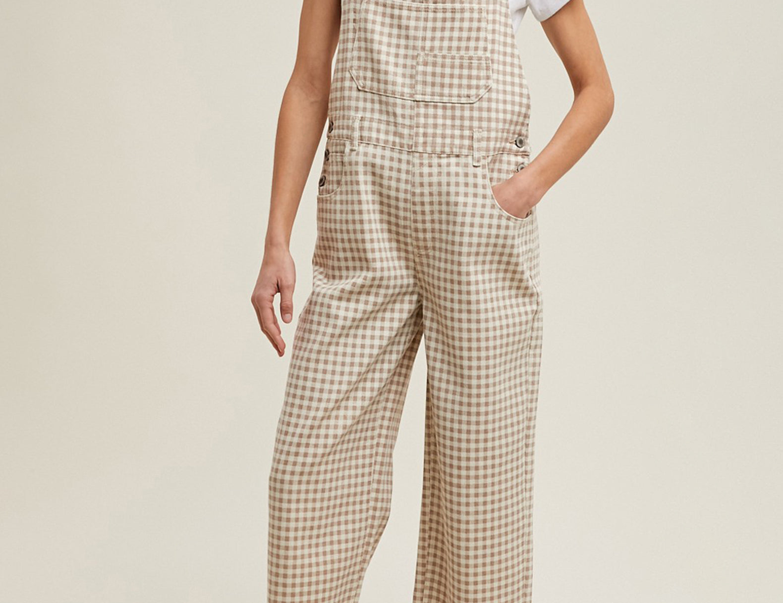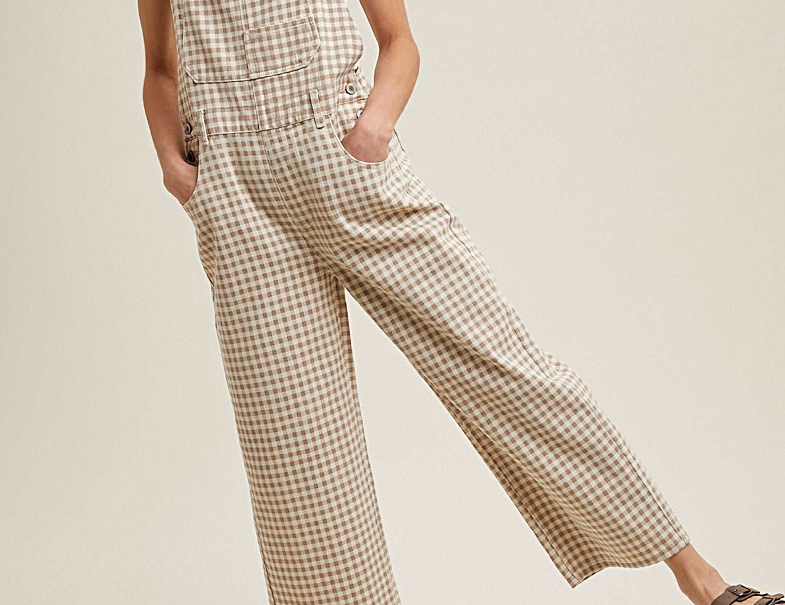 In a versatile, neutral, mocha brown gingham cotton, the Frankie overalls are a fun and easy, off-duty pick for weekend adventures. They feature a semi-cropped length, classic buckle shoulder straps, pockets on the bib, and a three-button closure at each side. Pair these with a soft crew neck sweater and sneakers, or try a crisp button-up and loafers.