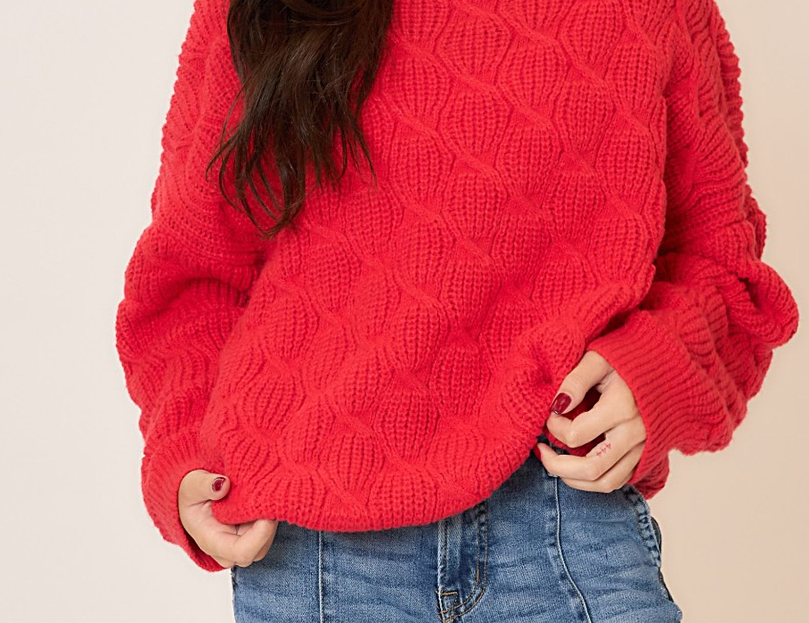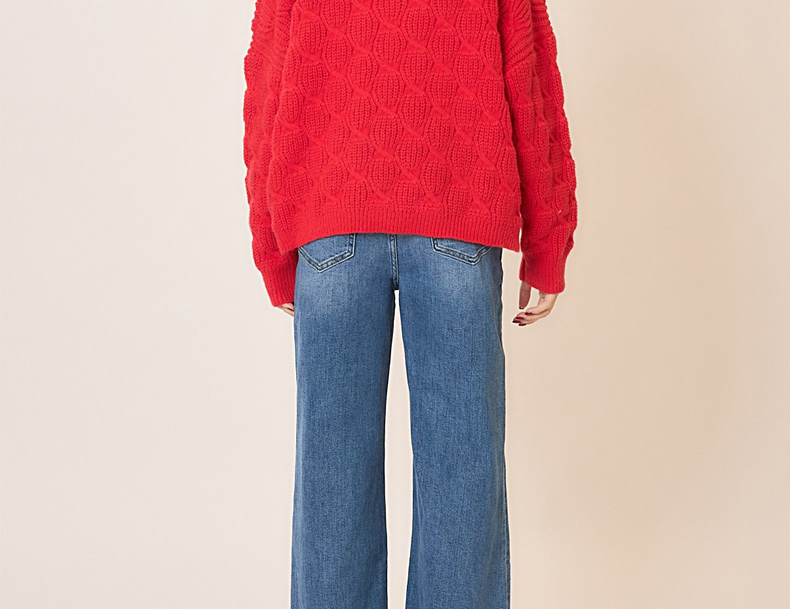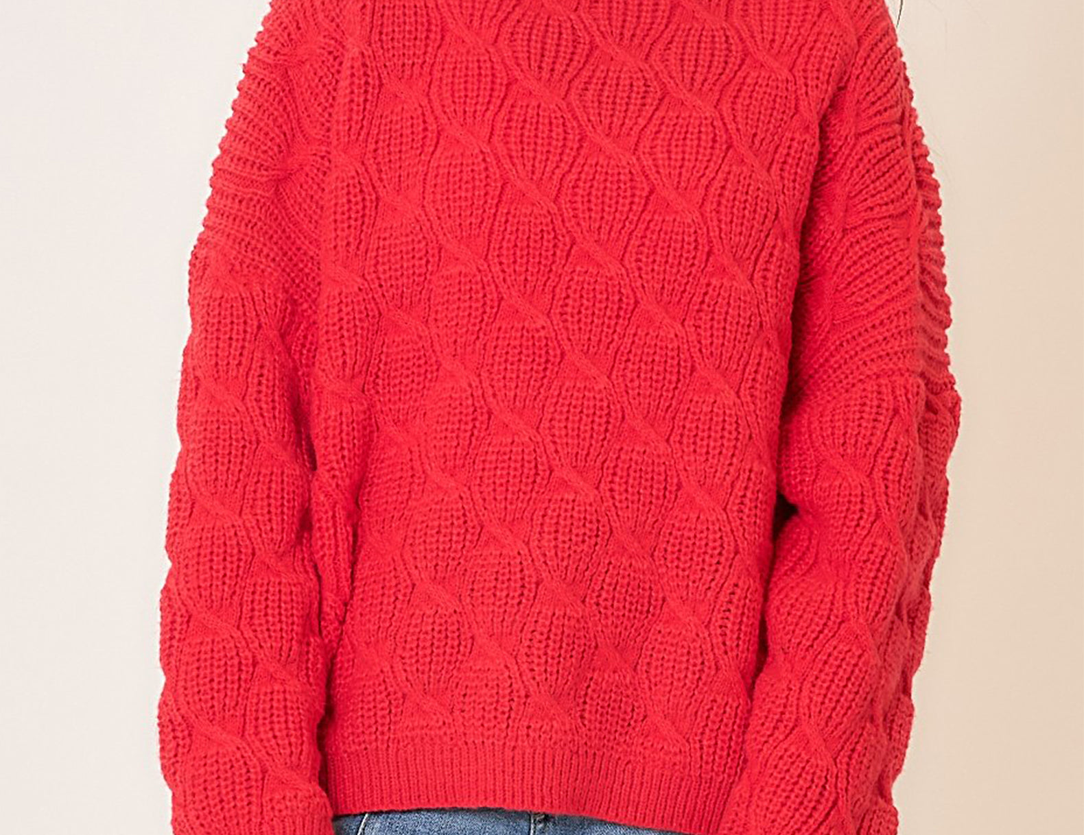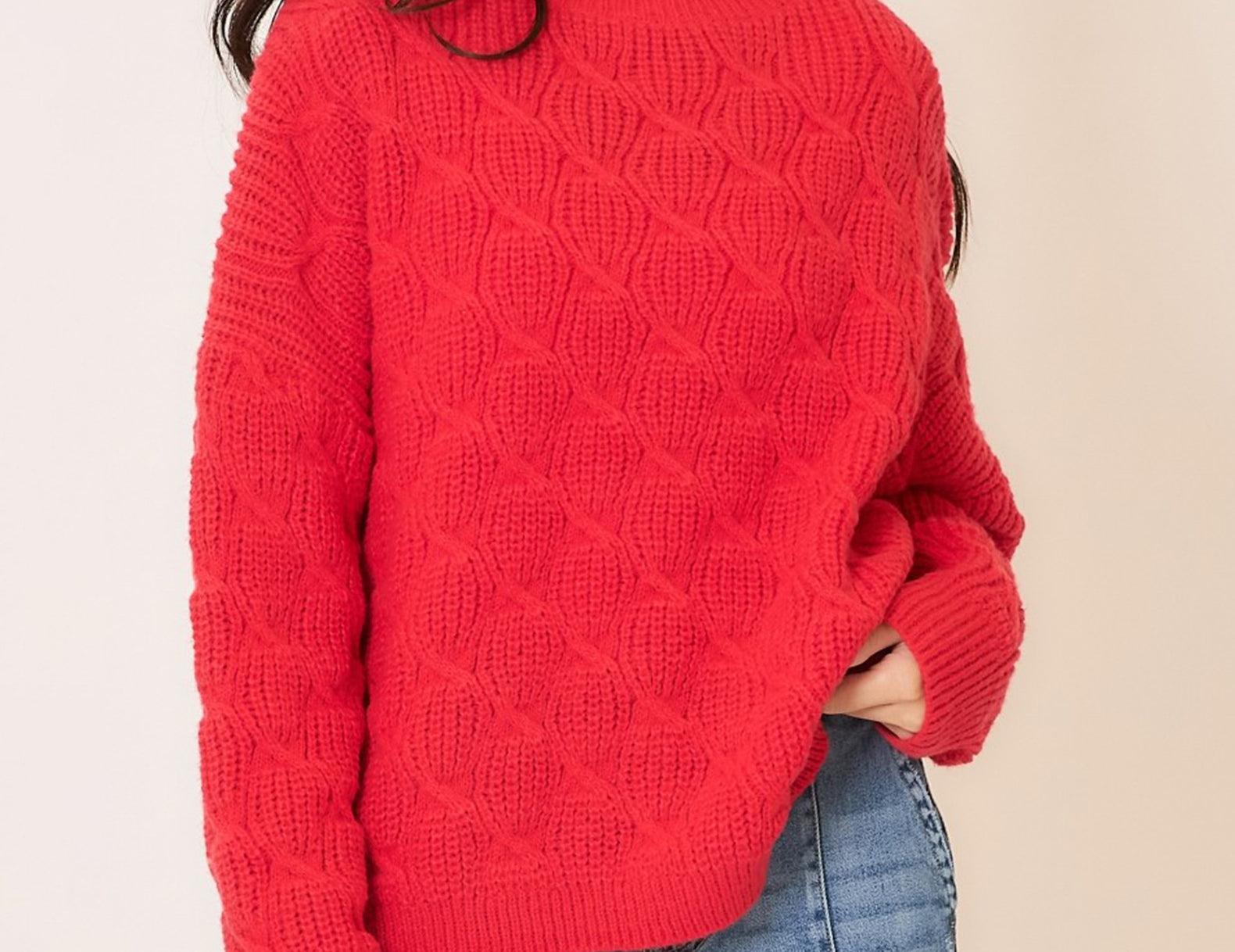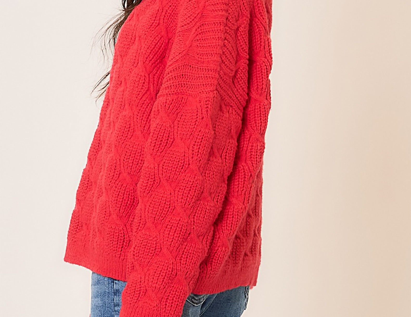 Vibrant and full of texture, the Freya sweater adds a pop of color to your sweater stack. It's done in a bright, cherry-red, weighted cable knit, cut to a hip-length boxy fit with long sleeves and a roomy mock neck. Top off a full skirt and tall boots for a festive gathering, or pair it back with slouchy jeans and sneakers.