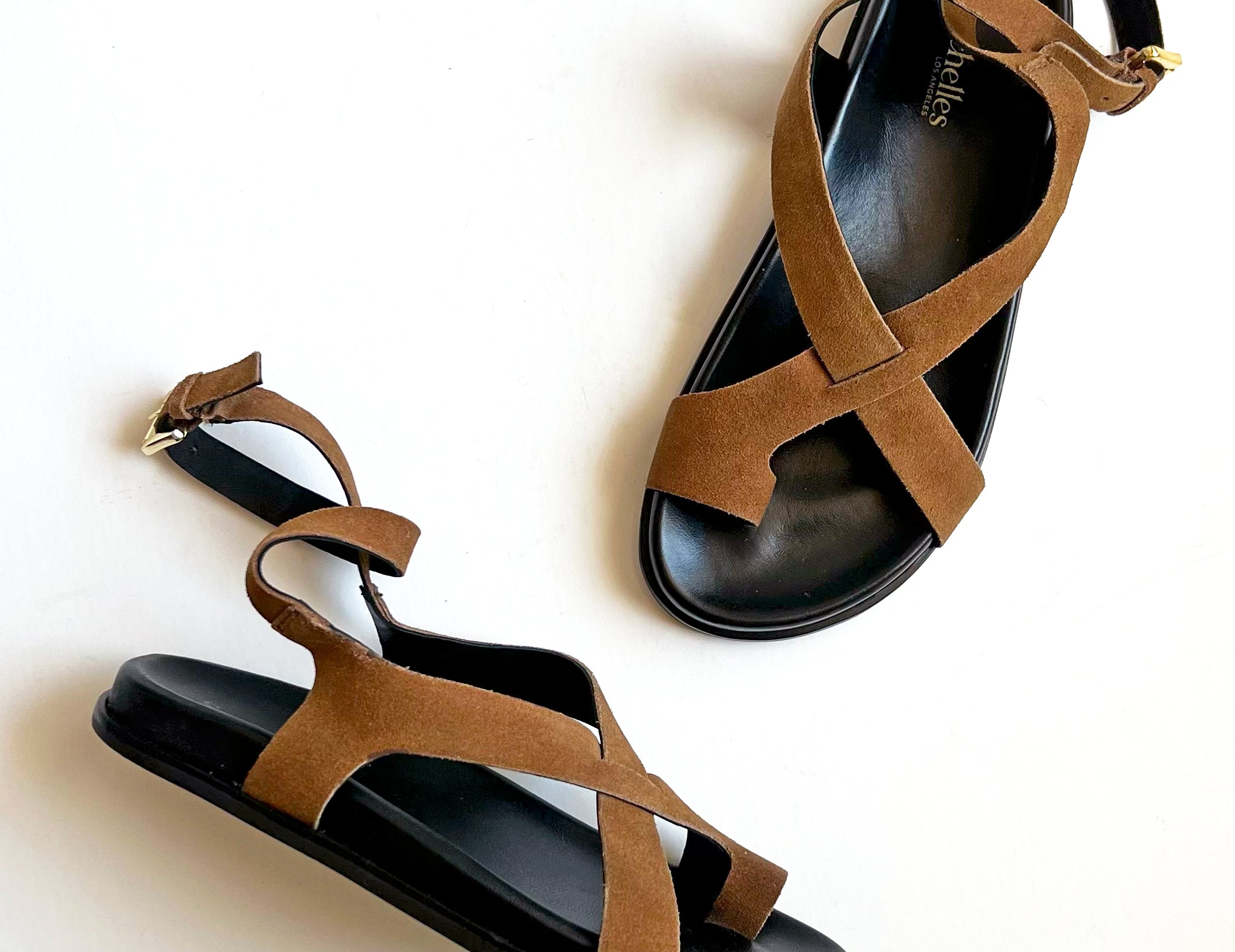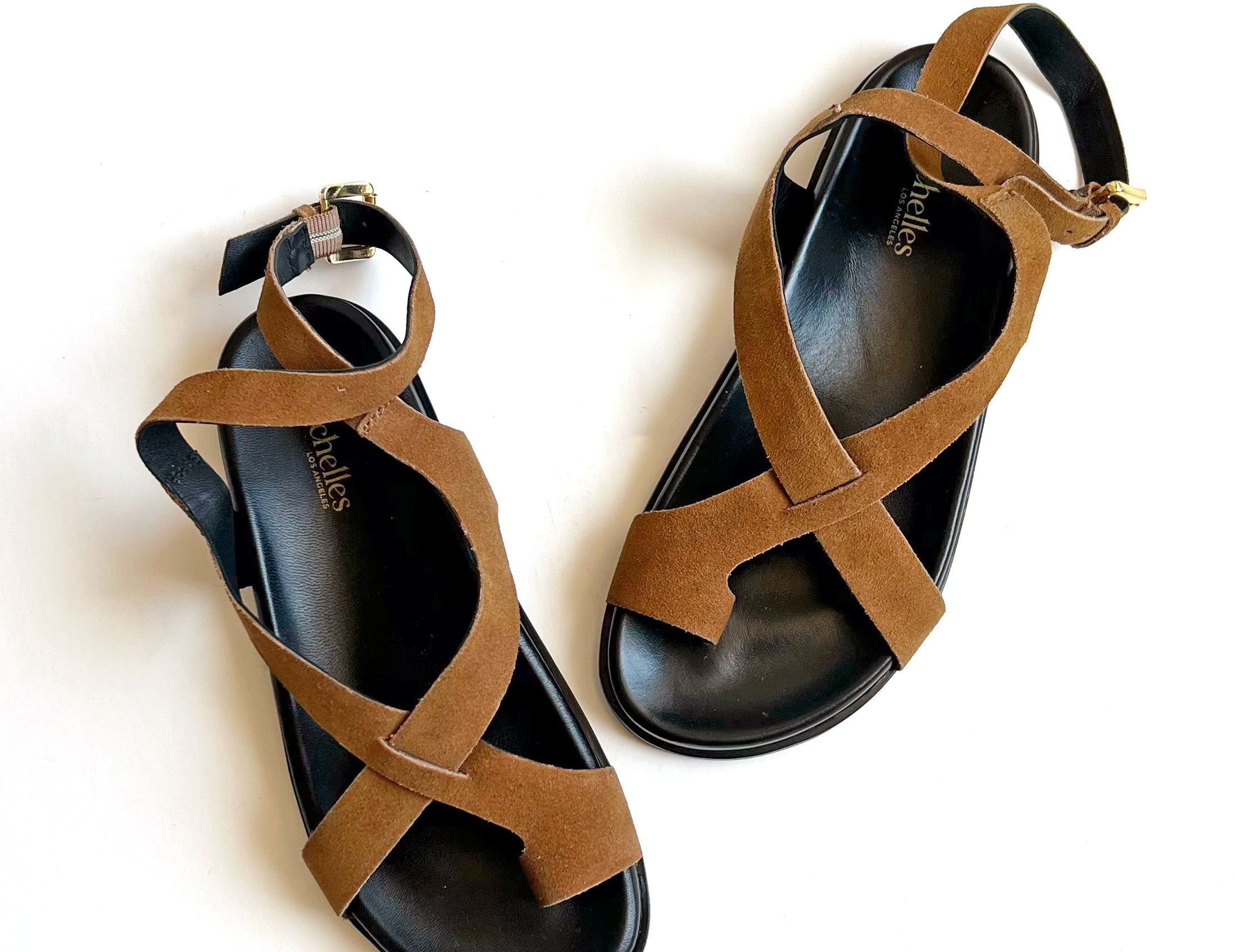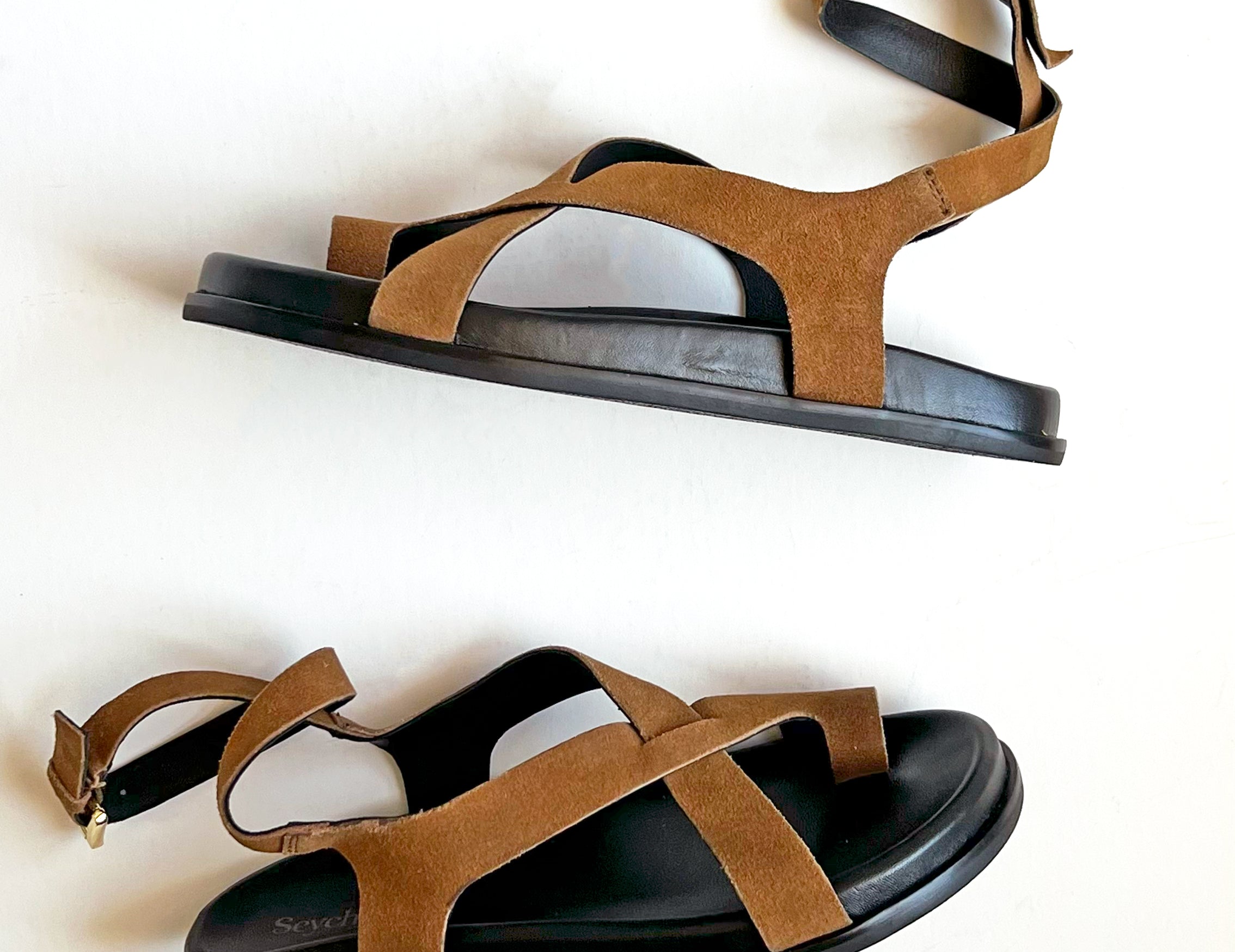 Velvety interwoven suede straps set on a cushioned footbed, these platform sandals are molded for maximum comfort. Designed to keep your feet securely in place with a toe loop and a wrapping ankle strap that buckles to taste, these brown suede sandals from Seychelles have a sporty, gladiator feel and are easy to pair with dresses, trousers, or shorts.