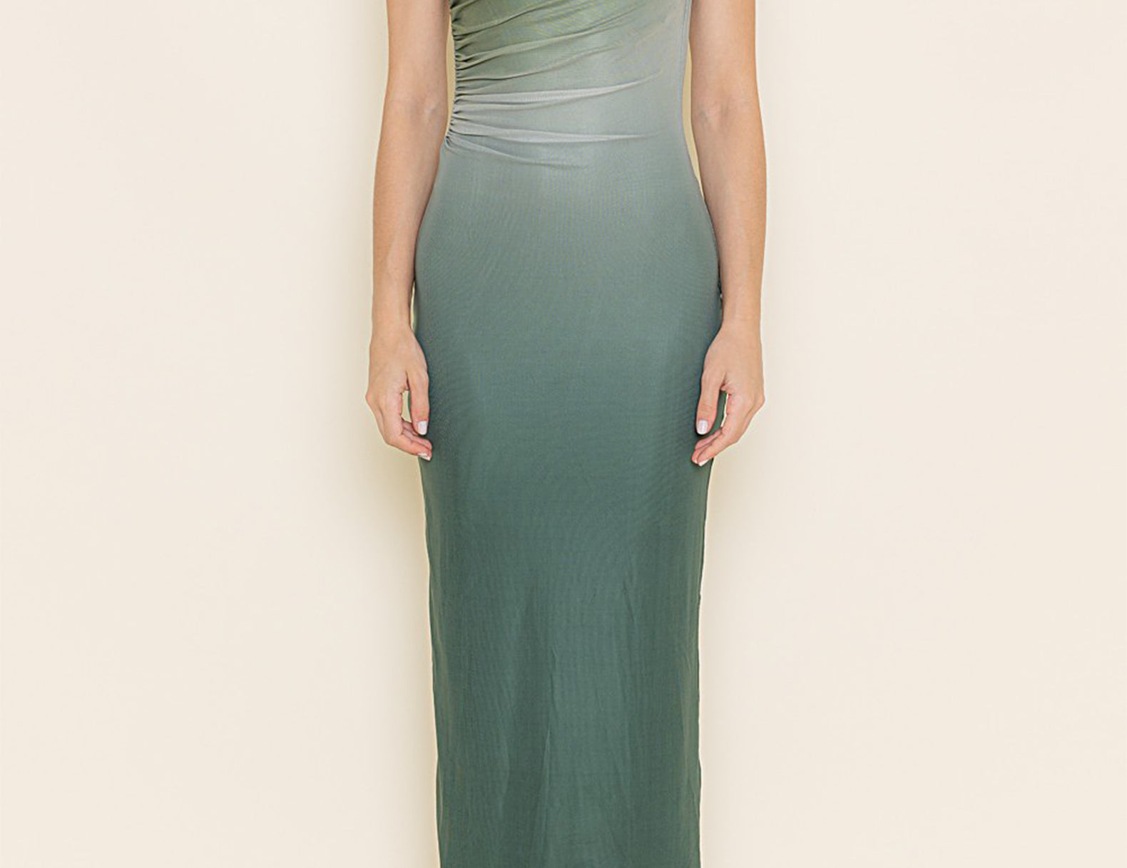 Eye-catching in both shape and color, the Gaia dress skims the body in gathered ombre mesh. At the top, a soft cactus green hue highlights an asymmetrical neckline. The green fades to light sage along the waist and warm teal into an ankle-length skirt, left unlined near the hem for a sheer finish. Pair Gaia with gold bangles and kitten heels for a colorful, occasion-ready look.