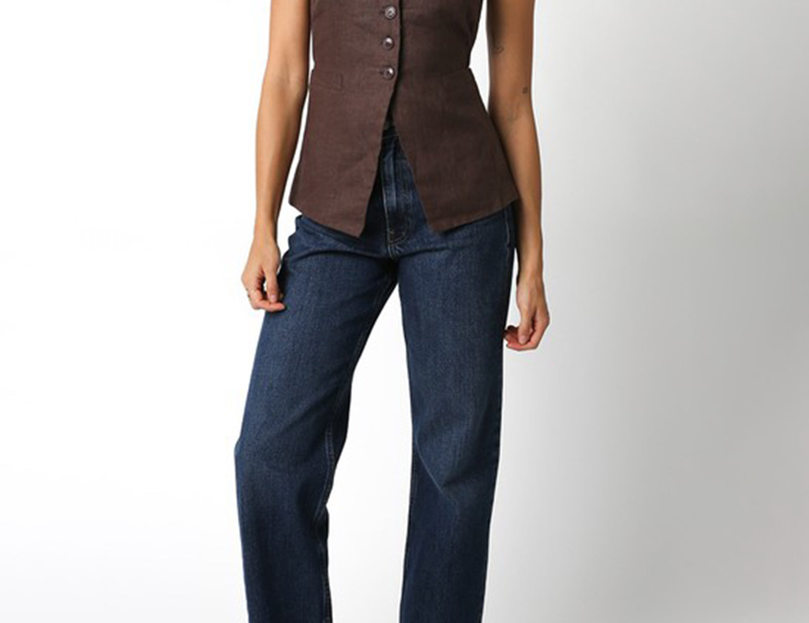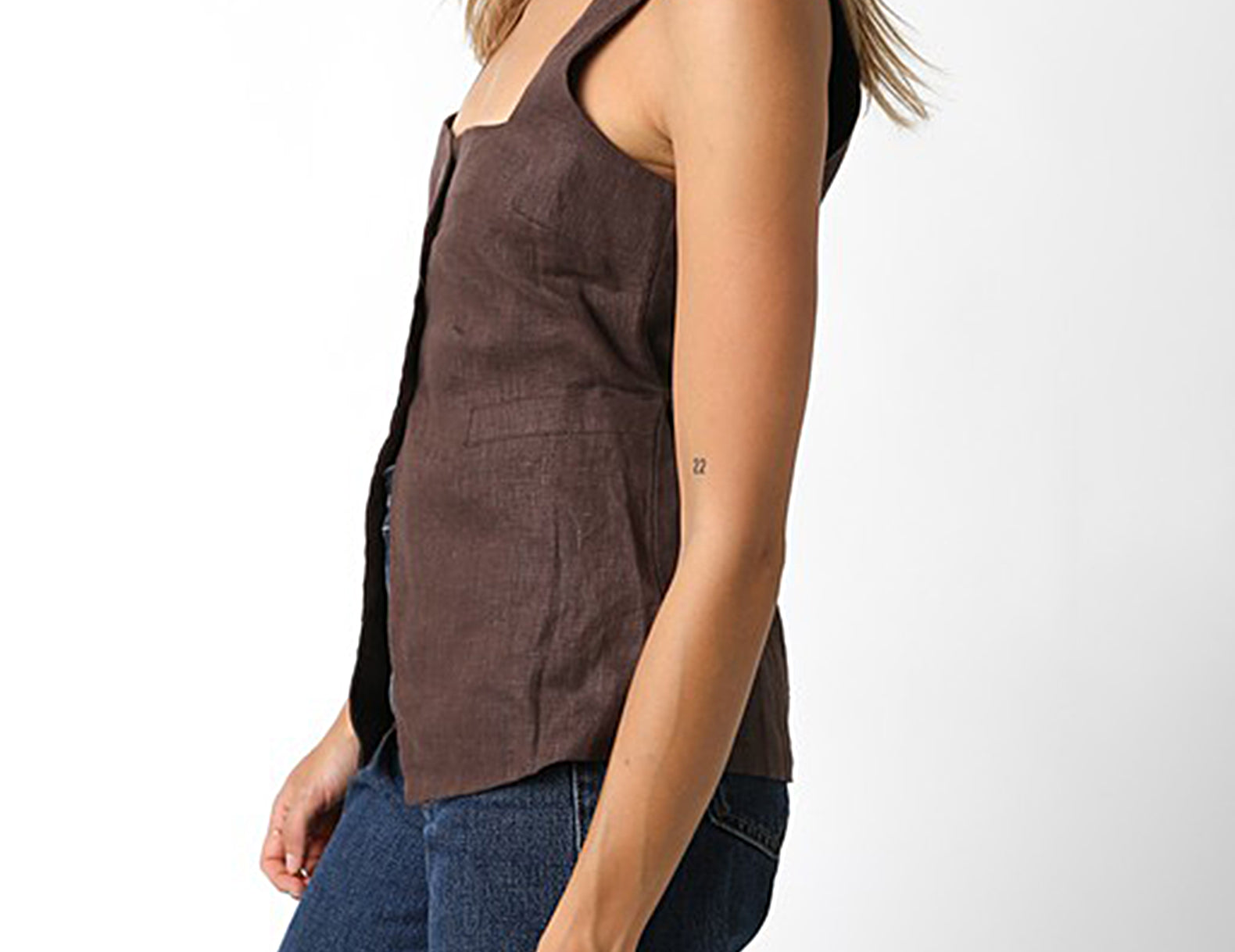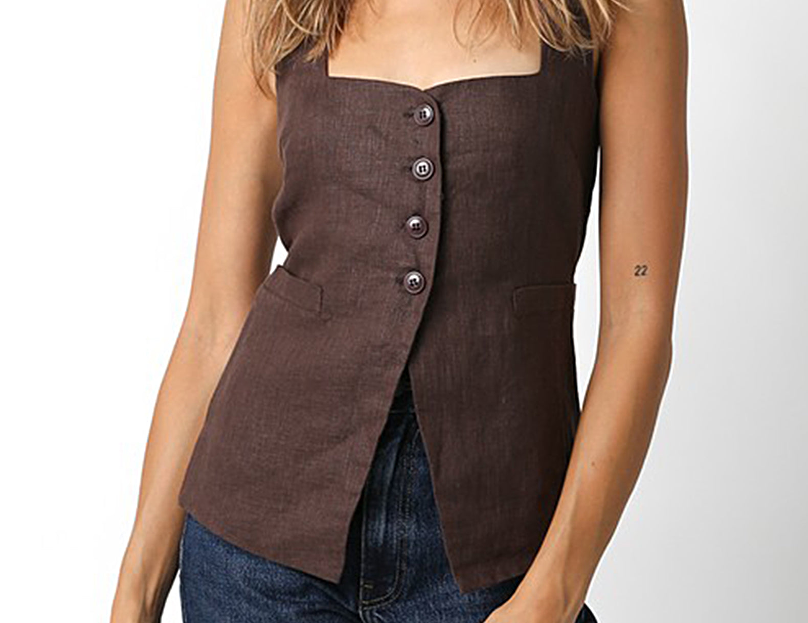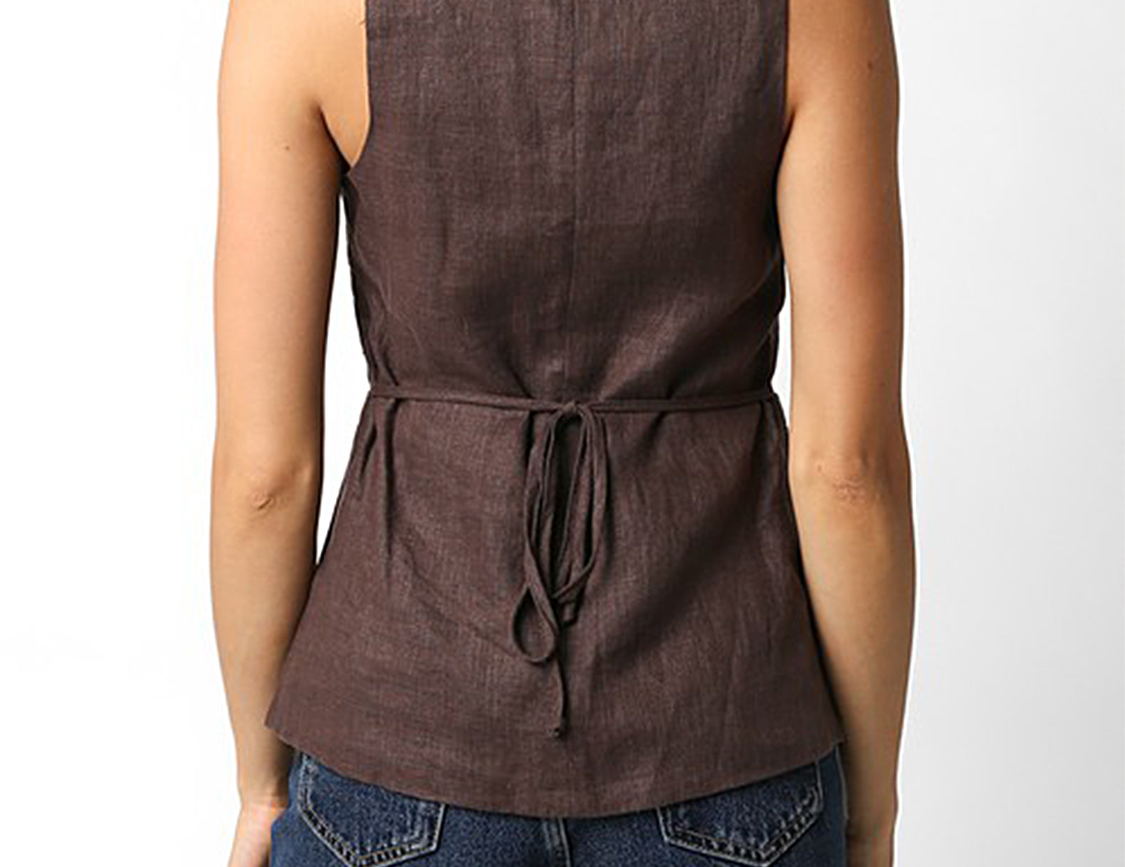 A sartorial staple with a deep, squared neckline, the Georgia is designed in an elevated vest silhouette with a half button front and open center with slim ties shaping the fit. Cut from a structured linen weave in deep coco or classic red, try this vest solo with trousers or layer it over a billowy blouse or midi dress for a put-together finish.