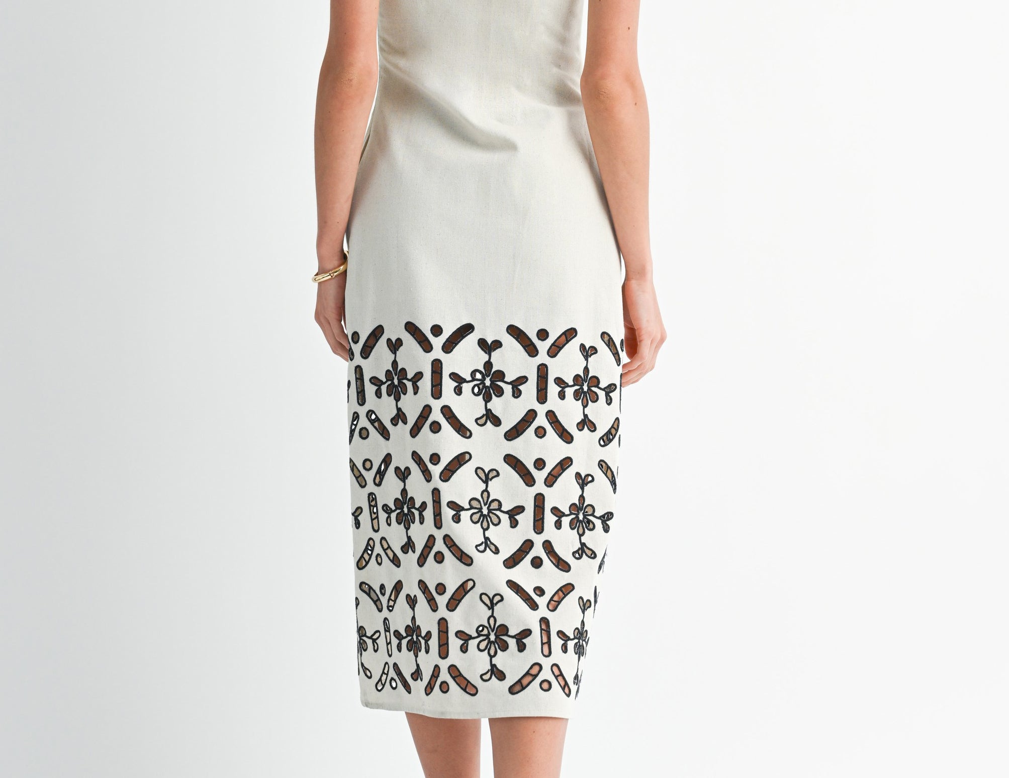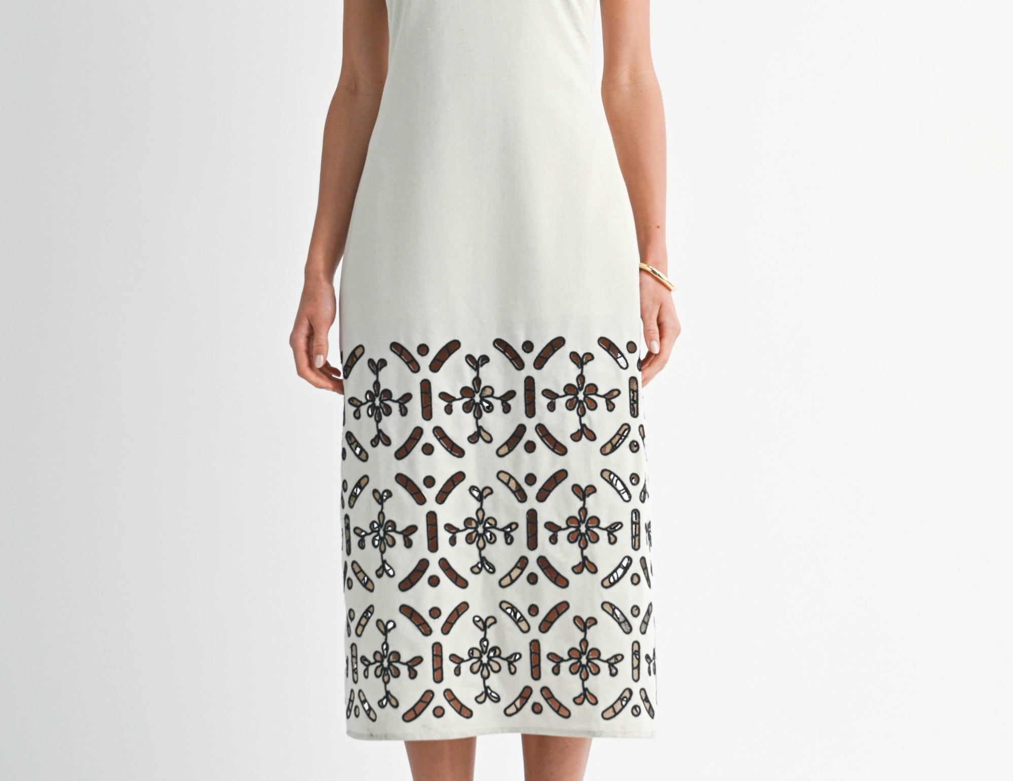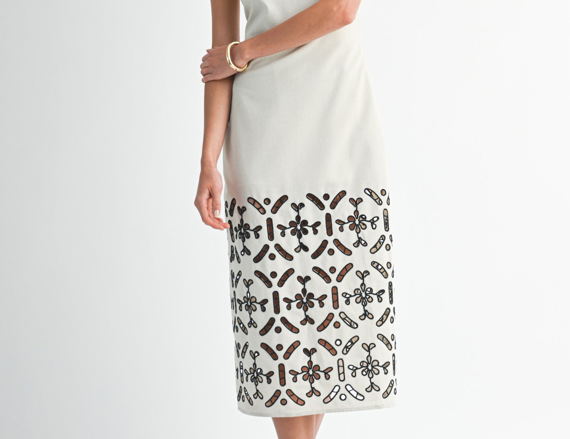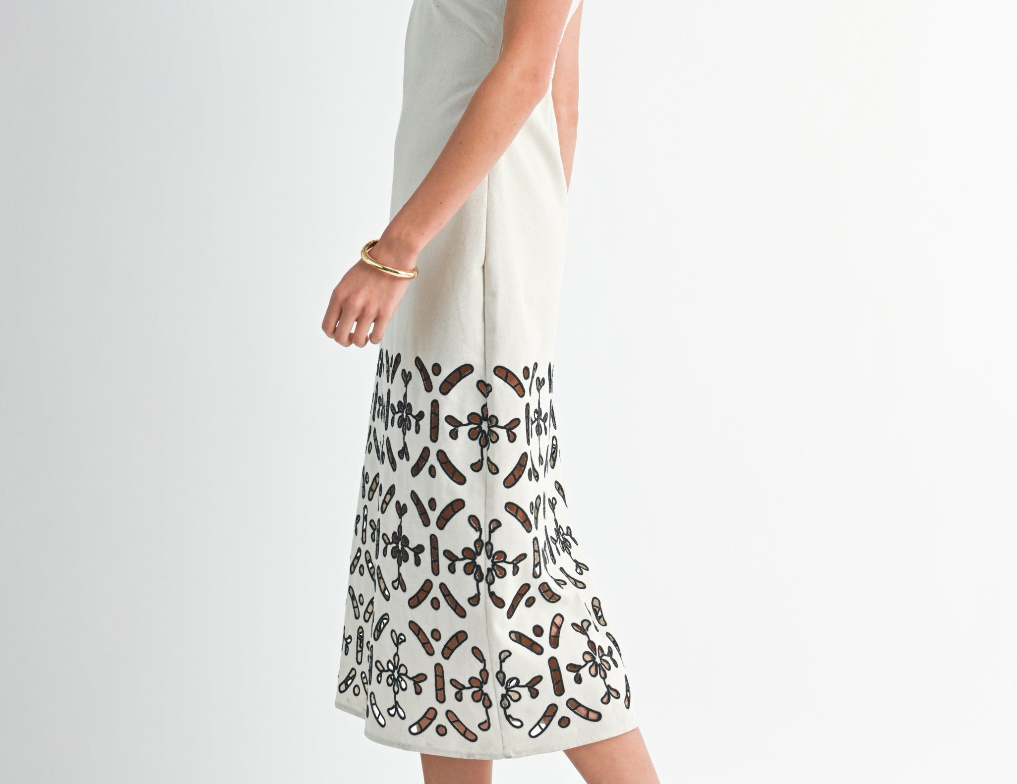 A structured linen + cotton weave in natural wheat white, this longline shift dress is embroidered in openwork detailing for a sheer finish along the hem. Timeless in a squared neckline with wide, flat straps that adjust with a back buckle, try the Gia midi with chunky black heels, a bold lip color, and a fresh fragrance.