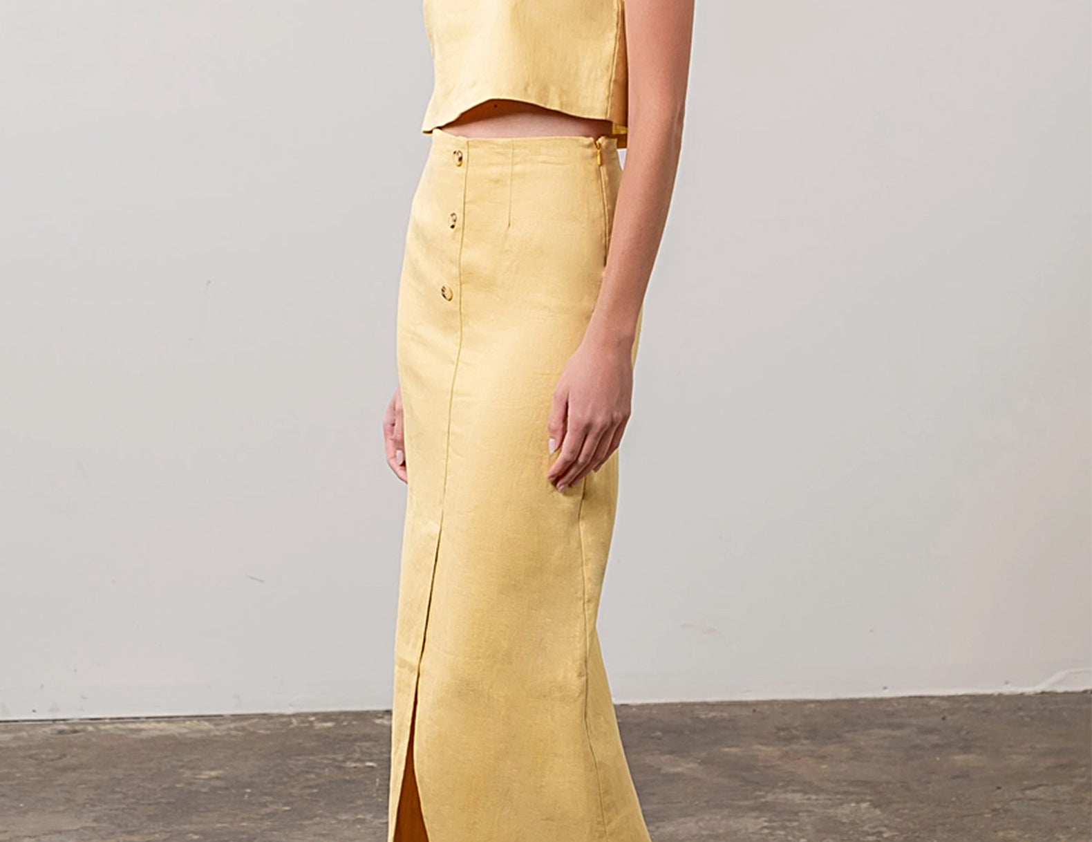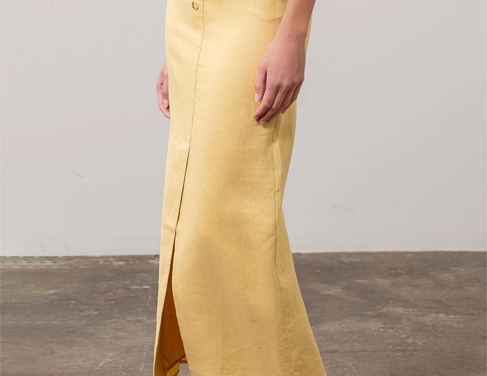 Done in a soft, lemon-yellow linen blend, the Grazia pencil skirt is a warm-season classic for your forever closet. It sits high at the waist and is cut slim and straight for a skimming fit that doesn't cling. A half-length slit stretches up from the hem below three decorative tortoise buttons at the waistline.