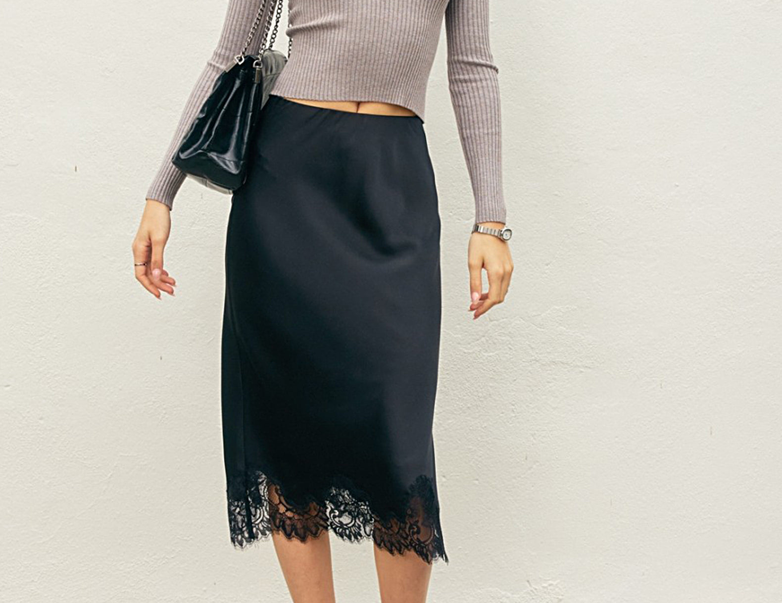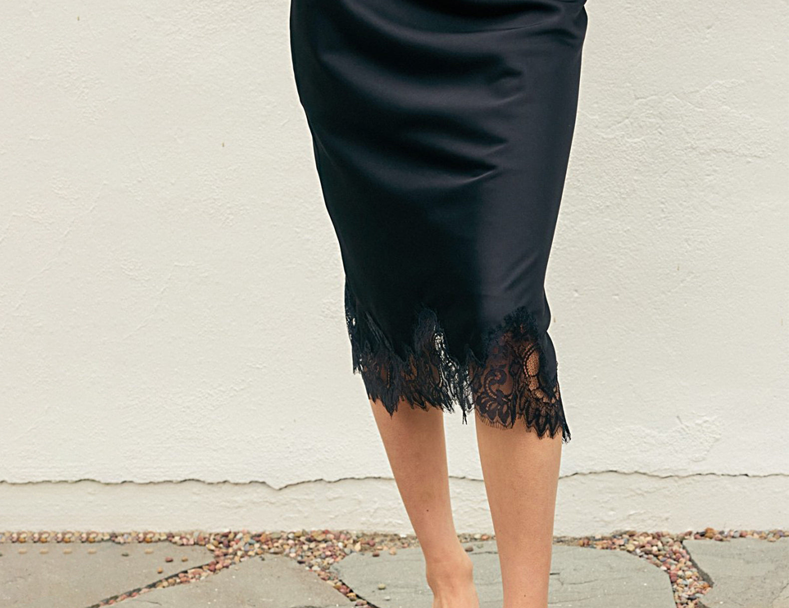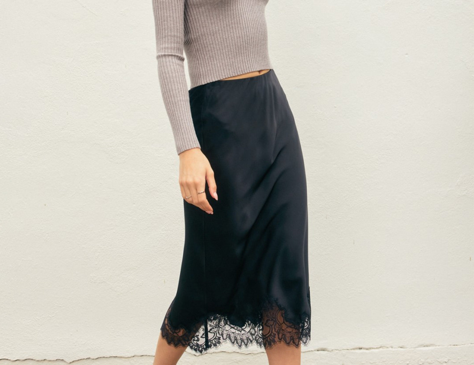 A classic piece for your forever closet, this fluid, black satin midi skirt pairs well with a simple cami, a crisp button-up, an oversized graphic tee, or a chunky knit sweater. It features a delicate eyelash lace trim along the hem and an elasticated waistband at the top. The sheen is soft, not overly shiny. Finish the look with sneakers or pointed flats and your favorite perfume.