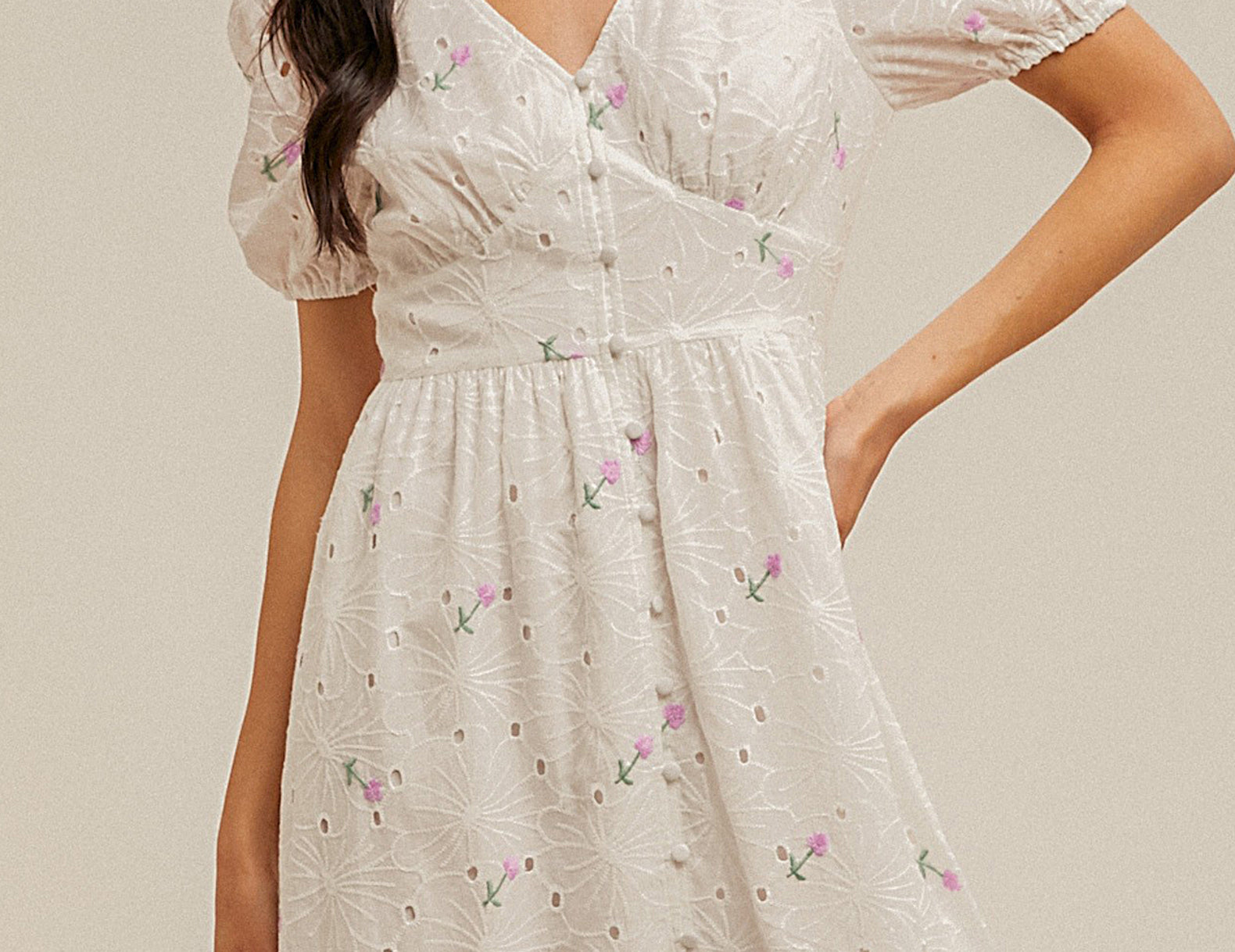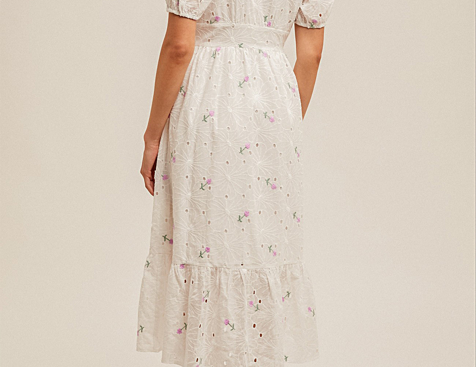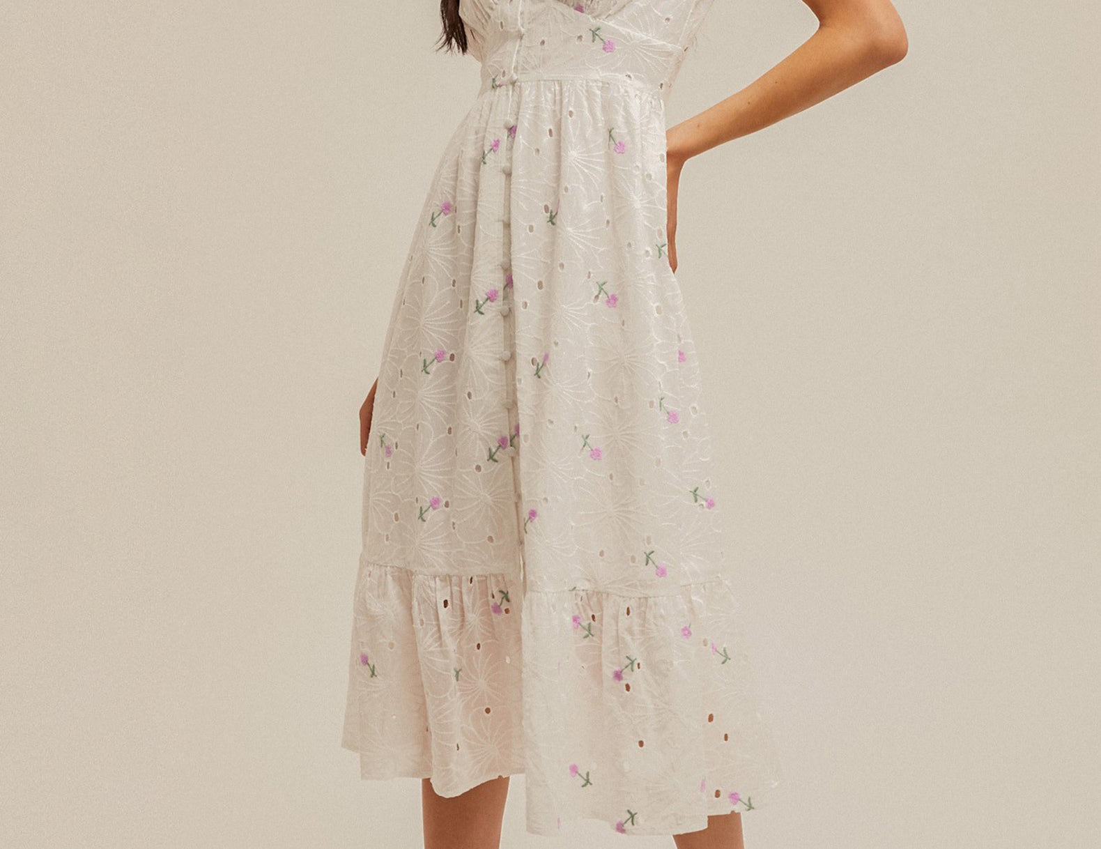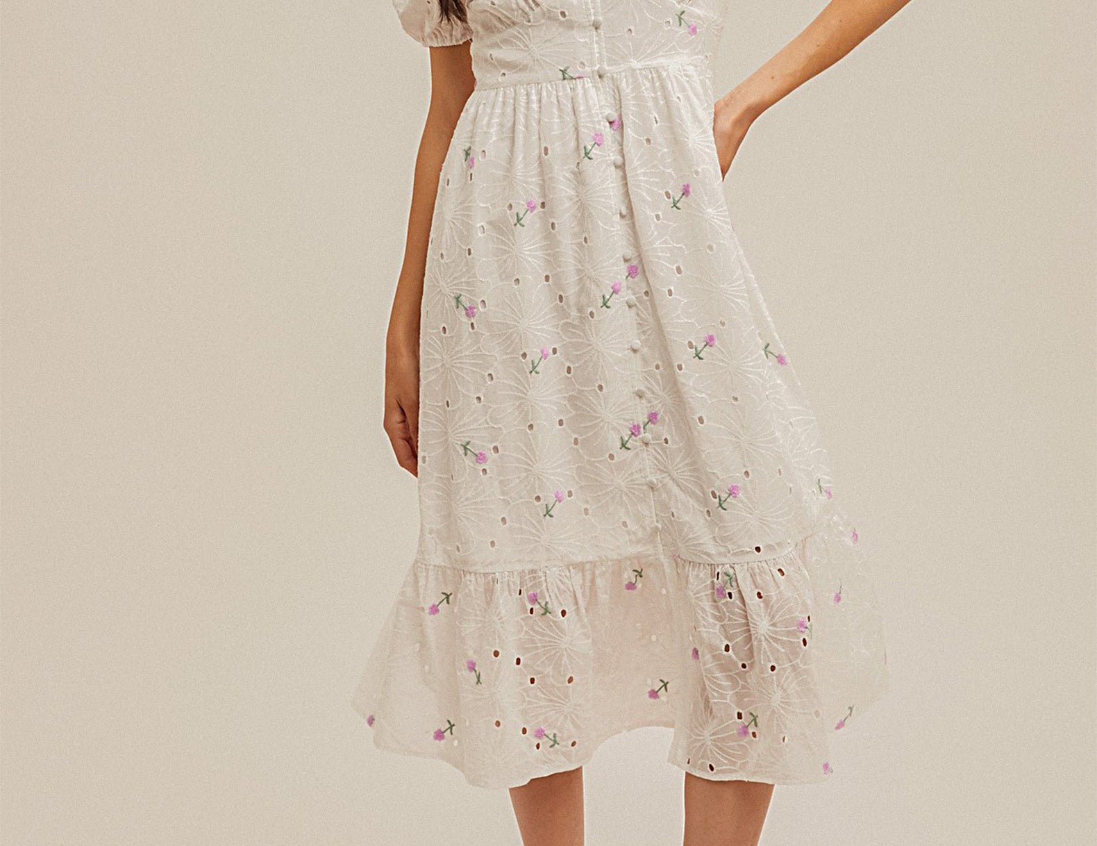 Undeniably romantic in embroidered eyelets, the Hathaway midi flatters in a smooth empire waist, with a covered button front that stretches into a breezy center slit at the tiered hemline. Textured in tonal embroidery and mini stitched florals, with puffed sleeves for a feminine finish—try this midi with strappy platforms or heeled boots.