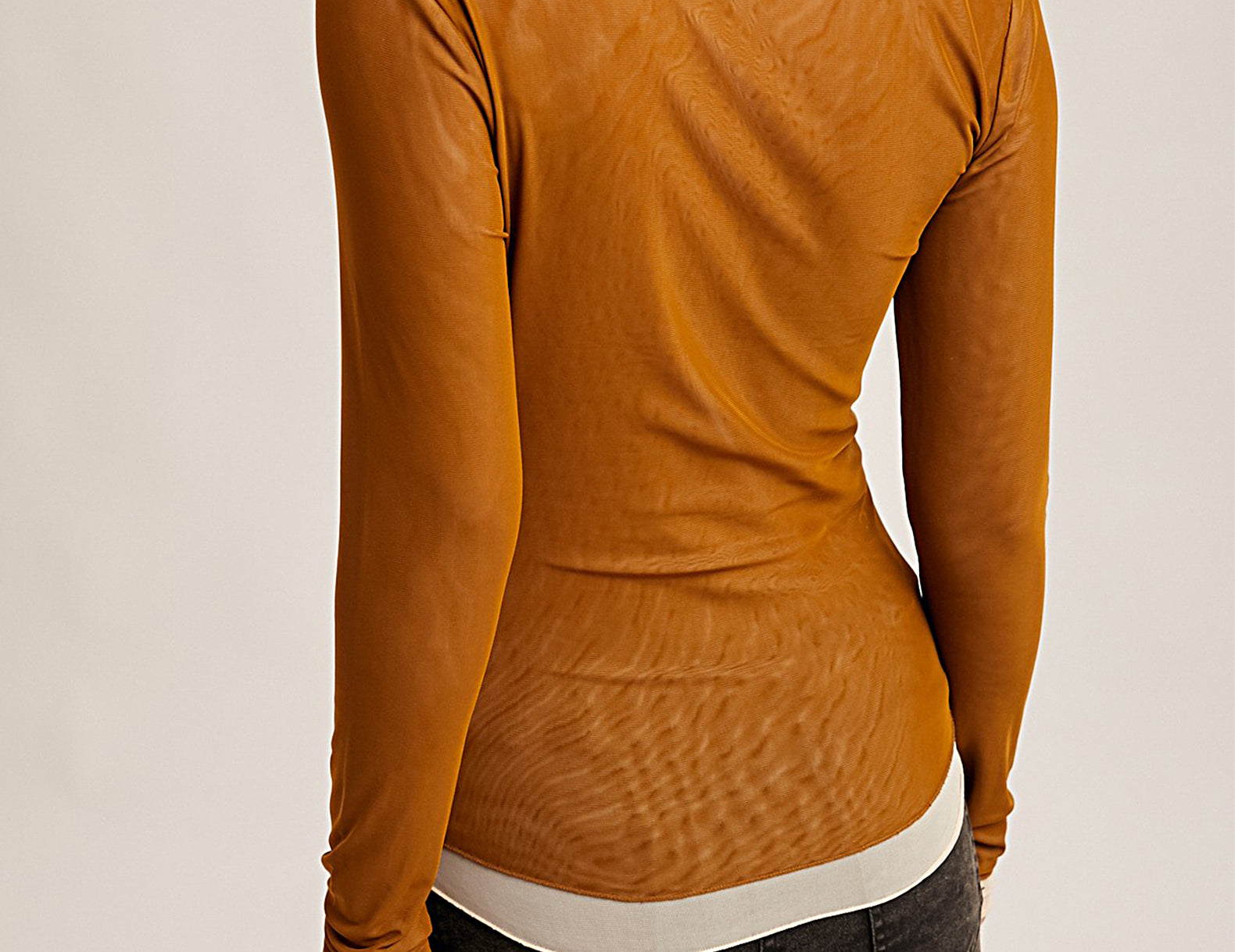 For a sleek and simple layered look, the Hutton top is designed in contrasting mesh fabrications in almond white and warm ochre. Textured, light, and semi-sheer, this elevated mesh top features a longline, skimming fit with a scoop neckline and exaggerated long sleeves, adding soft texture to denim or trousers.