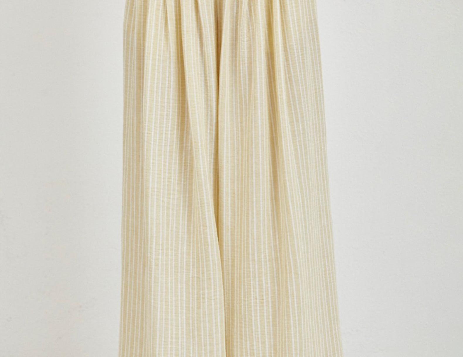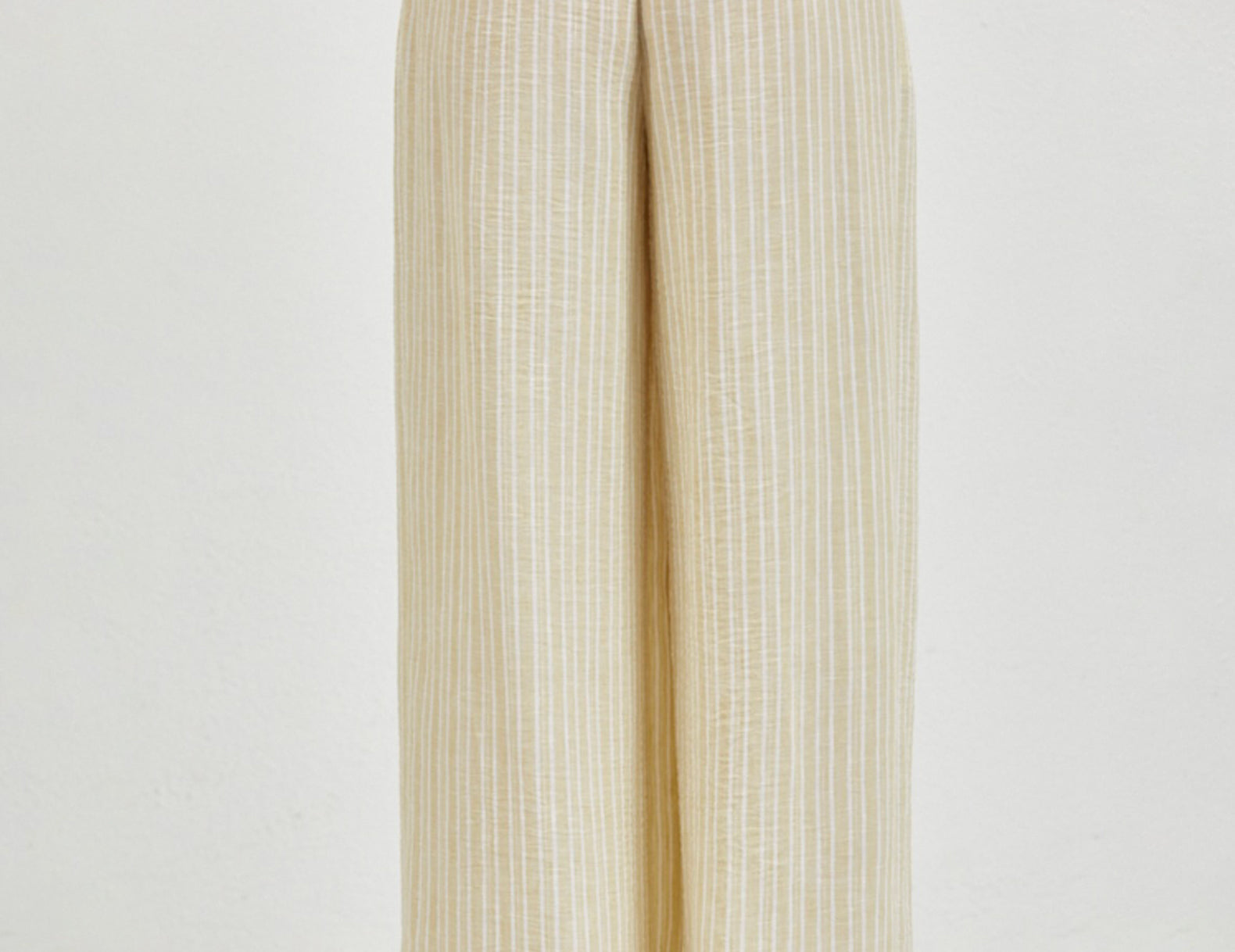 An airy pick for warmer days, the Isla pants are billowy in butter yellow and ivory stripes. They're pleated at the mid-rise waist and flare into sweeping, wide legs. Try them paired with a denim button-up and minimalist sandals, then pack them for the beach to pop on over your swimsuit.