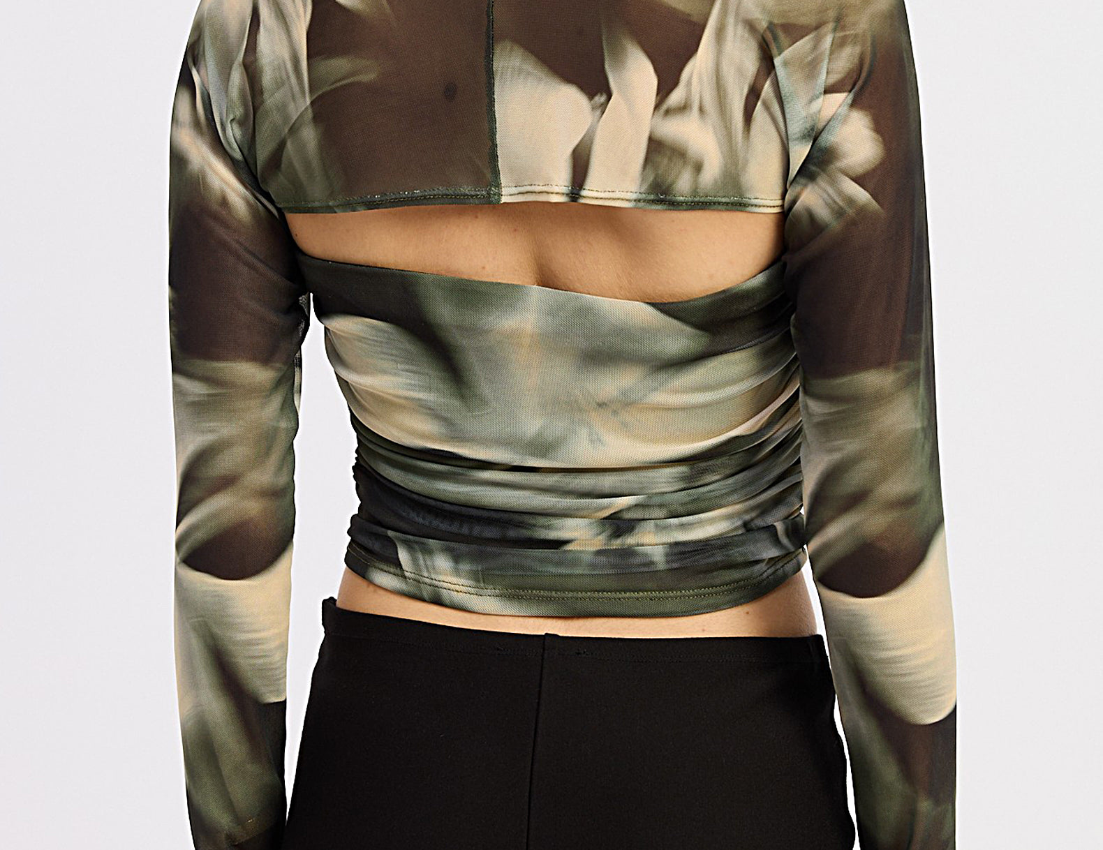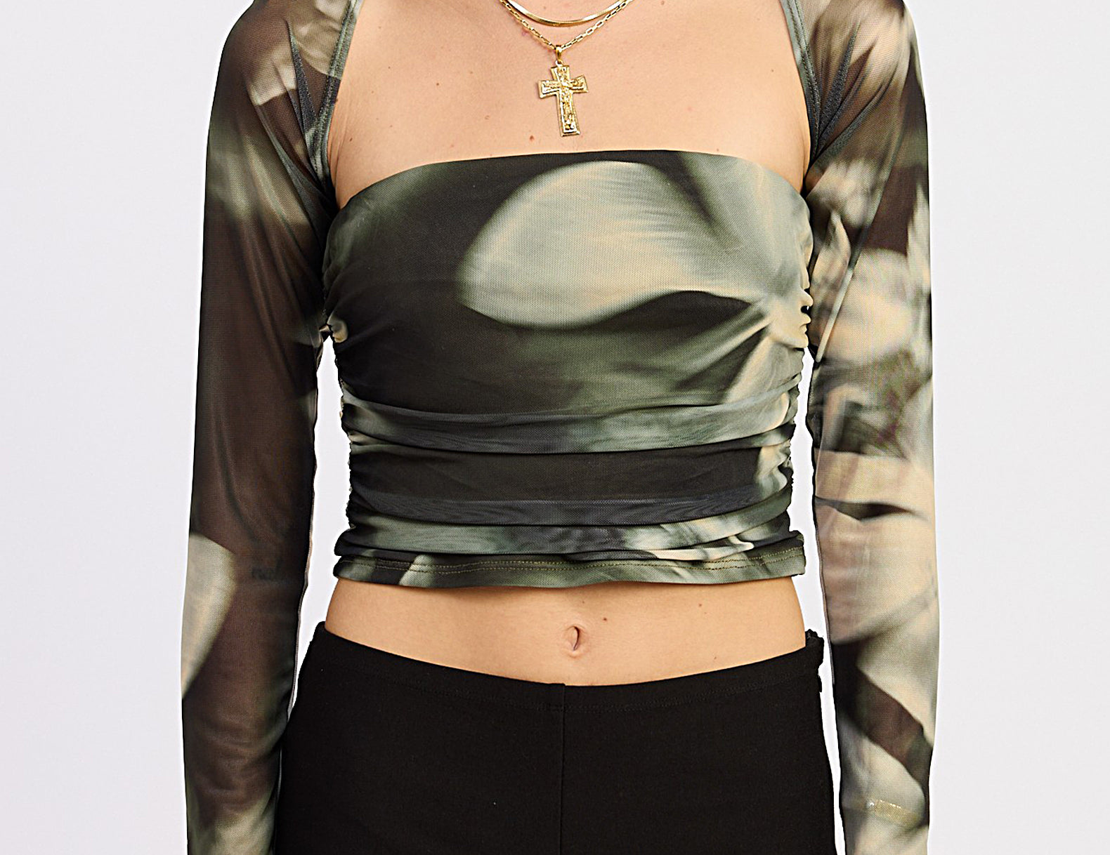 Large-scale floral petals make up this moody, tie-dye-like print in deep green hues. Done in a sheer, stretch-infused mesh, this two-piece top pairs a long-sleeve shrug with a waist-length tube top. Wear them together or treat them as separates; either way, the gorgeous Jackie top is perfect for a night out with friends. Try it paired with black wide-leg denim and boots, or for a dressier occasion, wear it over a black leather skirt and heels.