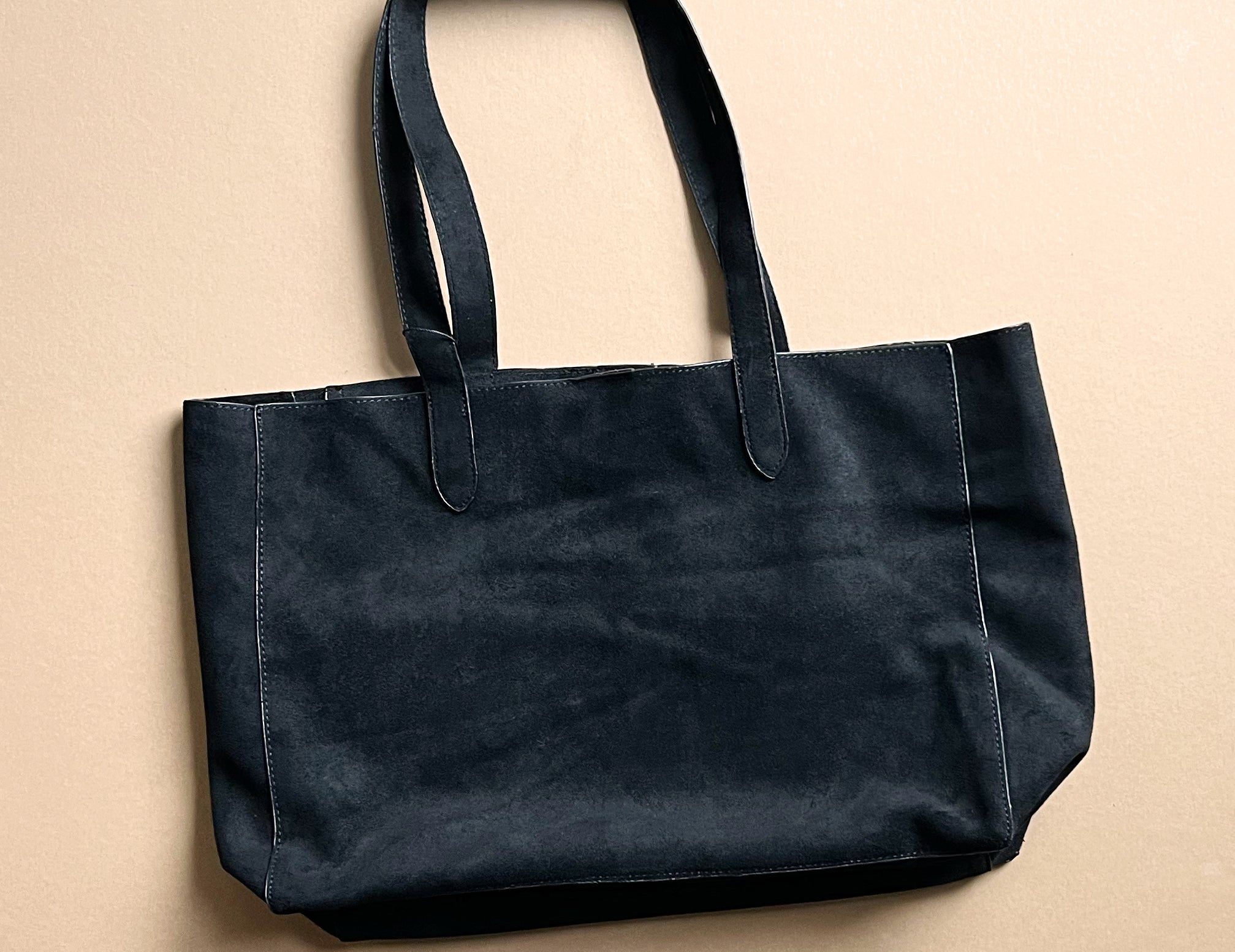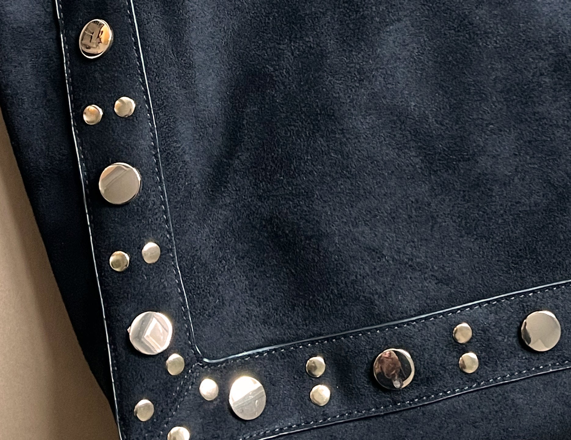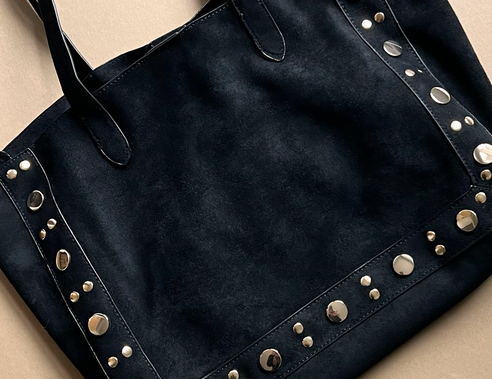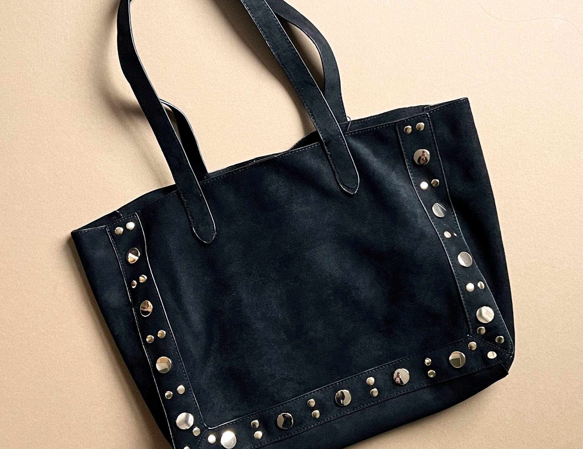 Velvety soft and studded with gold hardware, the Jojo bag is crafted from a luxe vegan microsuede with top-stitched edges and dual shoulder straps. Soft and perfectly flexible in true black suede, with a removable zippered pouch for all your smaller essentials, this embellished shoulder bag is spacious enough for a small laptop, a sweater, wallet, and more.