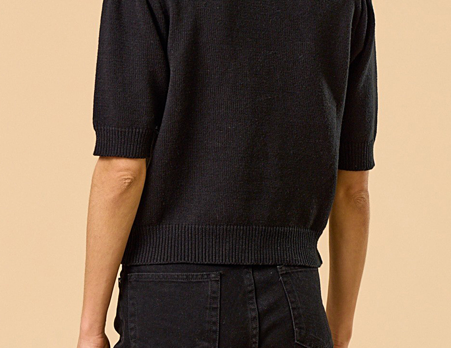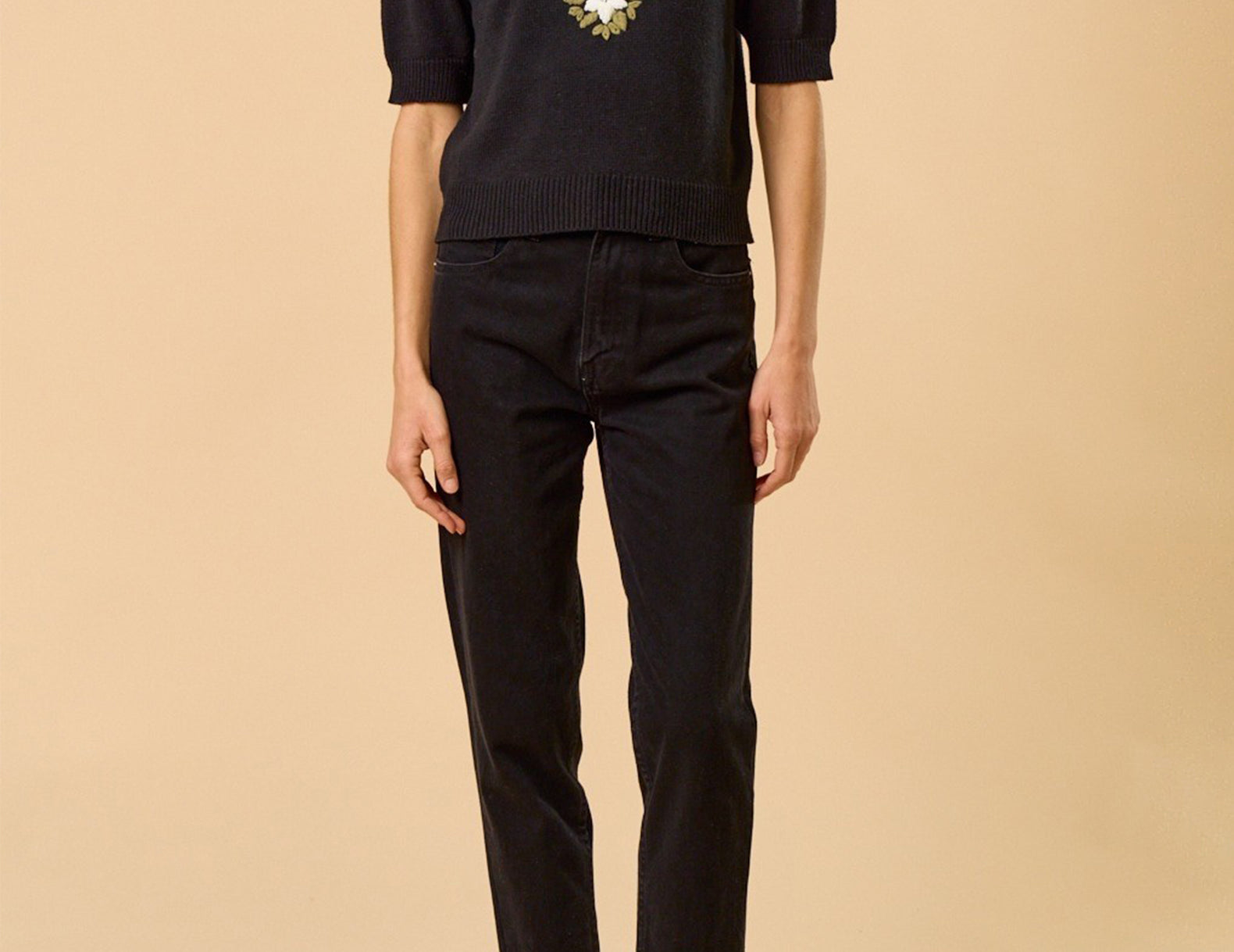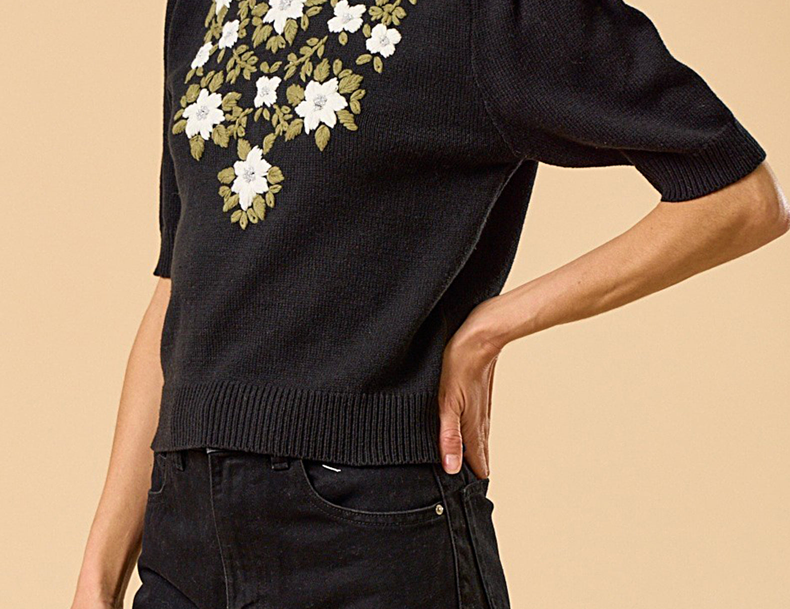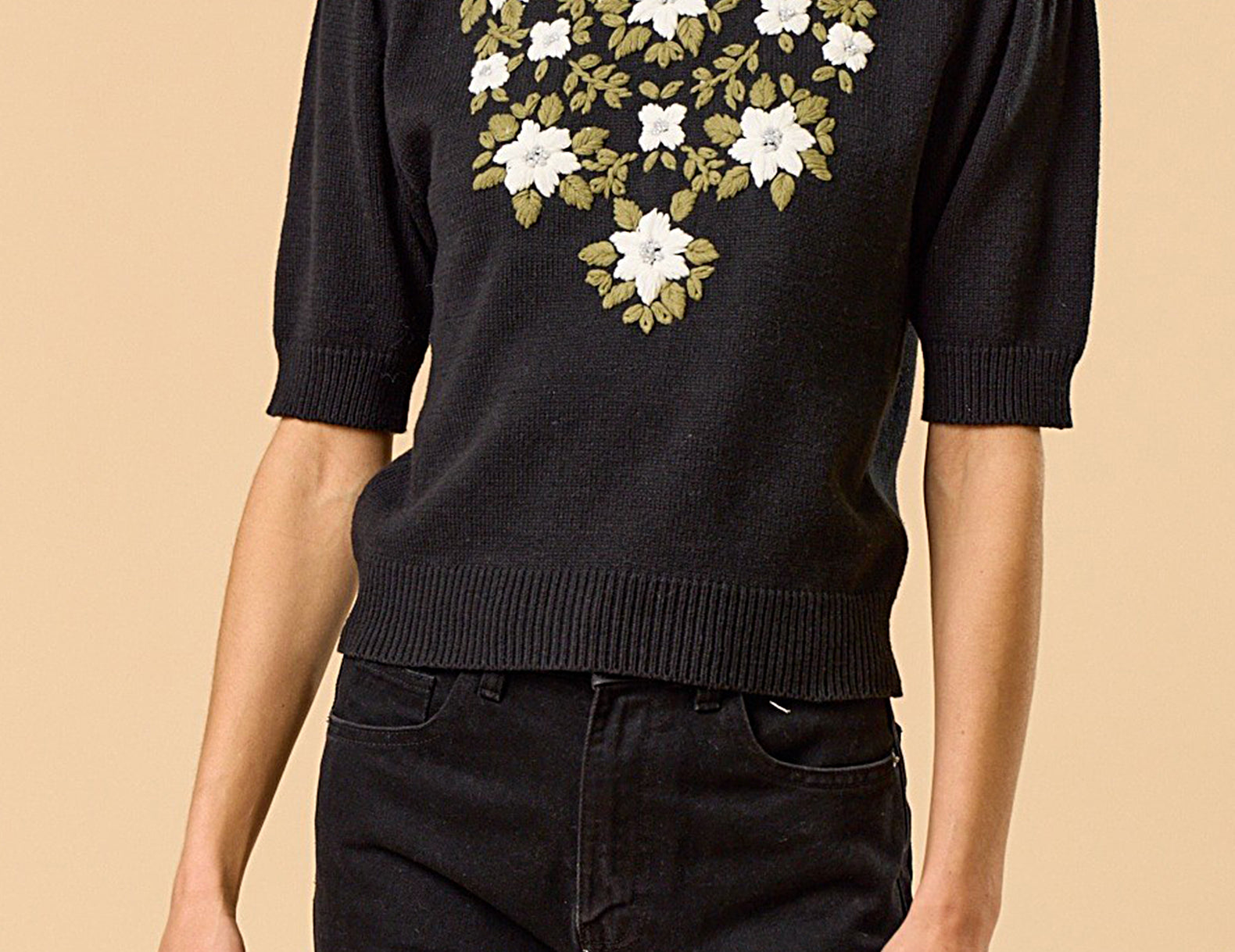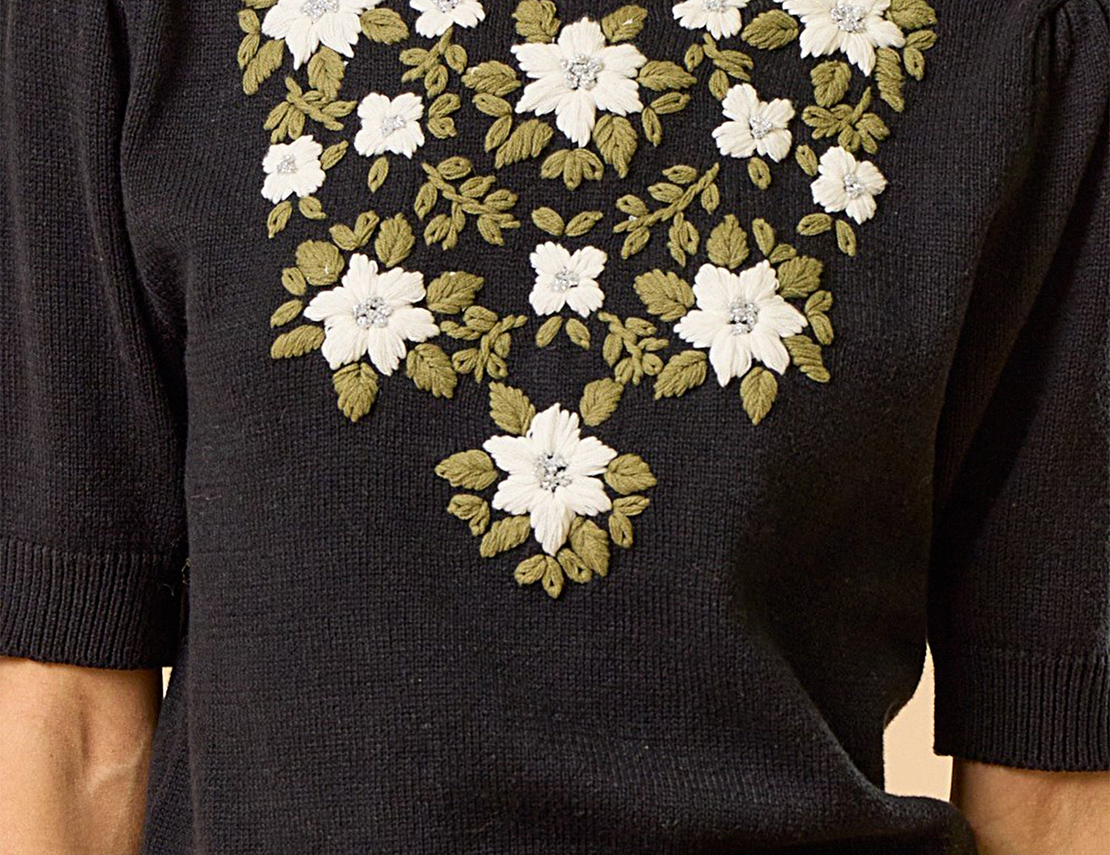 Soft and sweet, the Josefin sweater's vintage-inspired details will get you all the compliments. This piece features a bib of embroidered florals in ivory and olive green, with a touch of silver-gray at each flower's center. Constructed in a mid-weight, soft black knit and finished with elbow-grazing puffed sleeves, pair this charming sweater with your go-to denim, or try it over a satin pencil skirt and loafers.
