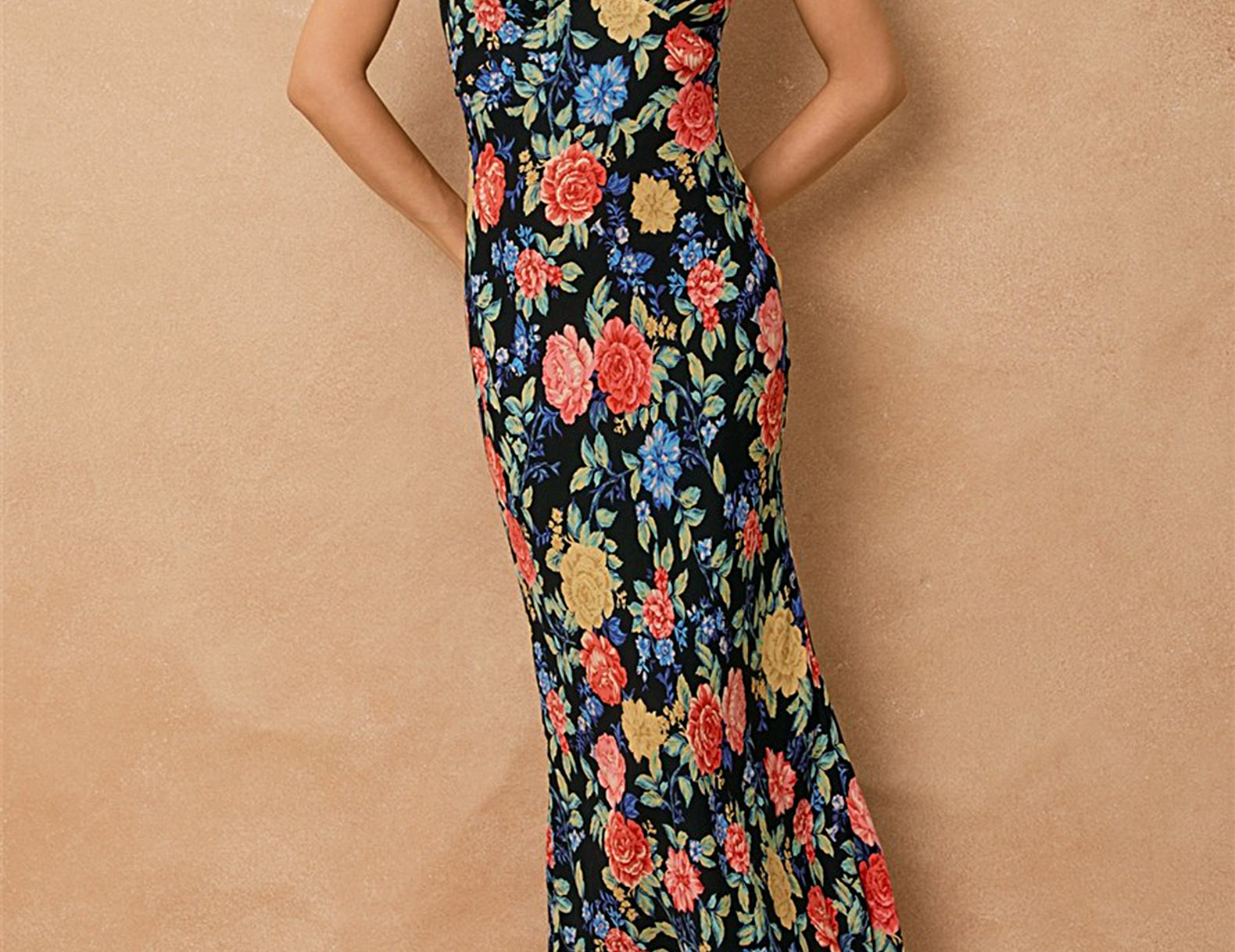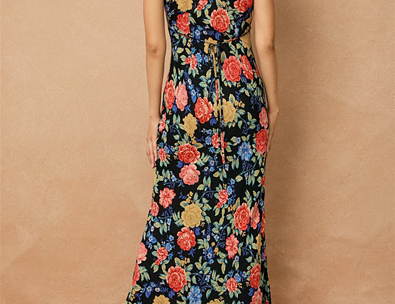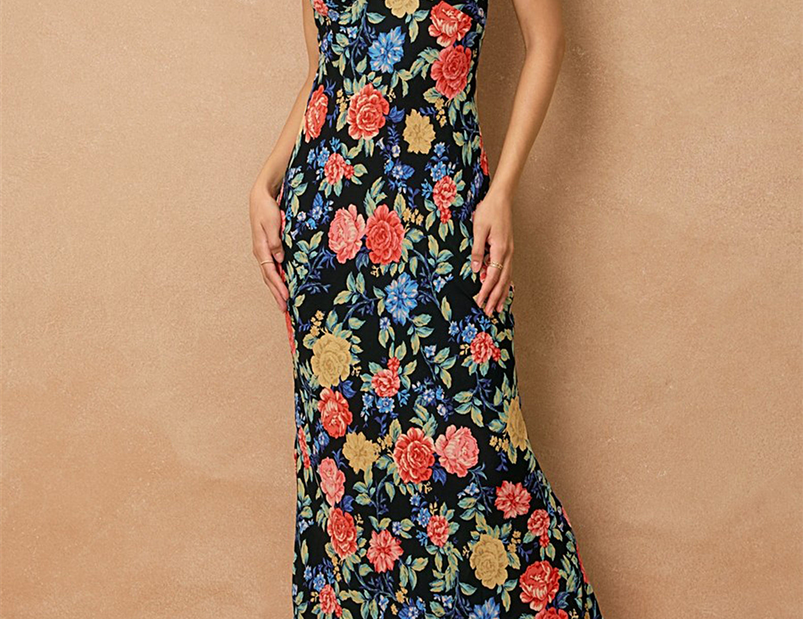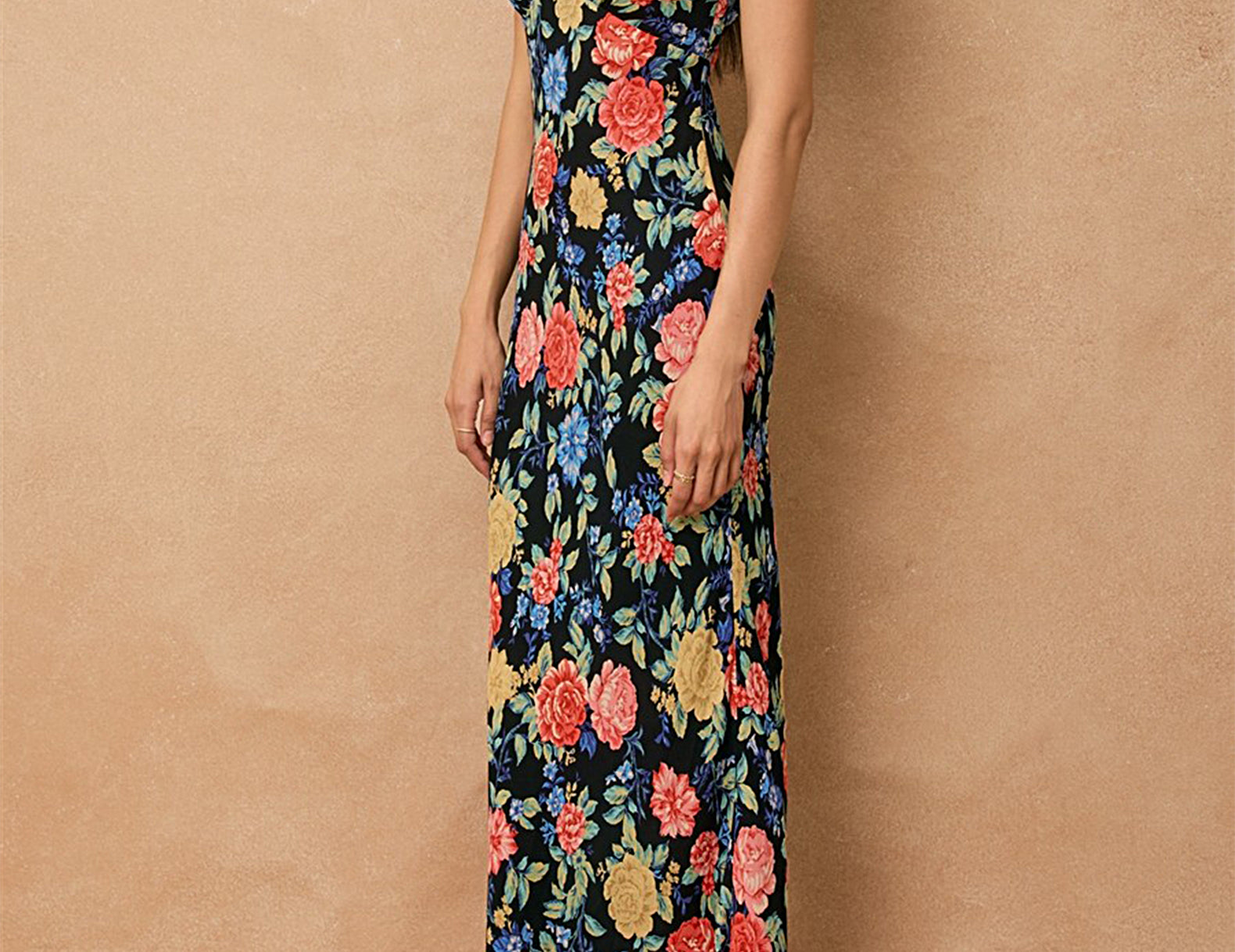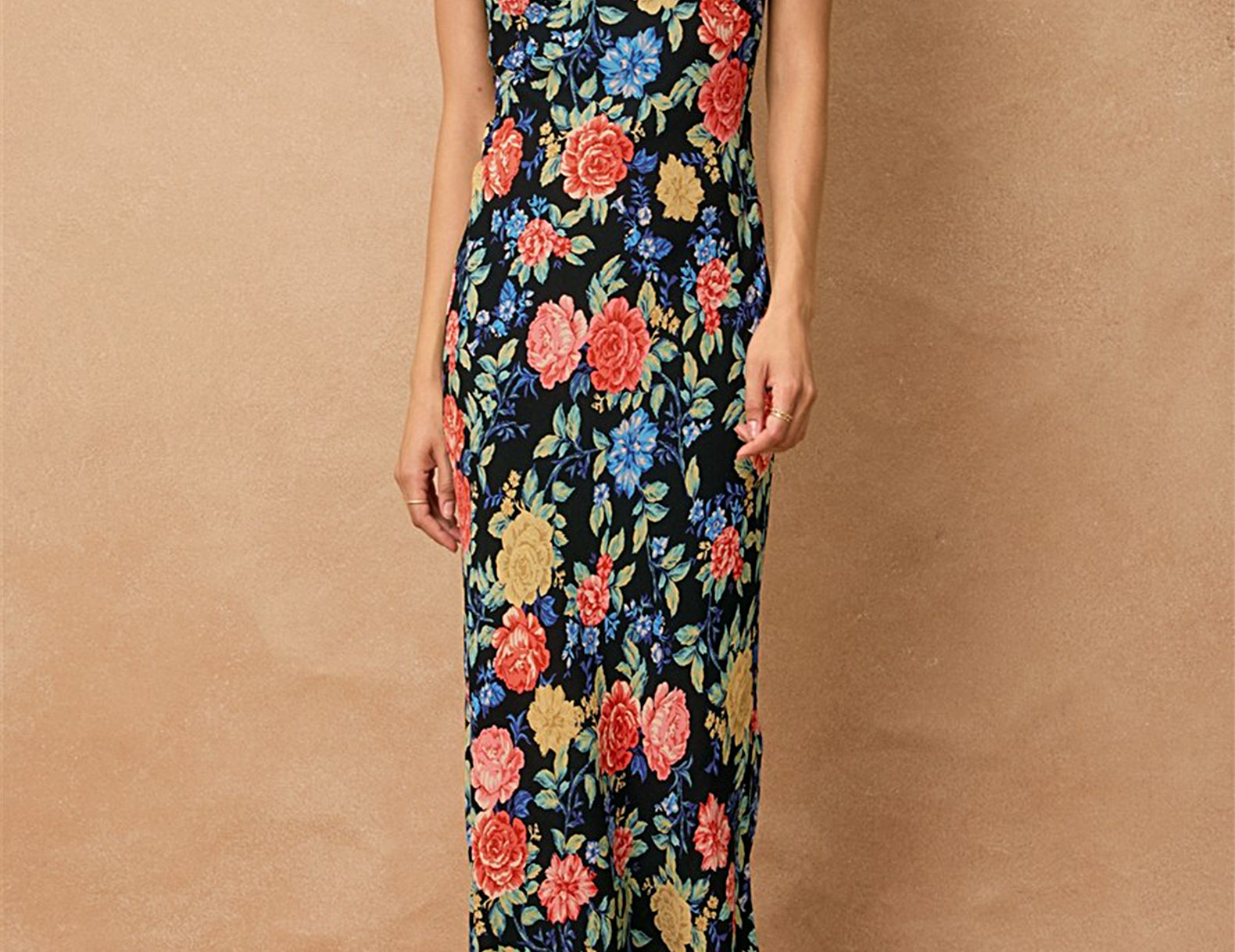 Bringing back a flirty, 90s-esque silhouette, the Juliette is featured in a body-skimming, bias-cut shape with a flattering empire waist and slim side ties to enhance the fit. Cut from a textured black crepe with a painterly rose print throughout, this maxi becomes a multi-season go-to with boots, sandals, or heels.