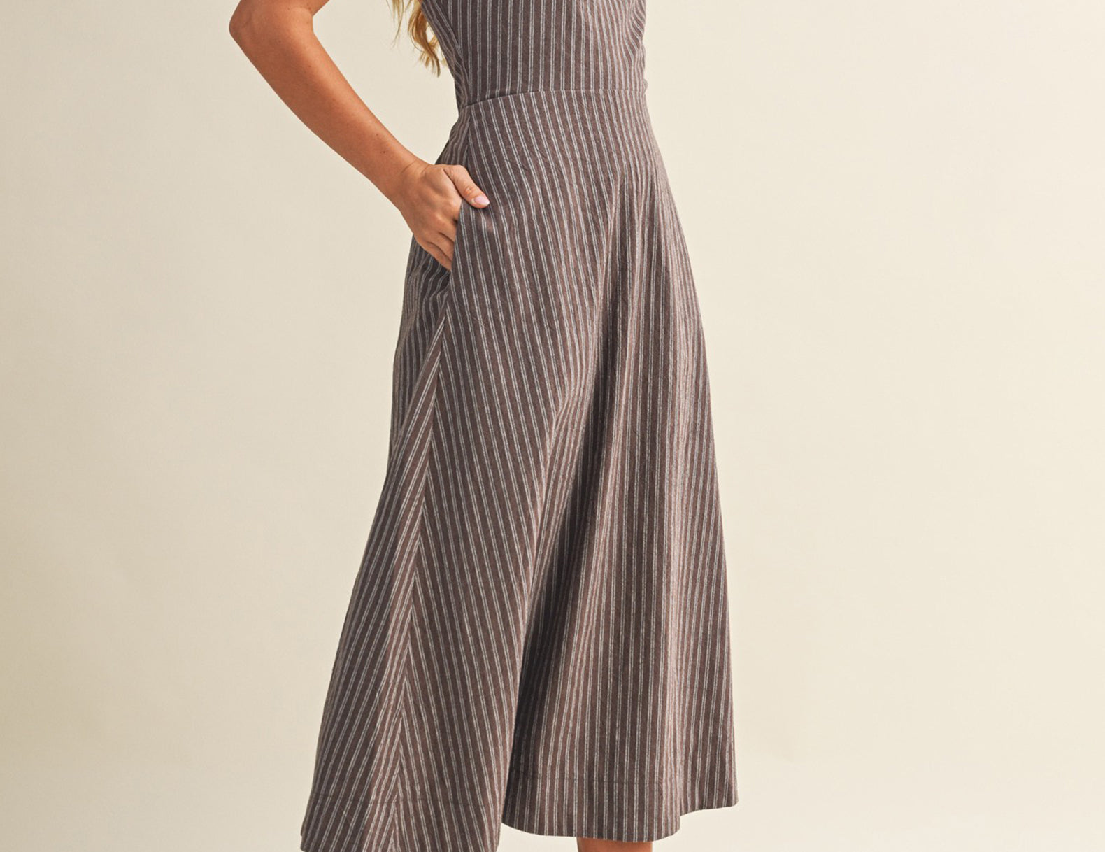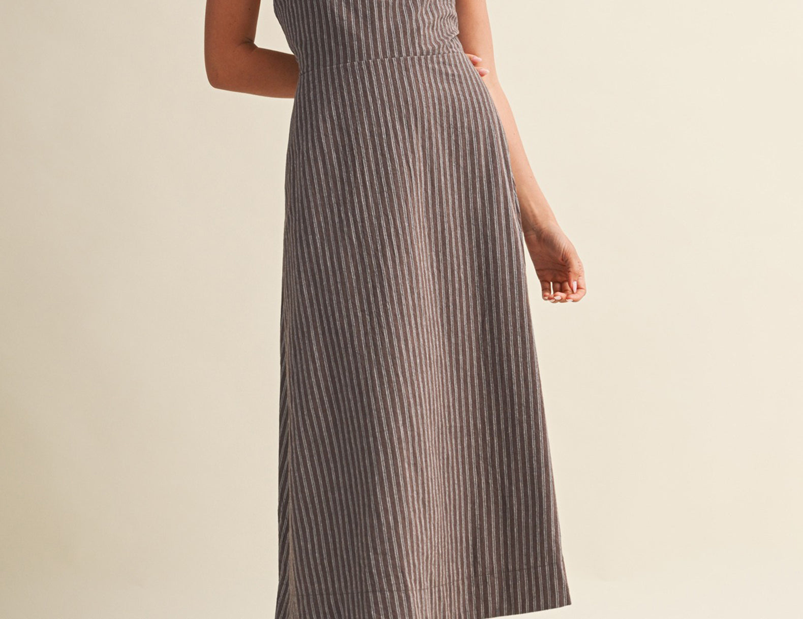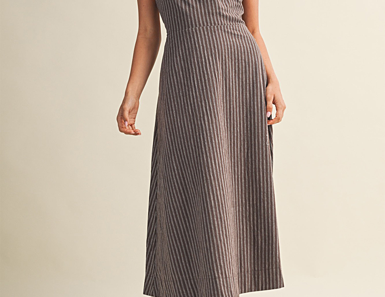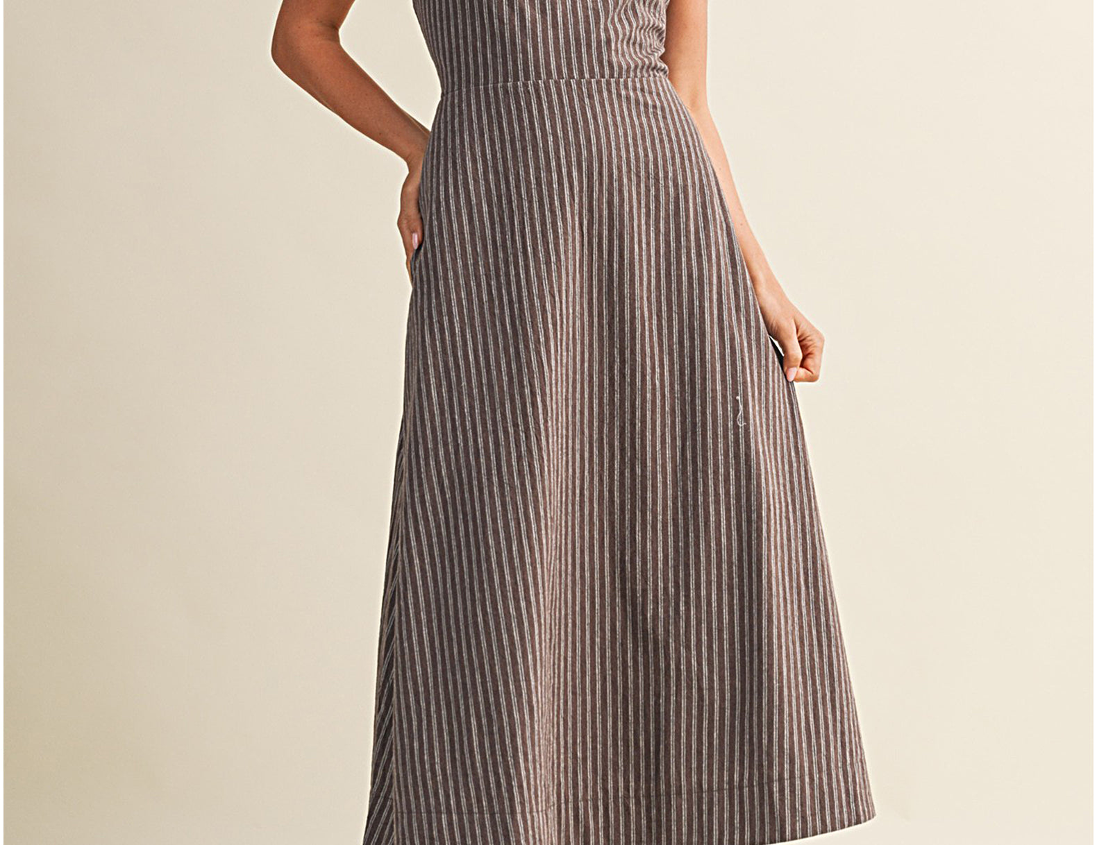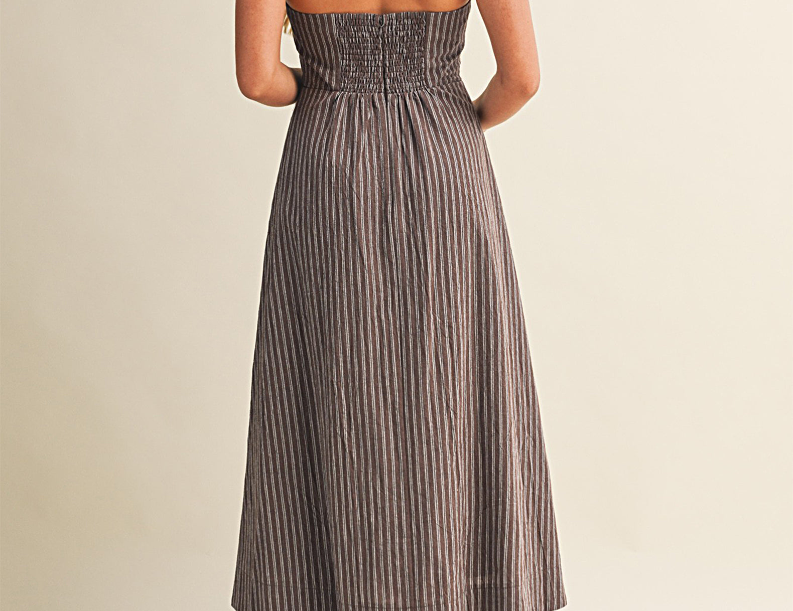 Soft yet structured in a cotton and linen blend, the Kaia striped halter dress is understated yet eye-catching. In a fit-and-flare silhouette, ecru vertical striping stands out against a chocolate brown base. At the top, a ring detail brings the neckline together below a beaded neck strap. Reach for this low-key dress on warm, off-duty days when jeans and a tee won't do.