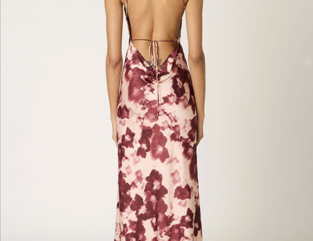 Artful in a tie-dye-esque floral print, the Kelton satin halter dress is a gorgeous choice for occasions in any season. Narrow straps connect at a pointed neckline and trail back, wide across the shoulders, tying at a low, cowl-draped back. Pair this ankle-grazing maxi dress with tall boots and a knit bolero, or sandals and a rafia clutch in warmer weather.