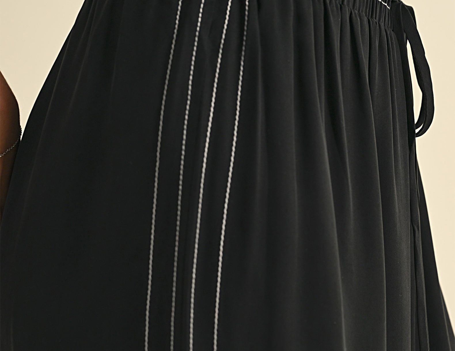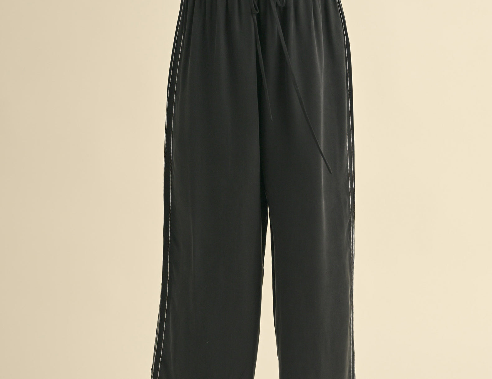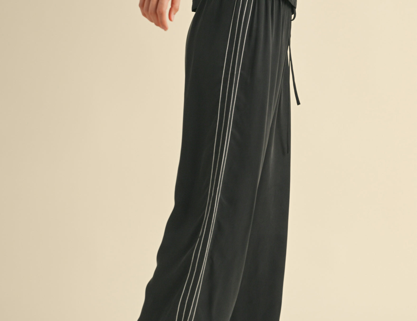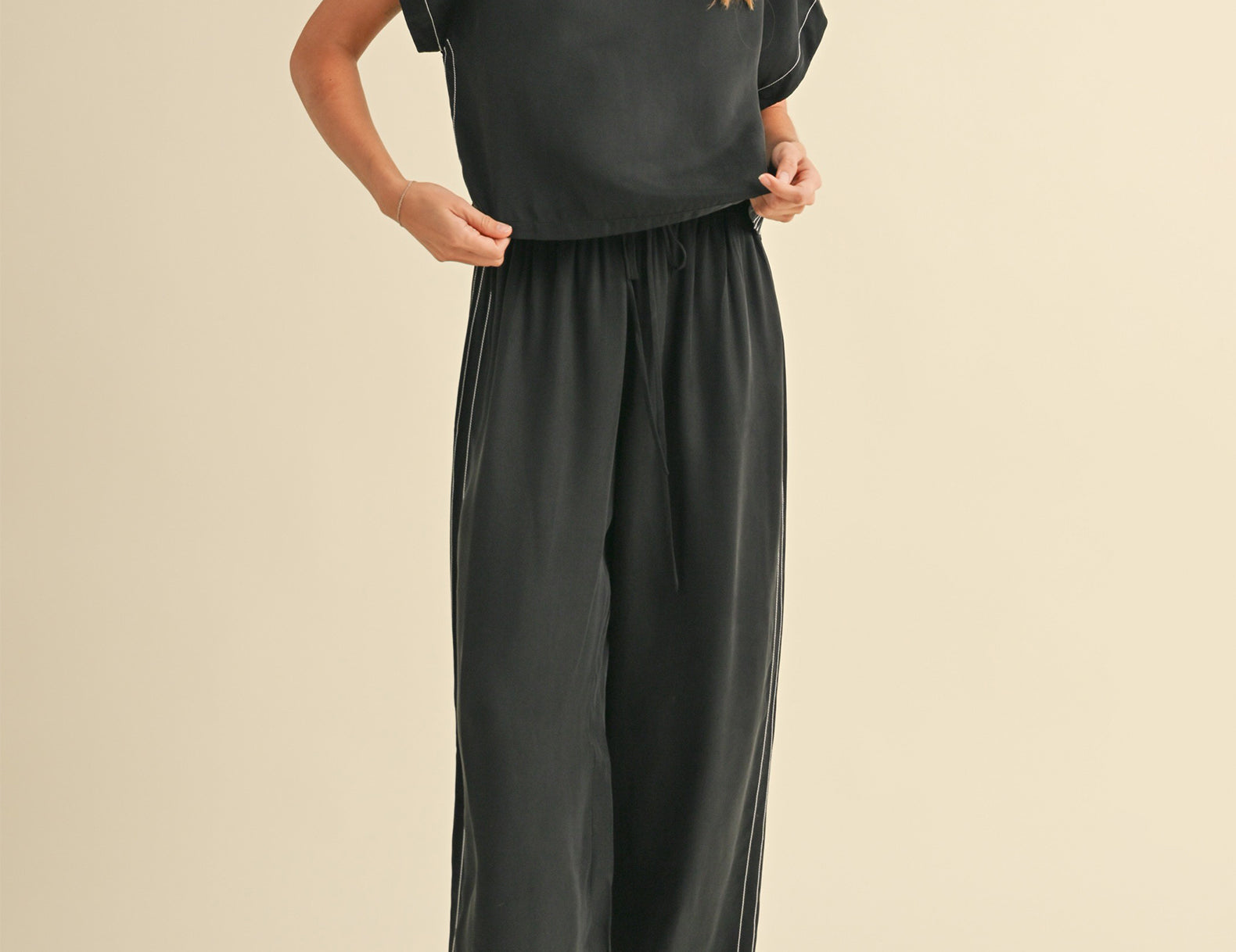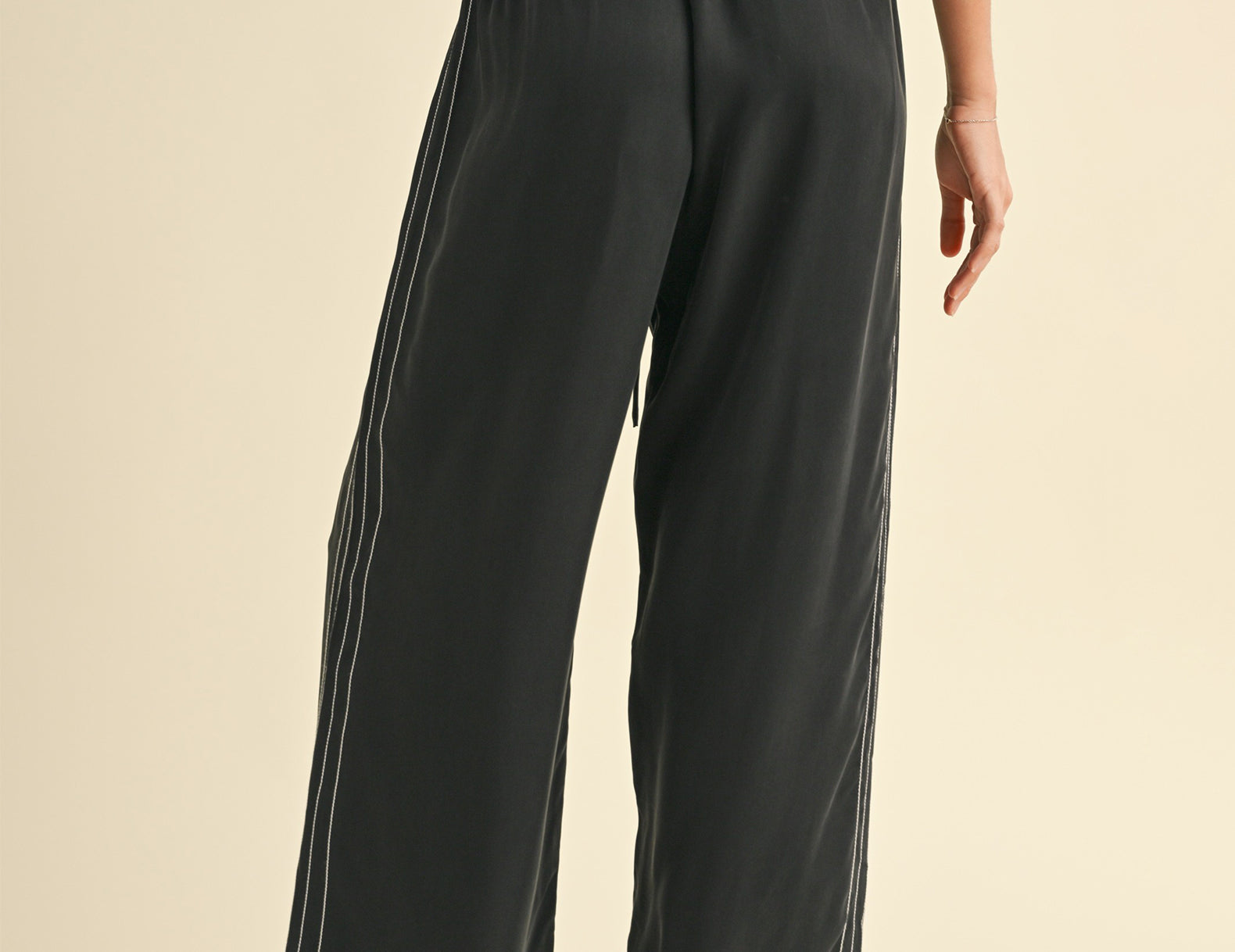 Delightfully soft and so easy to wear in a relaxed, pull-on fit, the Lilah pants hug at the wide, drawstring waist and relax into billowy legs, with an elongated inseam to finish. These pants are cut from a silken, natural black fabric and are accented with cream contrast stitching at the side seams and waist. Pair them with a vintage tee, or for a laid-back set, add the matching Lilah Silken Black Boxy Tee.