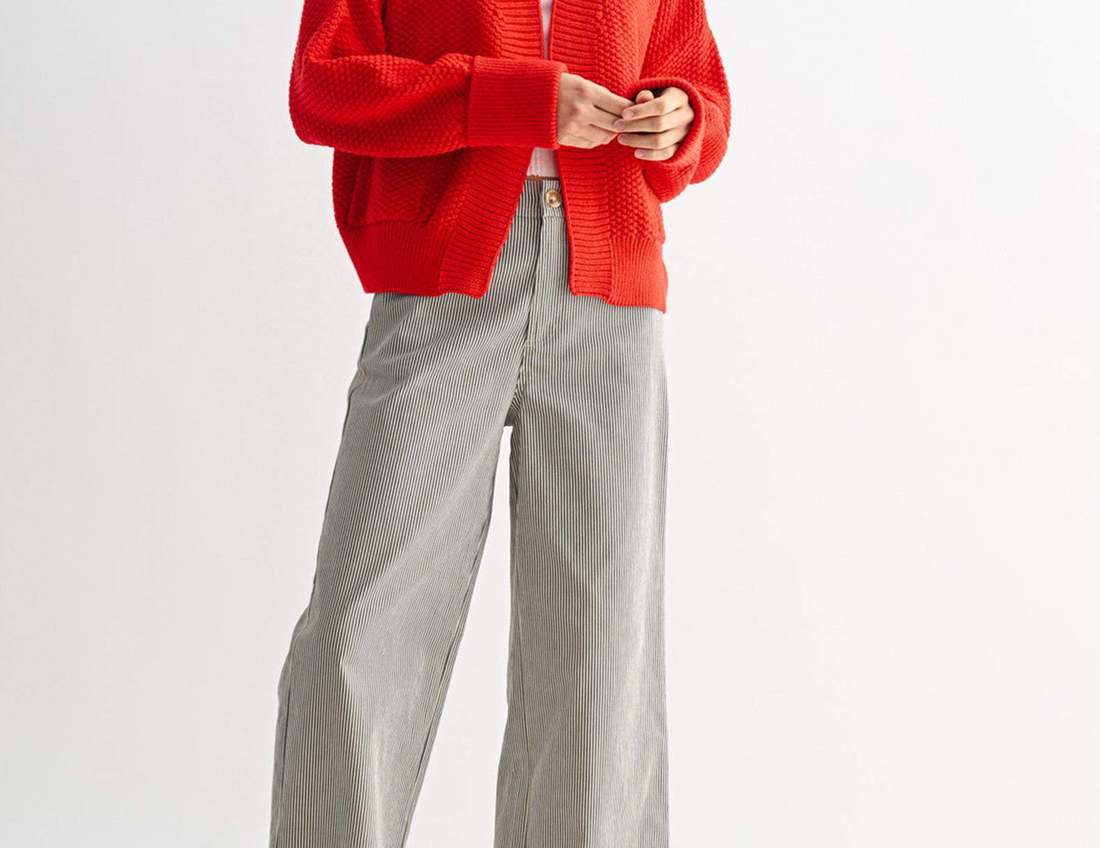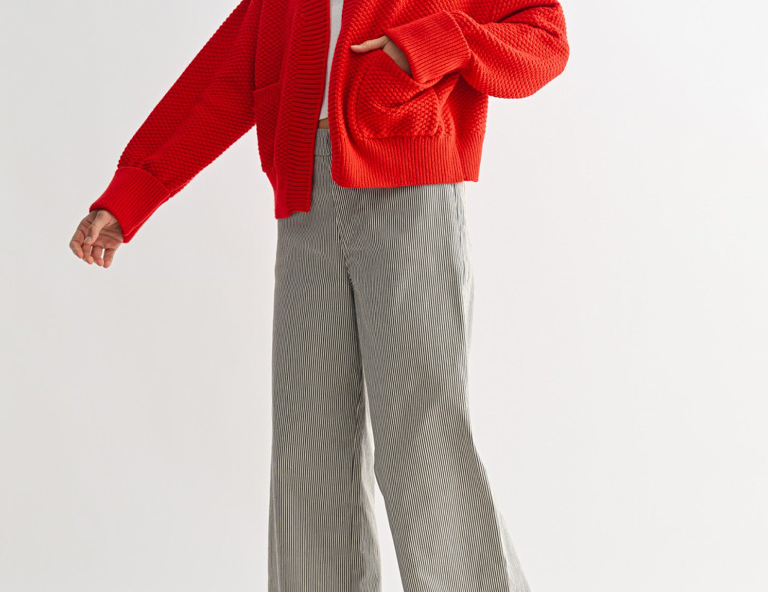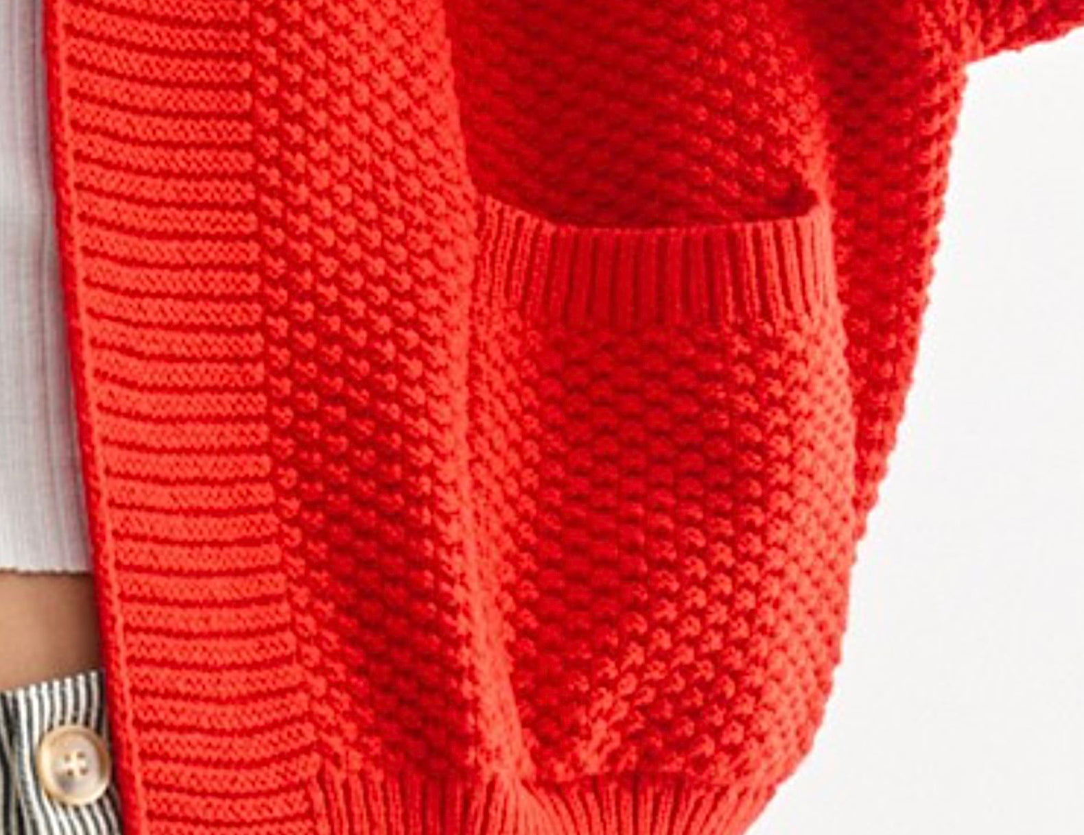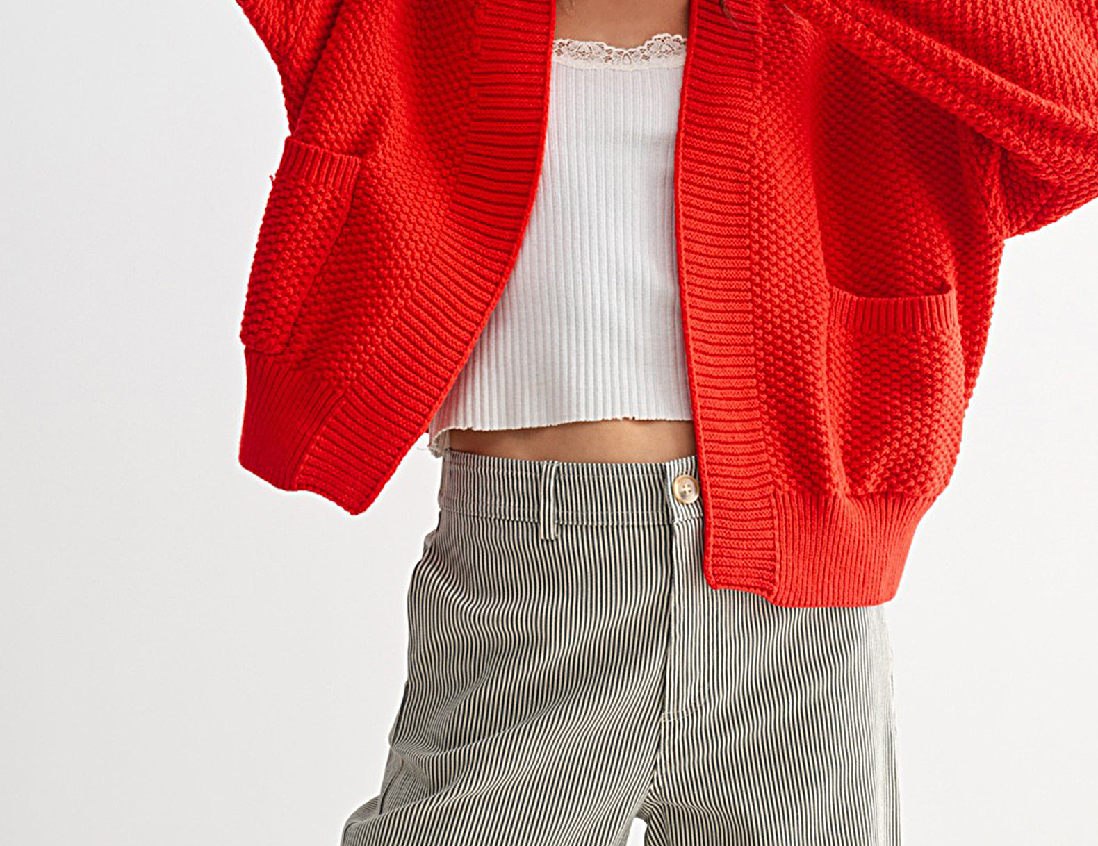 In a mood-boosting cherry apple red, the Lottie cardi is slouchy in an oversized, open-front silhouette with extra-long, cuffed sleeves. Ultra soft and perfectly textured with double patch pockets to finish, try this vibrant knit with cargo pants and a tee, or toss it over a floral dress for a playful finish.