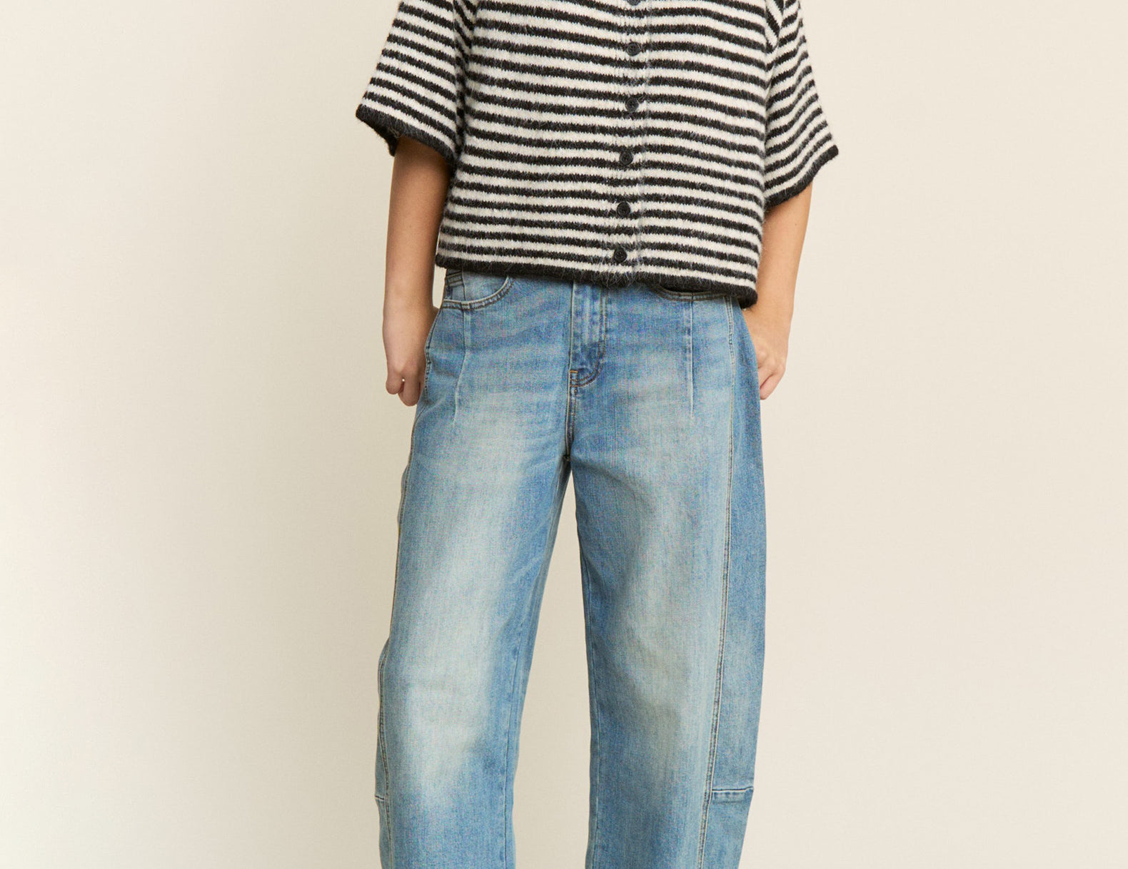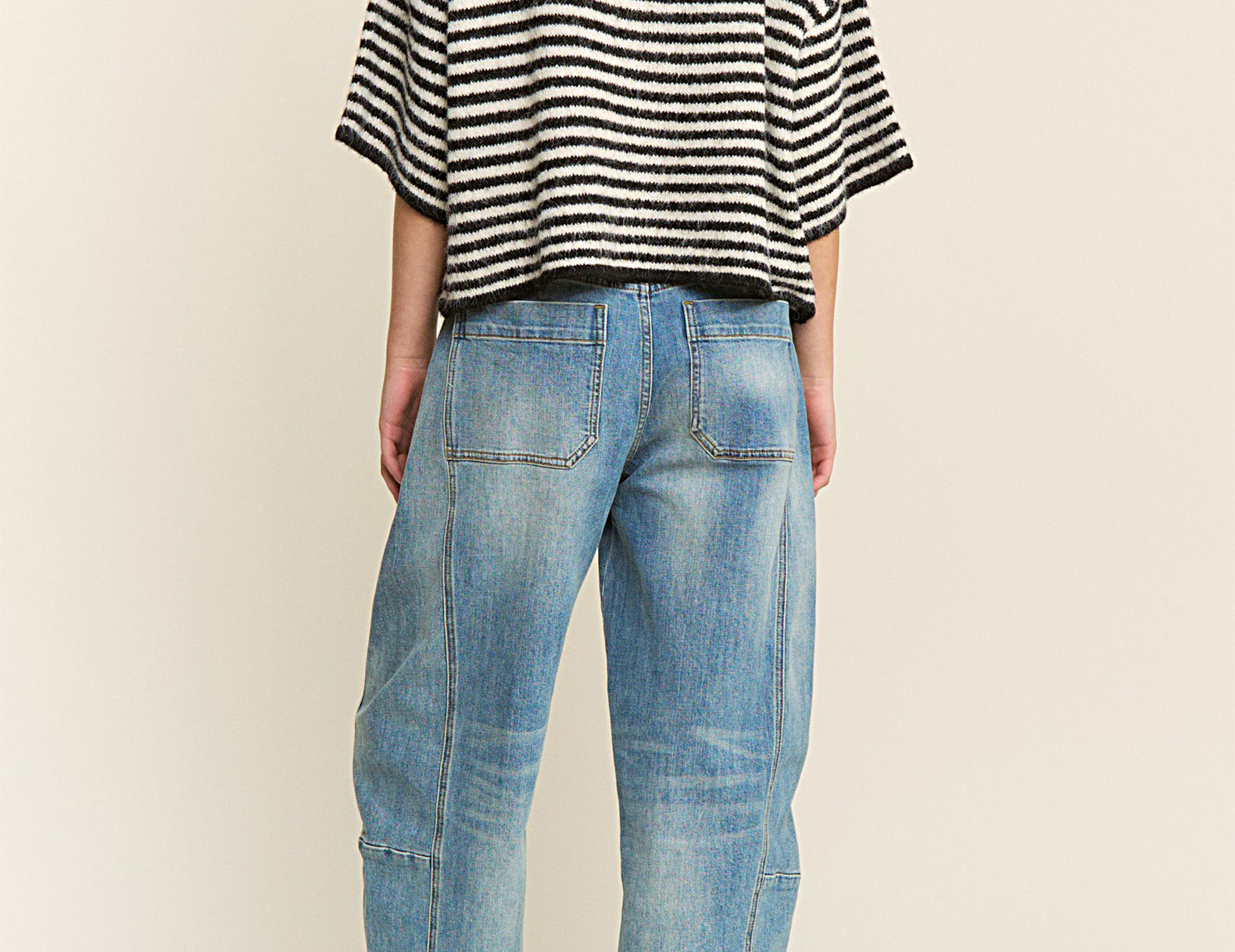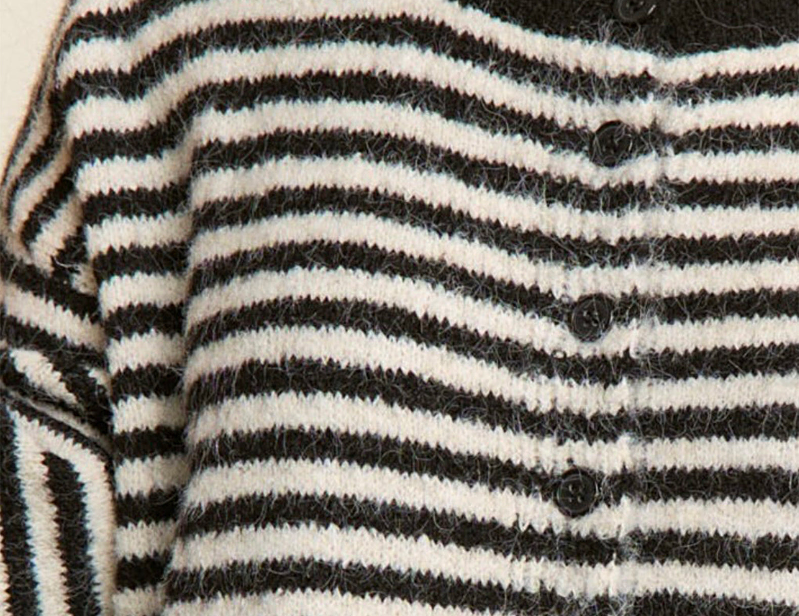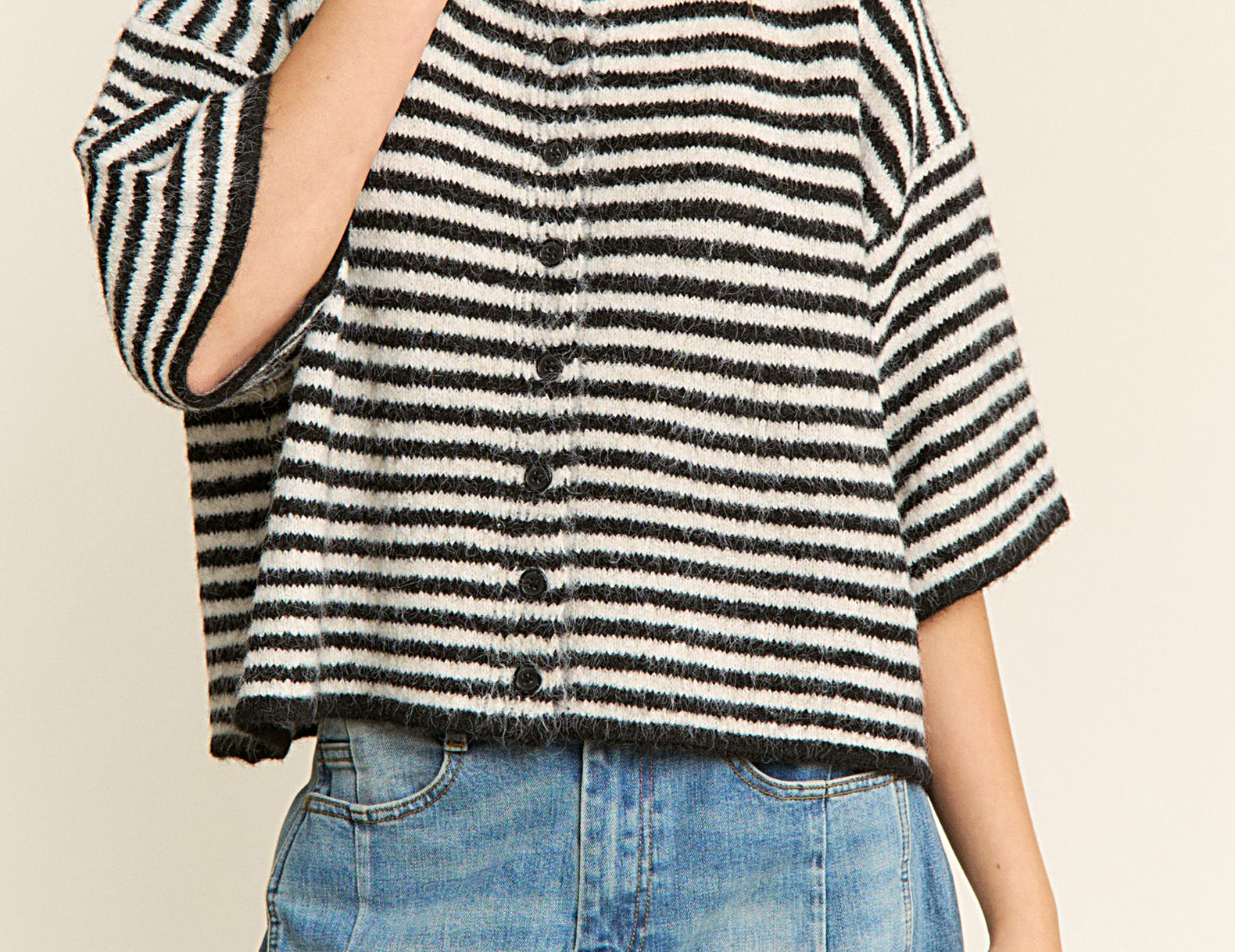 Classic in black-and-white stripes, the Lou sweater is updated with a boxy silhouette, quarter-length sleeves, and a hip-grazing hem. It's done in a lightweight, ultra-soft and plush knit with plenty of give. The scooped neckline and hem are trimmed in black. Pair this easy sweater with black balloon pants and your favorite sneakers.
